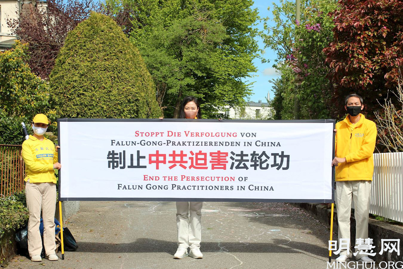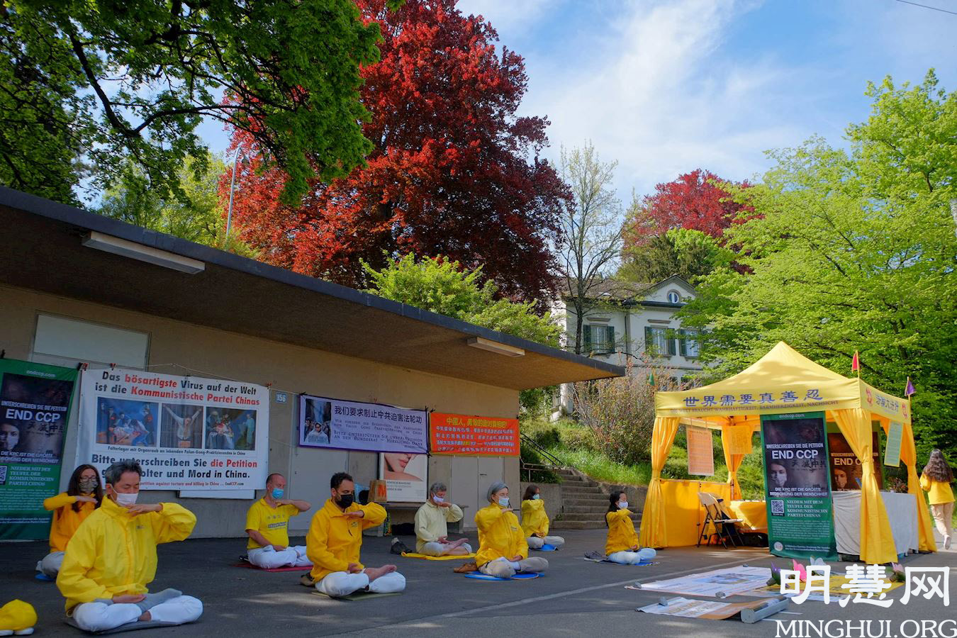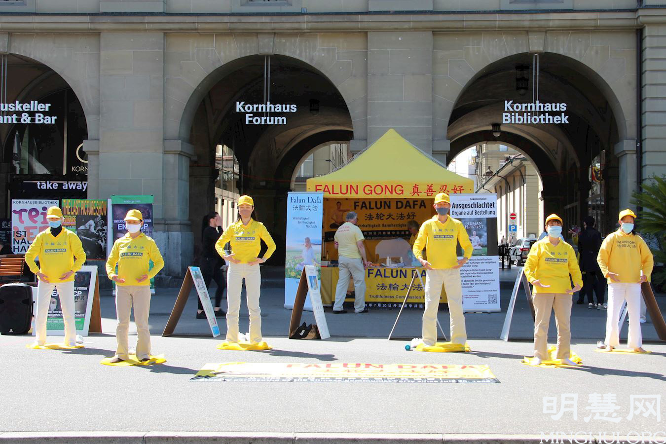 二零二一年五月八日,瑞士法轮功学员分别来到伯尔尼的中使馆前、控豪斯(Kornhaus)广场及苏黎世的中领馆附近举办活动。他们通过扬声器向民众介绍即将到来的世界法轮大法日,同时也告诉民众,二十二年来只有在中国——法轮大法的发源地——无法举办大型的庆祝活动,并揭露中共迫害法轮功学员的种种罪行。