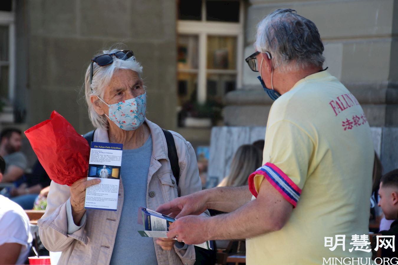 很多路人惊讶于熙熙攘攘中演示功法的学员的那份祥和、平静,驻足观看。一位瑞士老人汉斯(Heinz)特意停住自行车,静静的看着学员炼功,并表示:“从这里(法轮功学员炼功的场景)我看到了和平及自由,这是我们地球上最该拥有的。”也有很多人在了解真相后签名支持法轮功学员,还有些人临走前带上更多的资料,帮助传播真相。