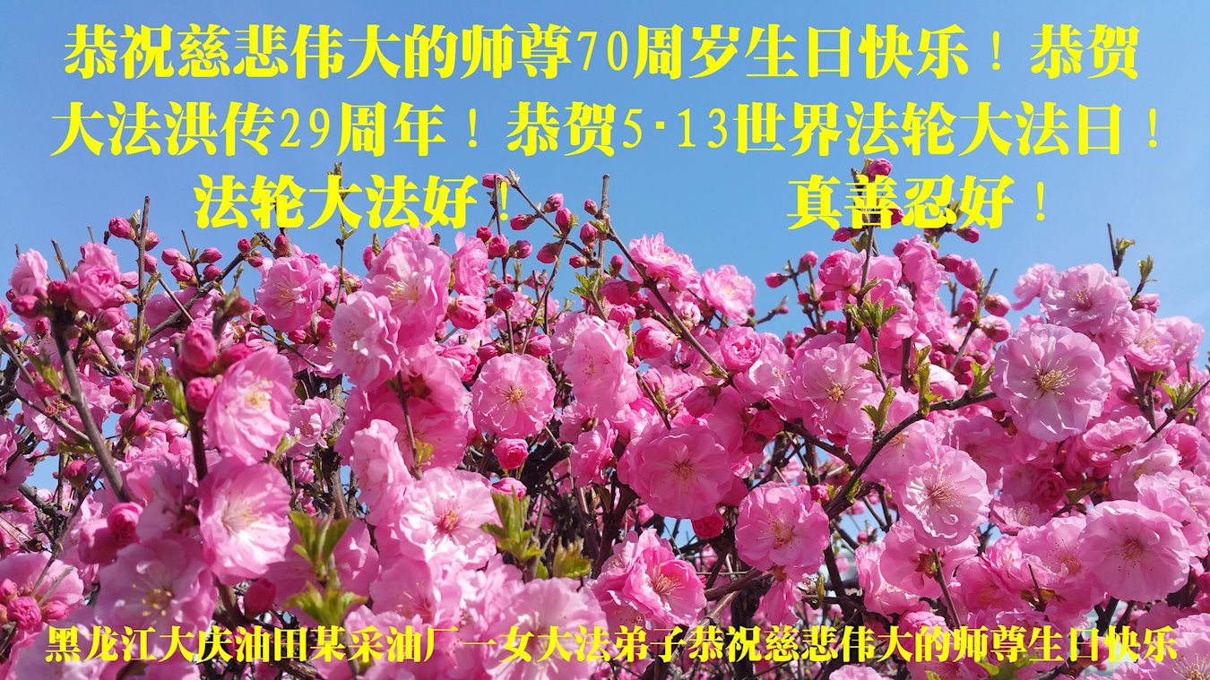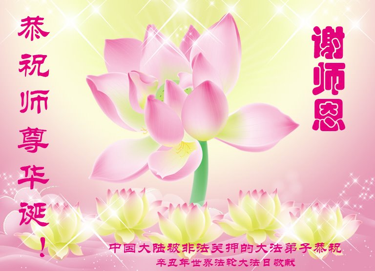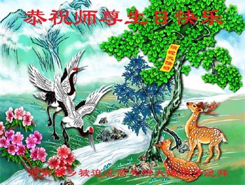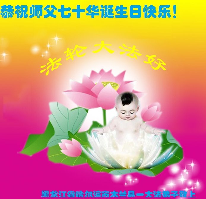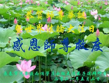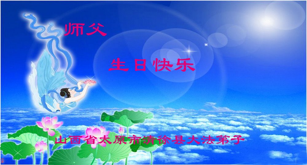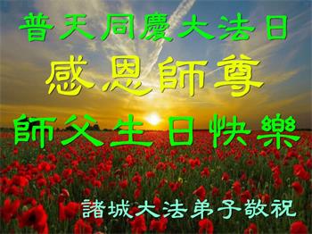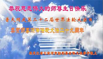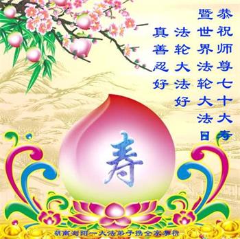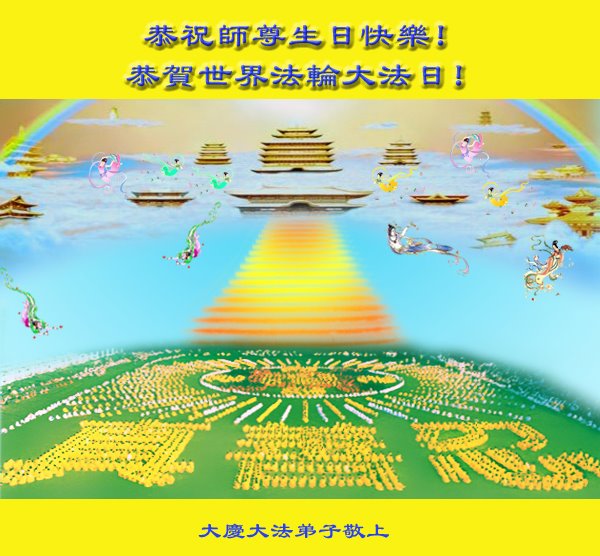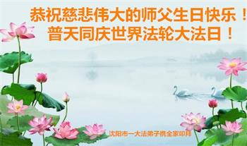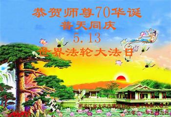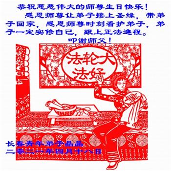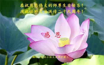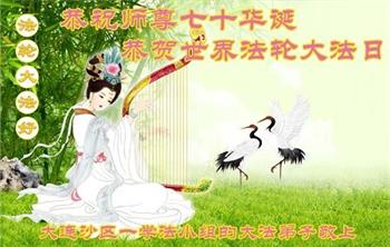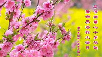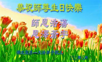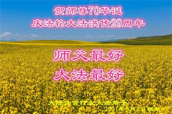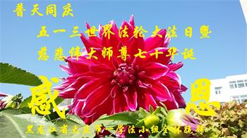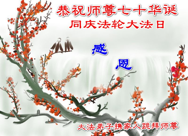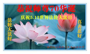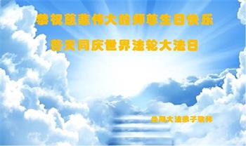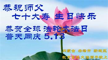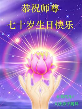 师尊好!师尊辛苦了!今年是伟大慈悲的师尊七十岁华诞,也是法轮大法日。在这普天同庆同颂的伟大光辉日子里,我们怀着无比感恩的心情,热泪泉涌,发自肺腑的一遍又一遍的颂唱着“法轮大法好”、“师恩颂”美好的歌曲,讴歌师尊威德无量、法力无边、叩谢师尊的慈悲苦度!