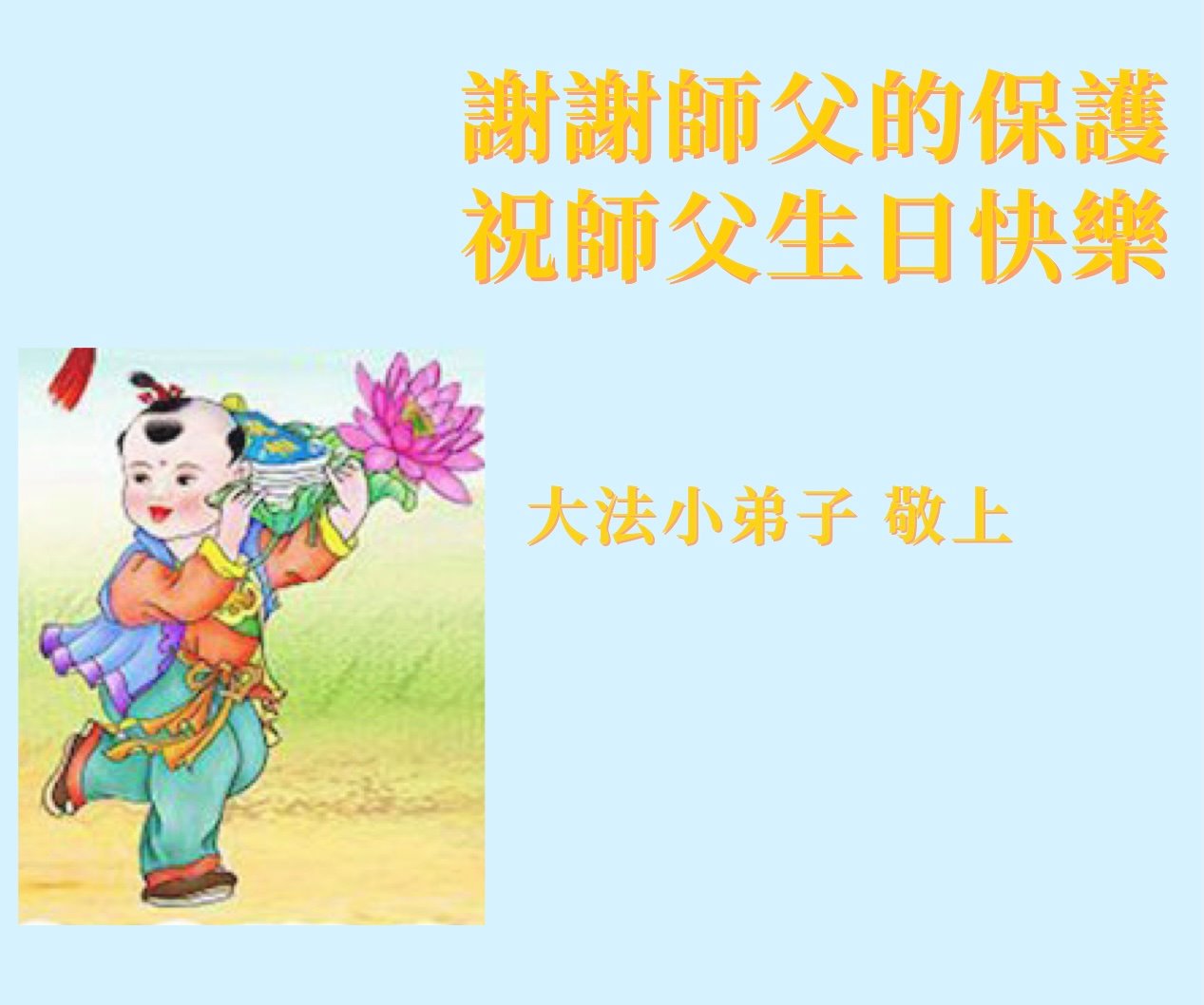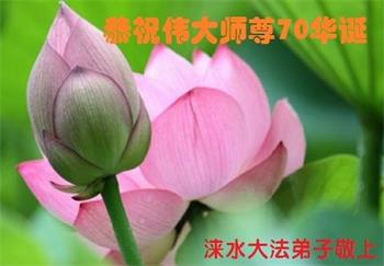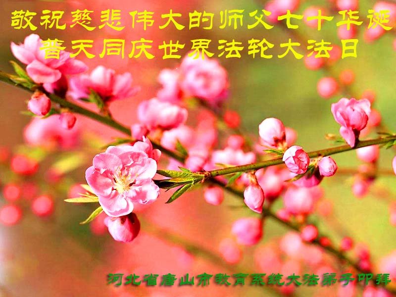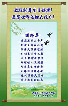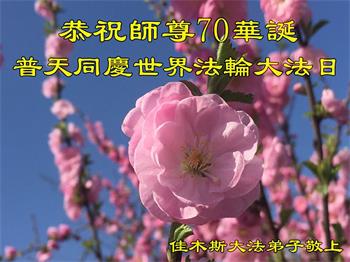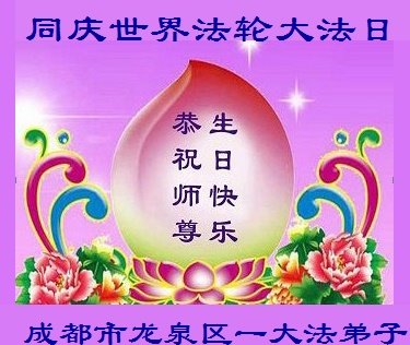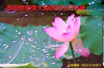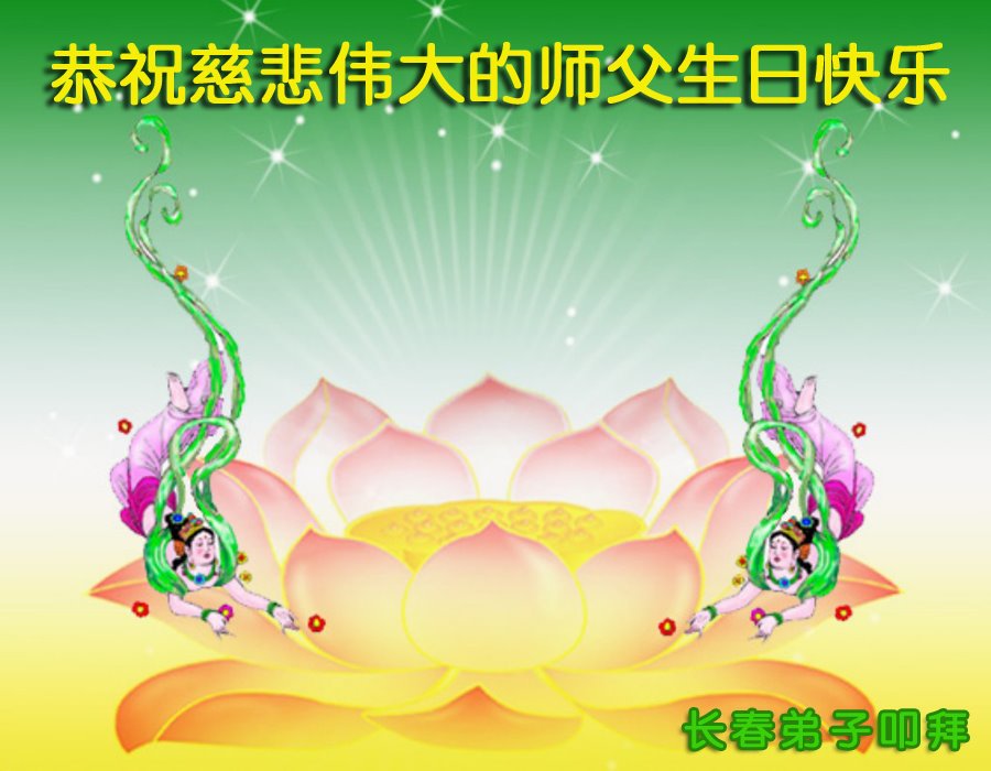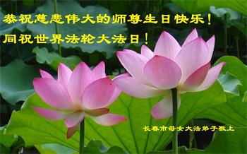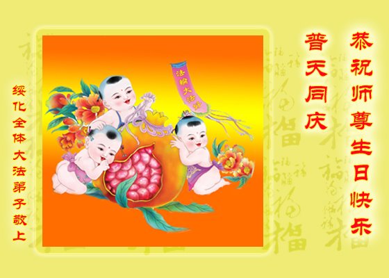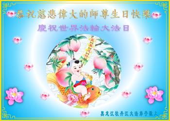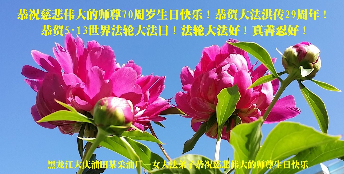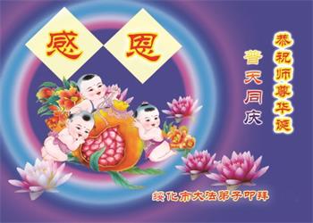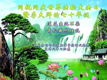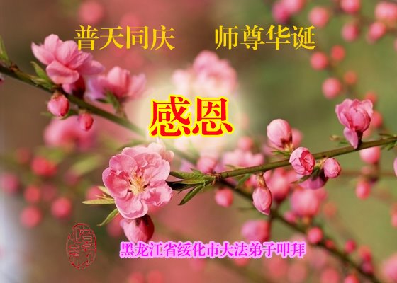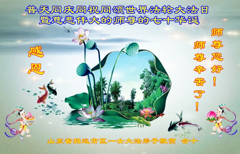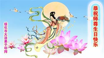 师尊好!师尊辛苦了!今年是伟大慈悲的师尊七十岁华诞,也是法轮大法日。在这普天同庆同颂的伟大光辉日子里,我们怀着无比感恩的心情,热泪泉涌,发自肺腑的一遍又一遍的颂唱着“法轮大法好”、“师恩颂”美好的歌曲,讴歌师尊威德无量、法力无边、叩谢师尊的慈悲苦度!