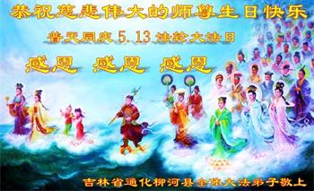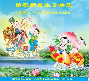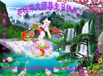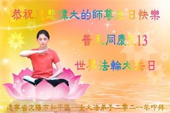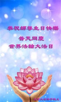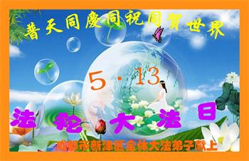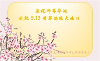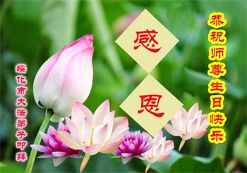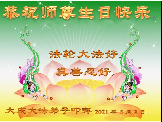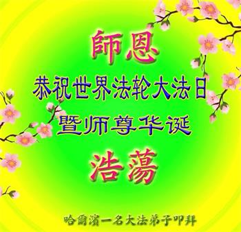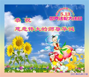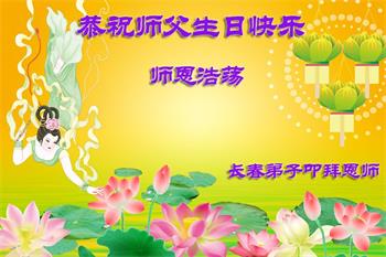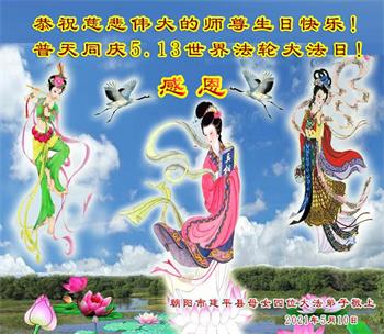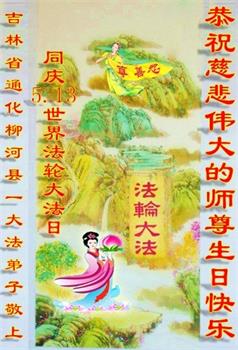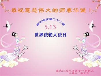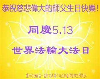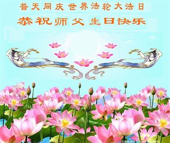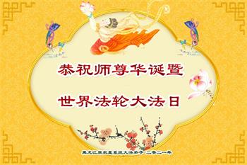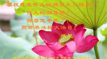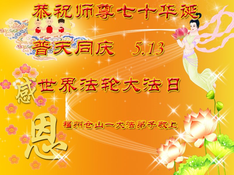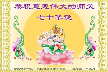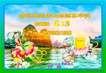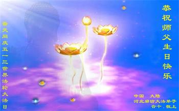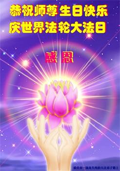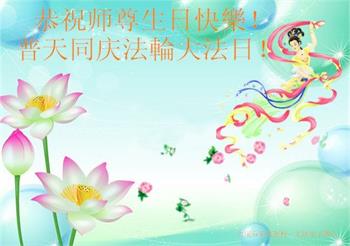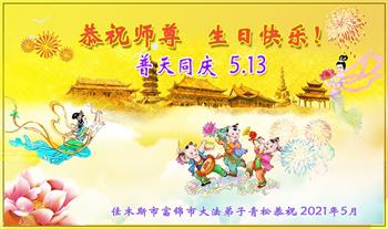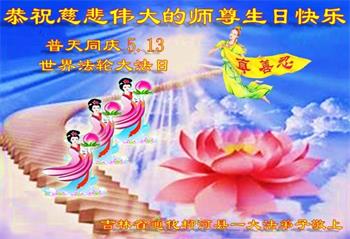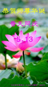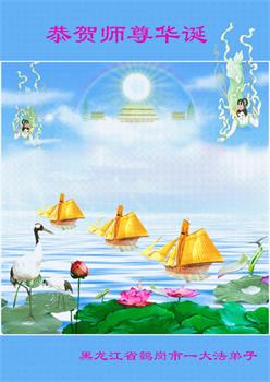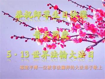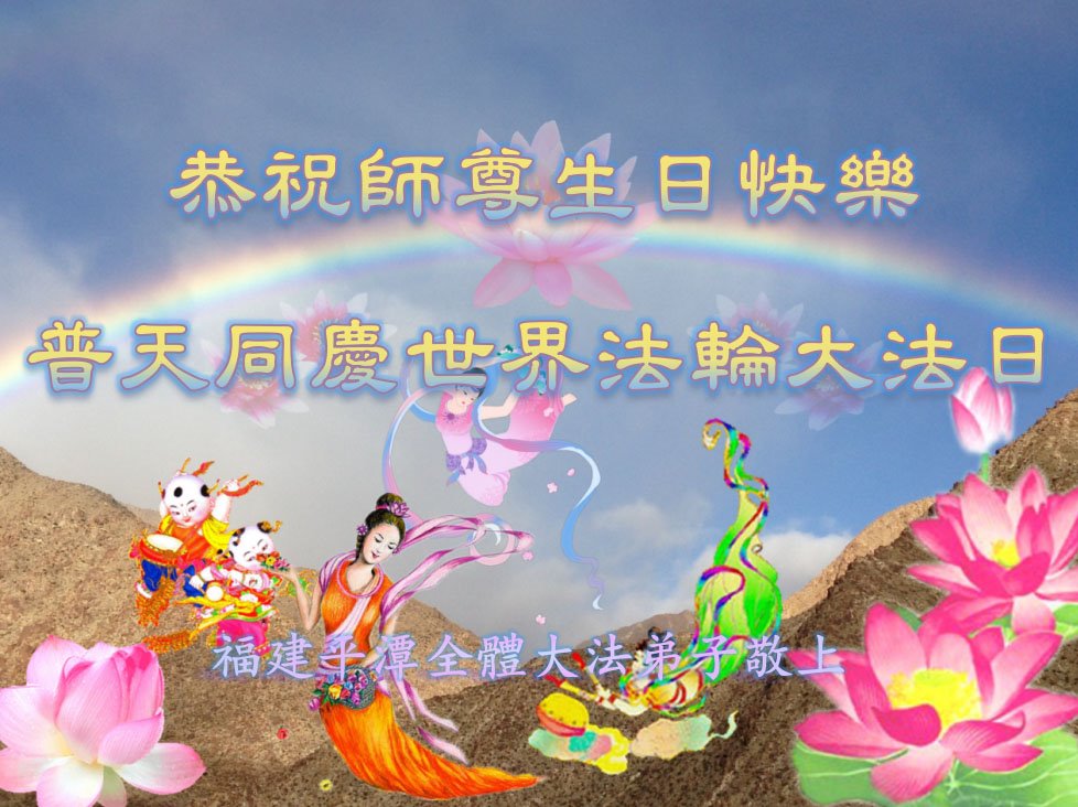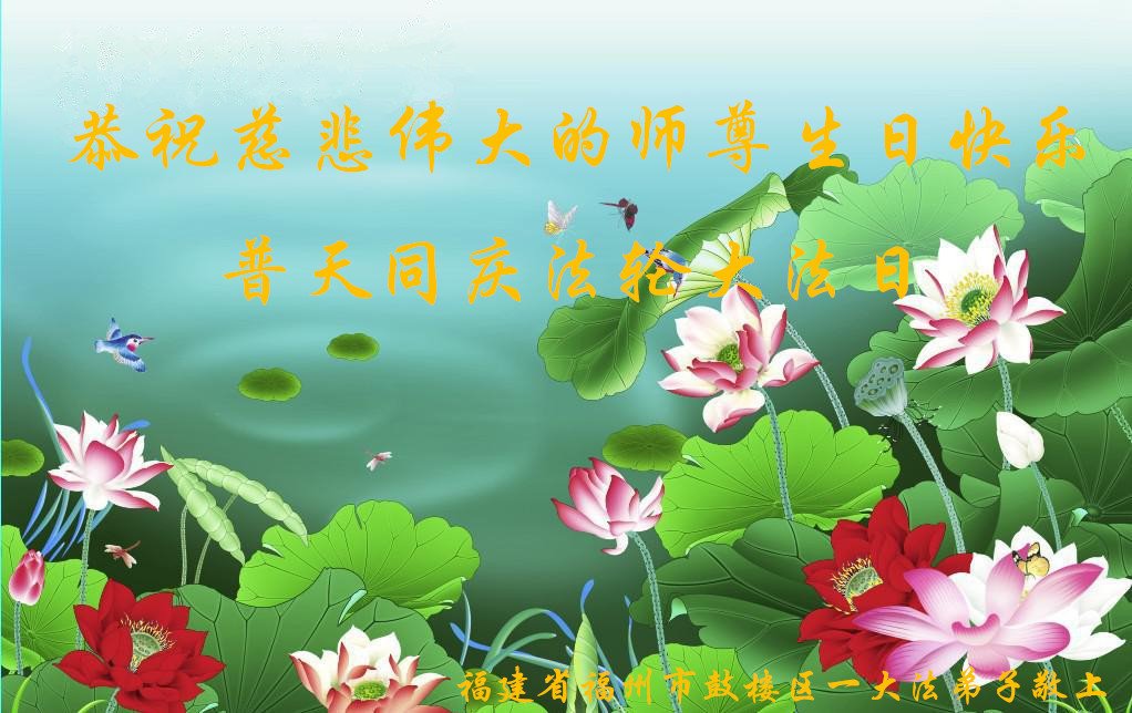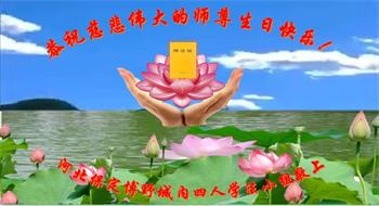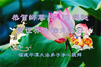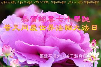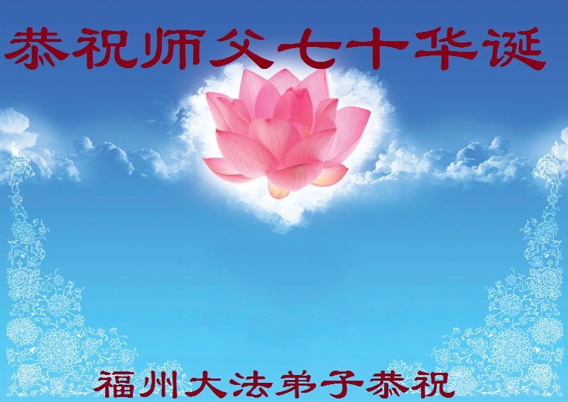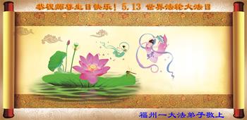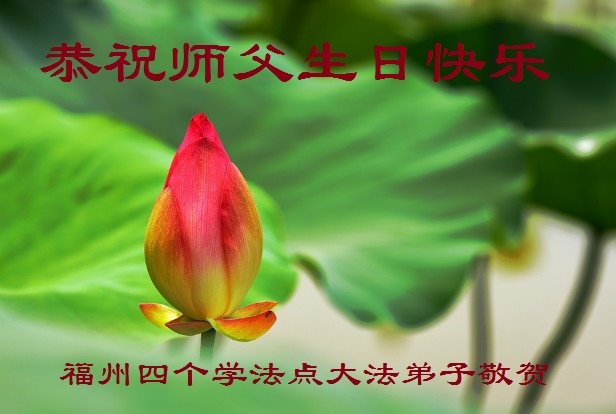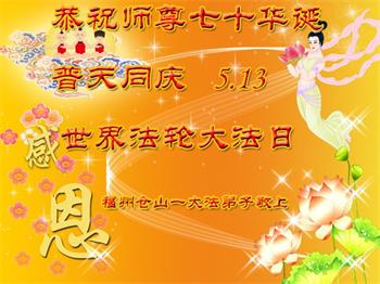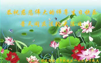 福建省福州市一大法弟子在贺词中说:“弟子双手合十,发自心底的恭祝慈悲伟大的师父华诞!每当5·13这辉煌的日子到来之际,弟子内心都充满对师父的无比感恩和思念。是师父把我脱胎换骨,重塑成一个全新的真我。”