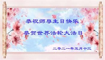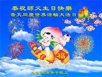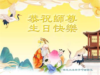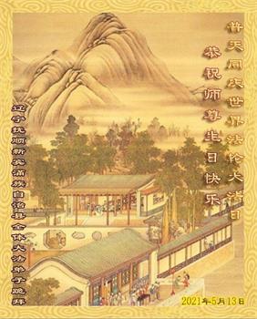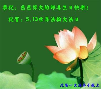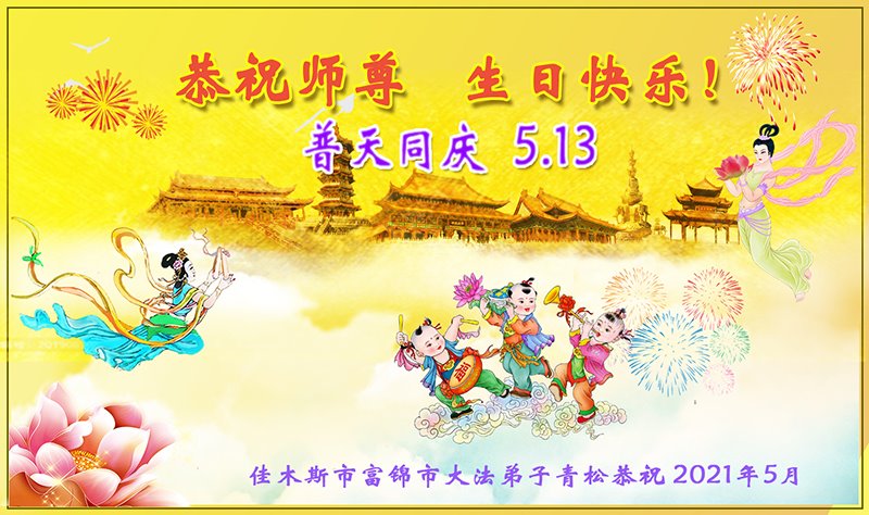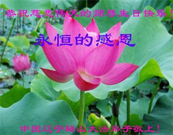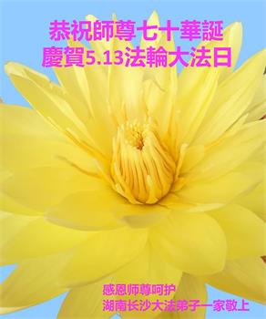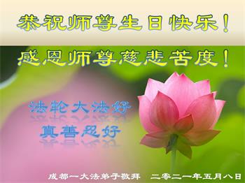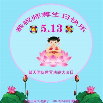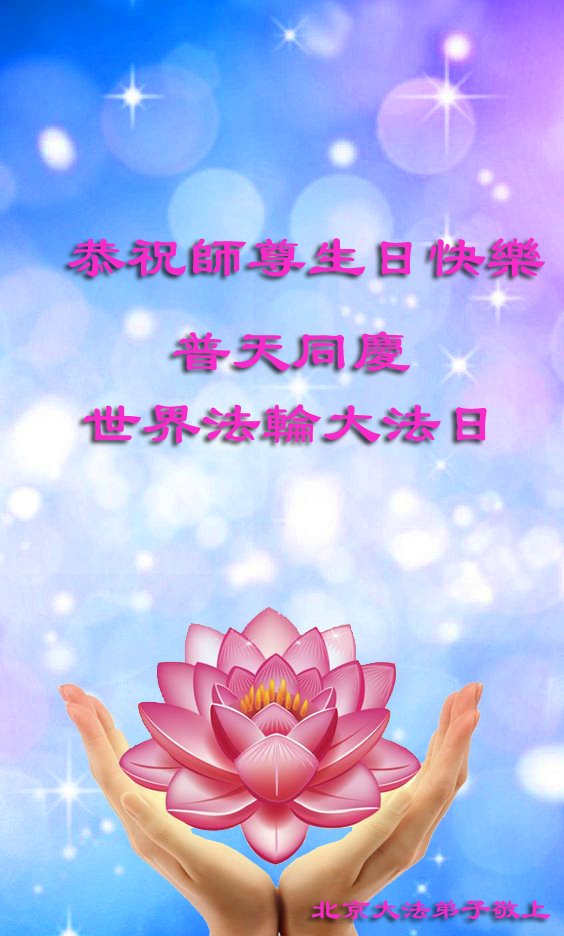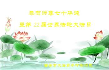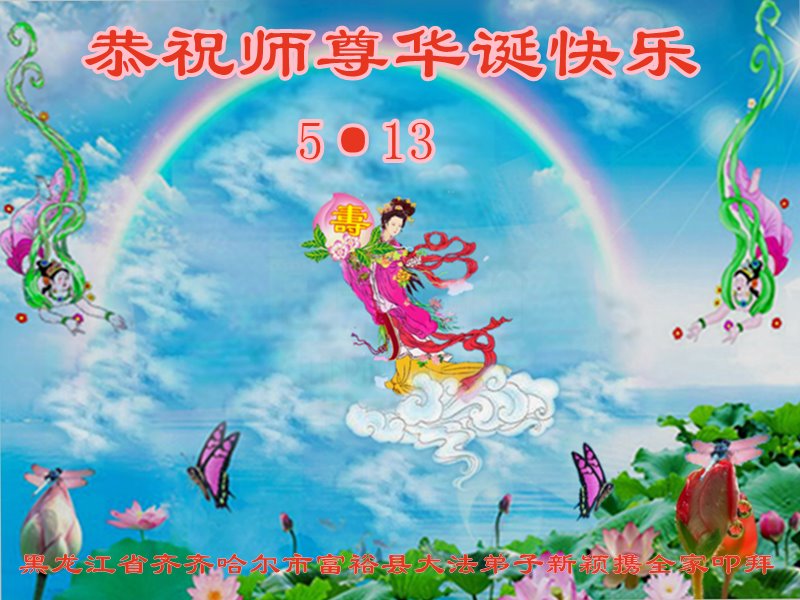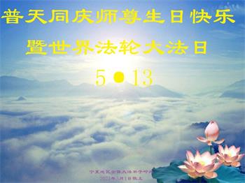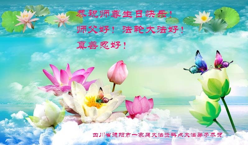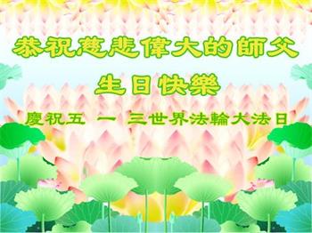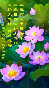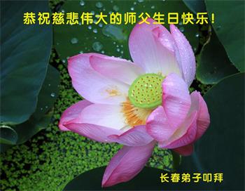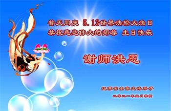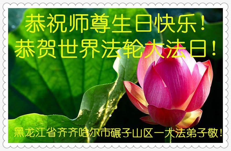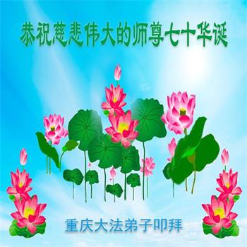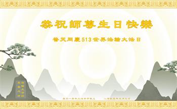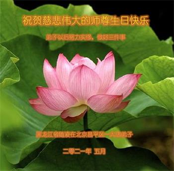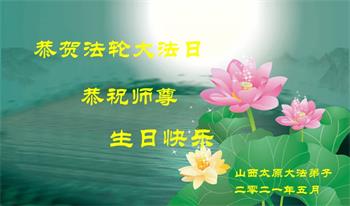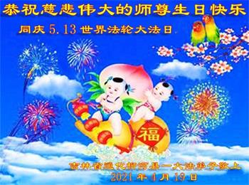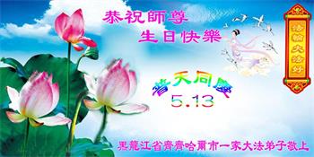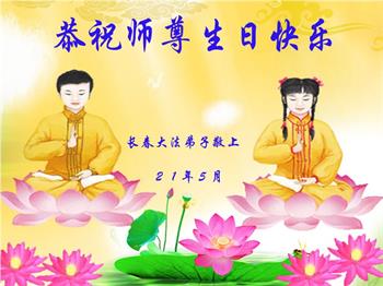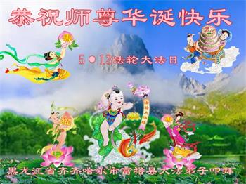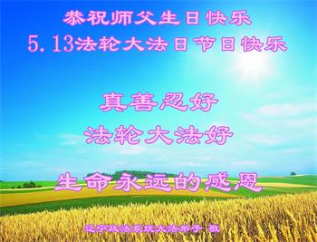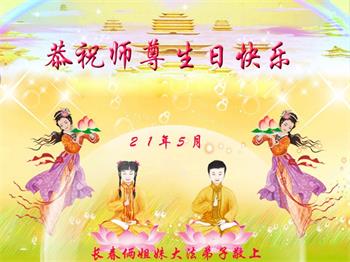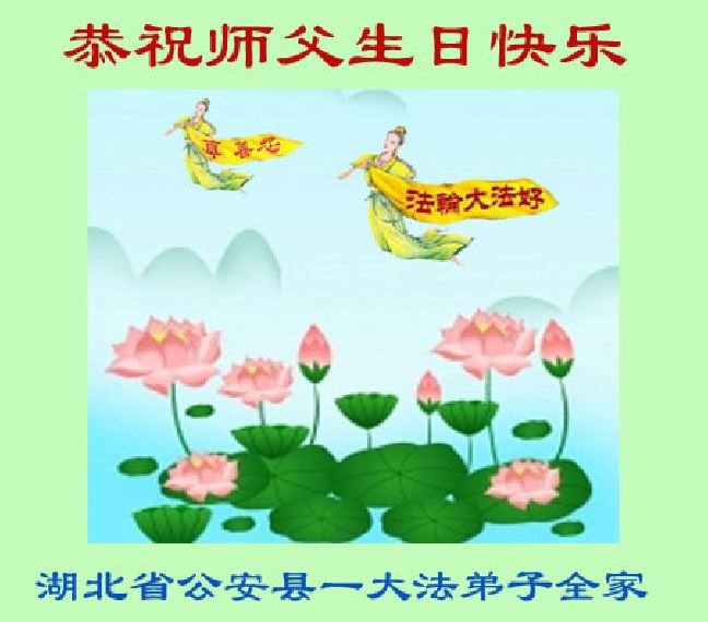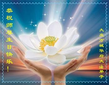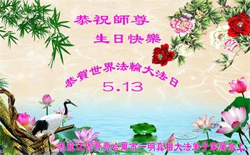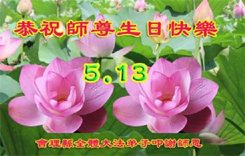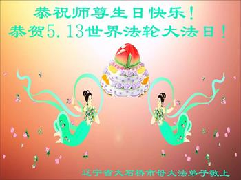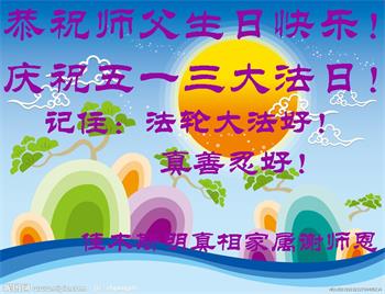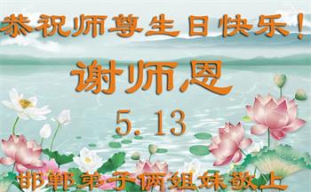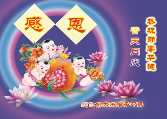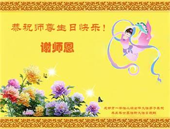 福建省福州市一大法弟子在贺词中说:“弟子双手合十,发自心底的恭祝慈悲伟大的师父华诞!每当5·13这辉煌的日子到来之际,弟子内心都充满对师父的无比感恩和思念。是师父把我脱胎换骨,重塑成一个全新的真我。”