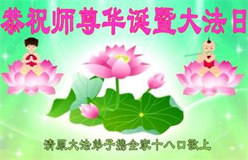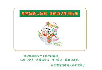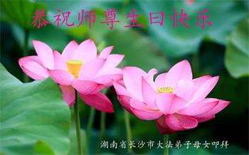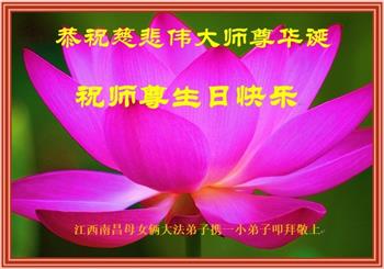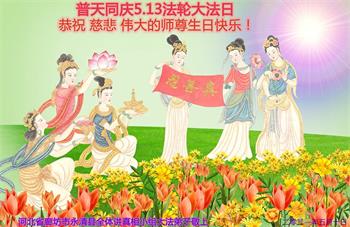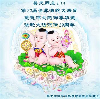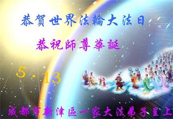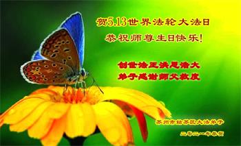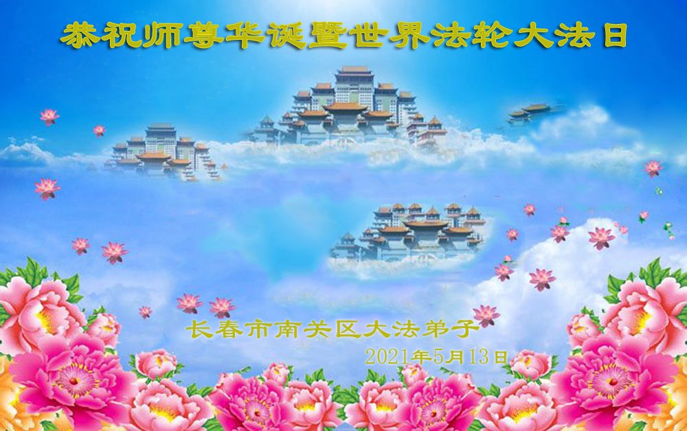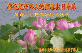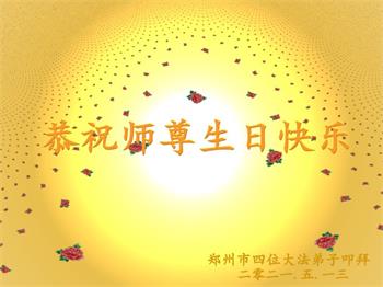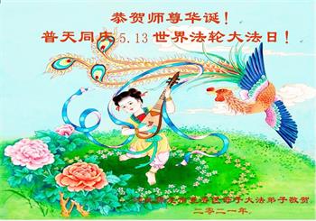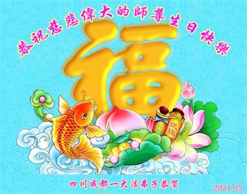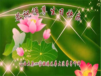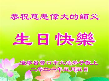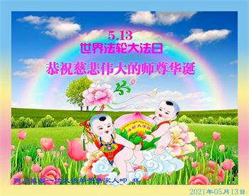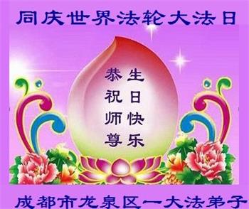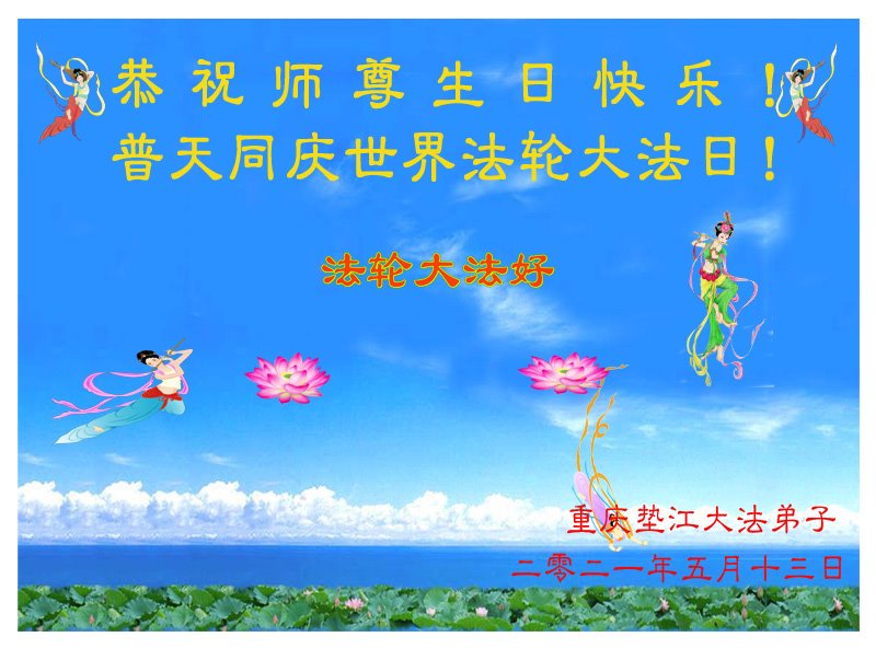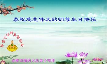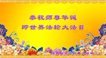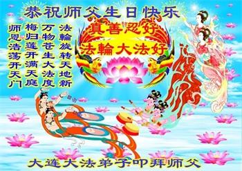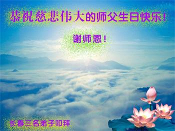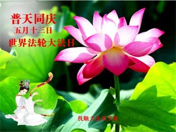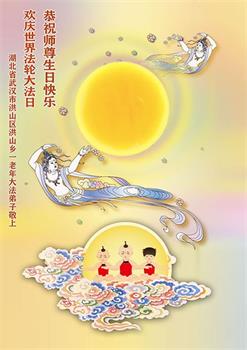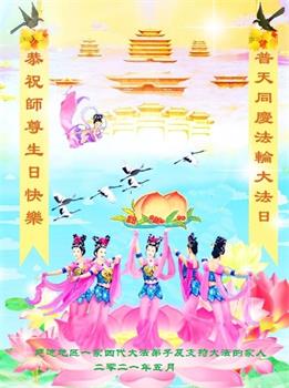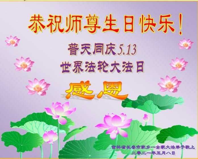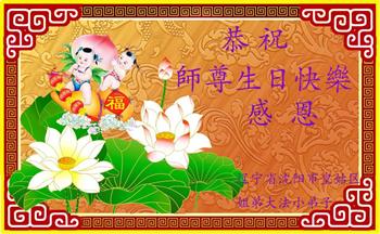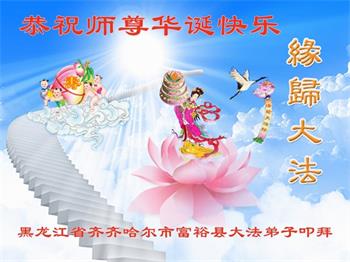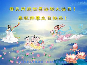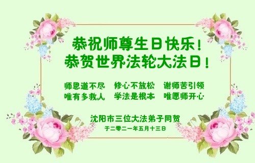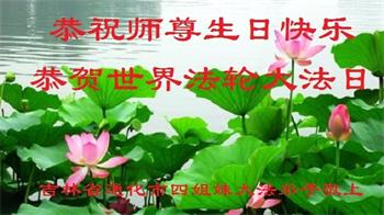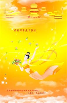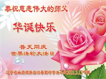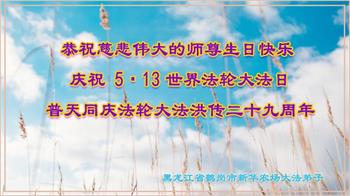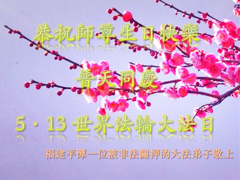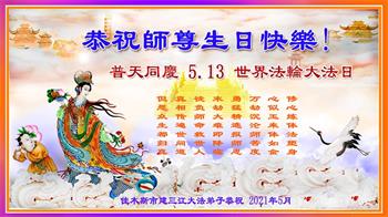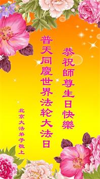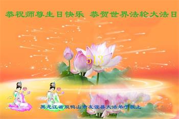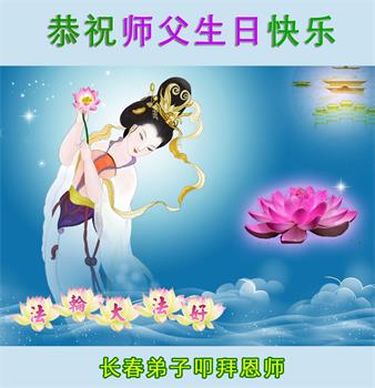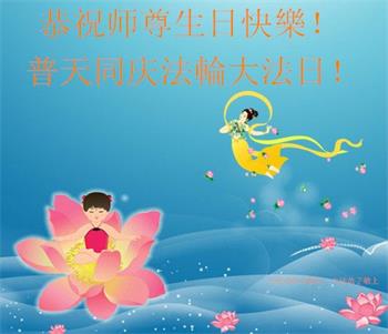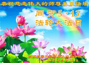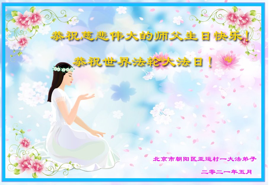 福建省福州市一大法弟子在贺词中说:“弟子双手合十,发自心底的恭祝慈悲伟大的师父华诞!每当5·13这辉煌的日子到来之际,弟子内心都充满对师父的无比感恩和思念。是师父把我脱胎换骨,重塑成一个全新的真我。”