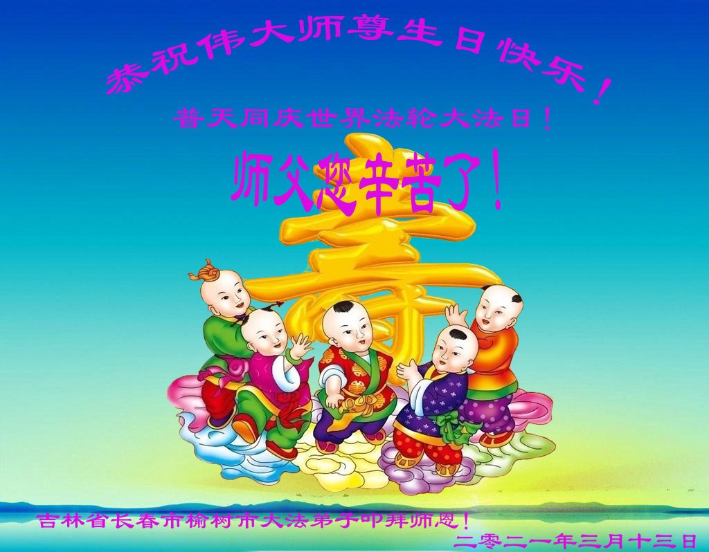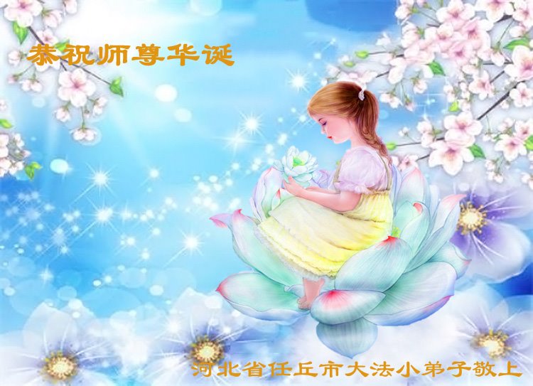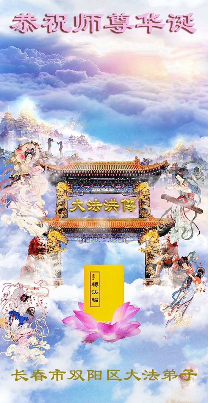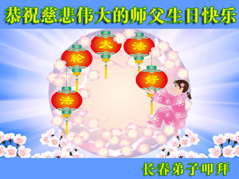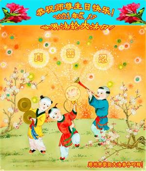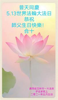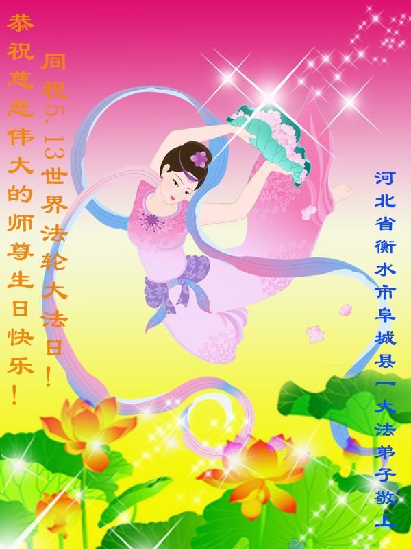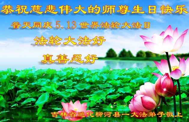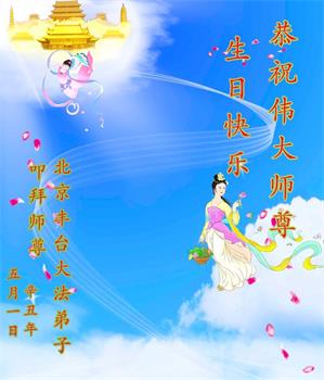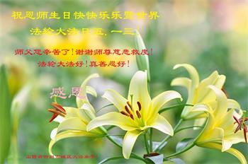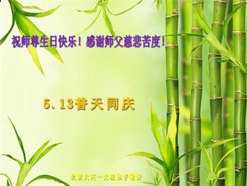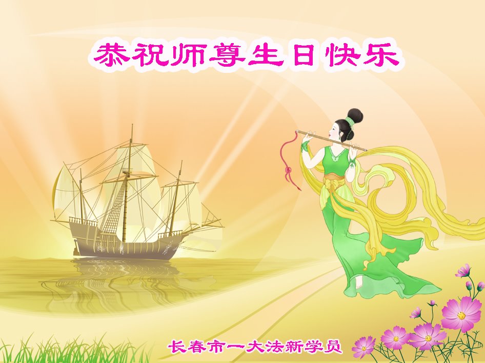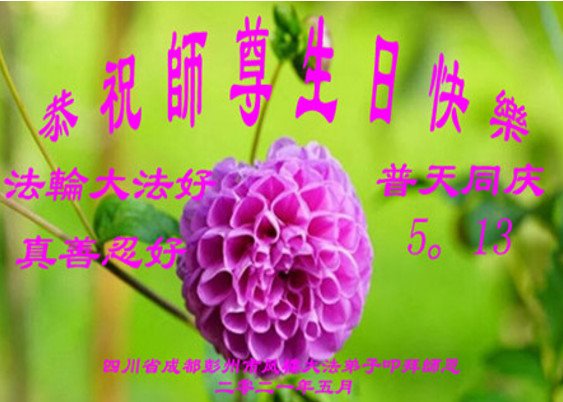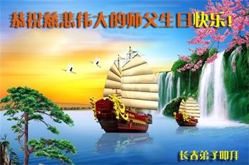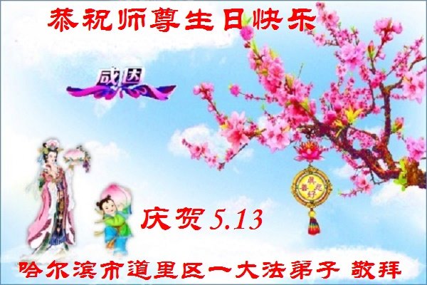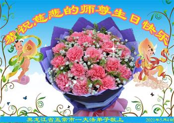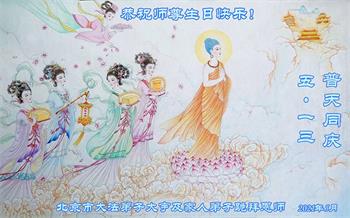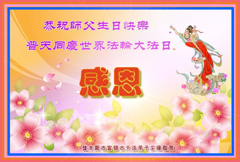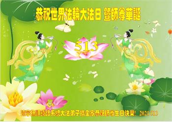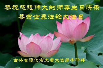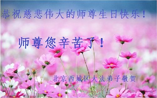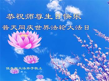 福建省福州市一大法弟子在贺词中说:“弟子双手合十,发自心底的恭祝慈悲伟大的师父华诞!每当5·13这辉煌的日子到来之际,弟子内心都充满对师父的无比感恩和思念。是师父把我脱胎换骨,重塑成一个全新的真我。”