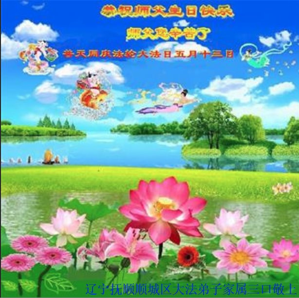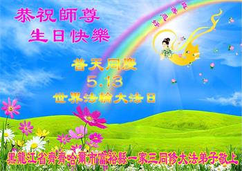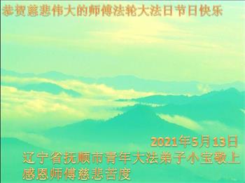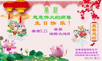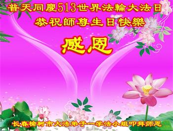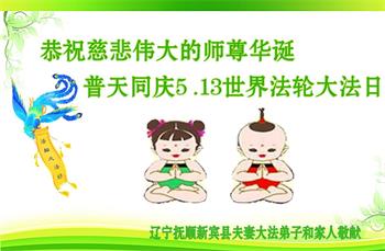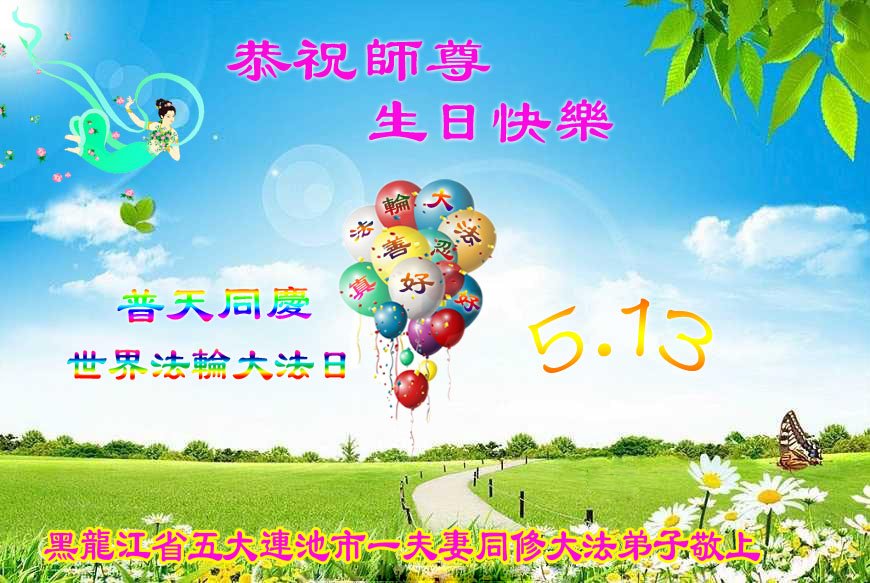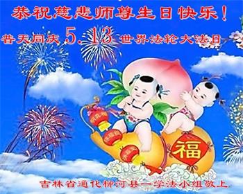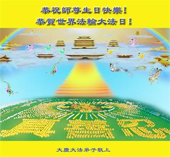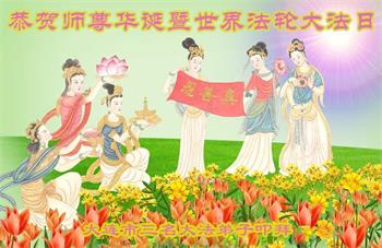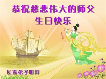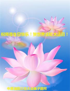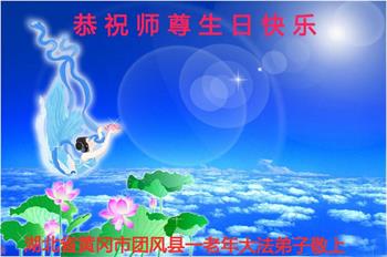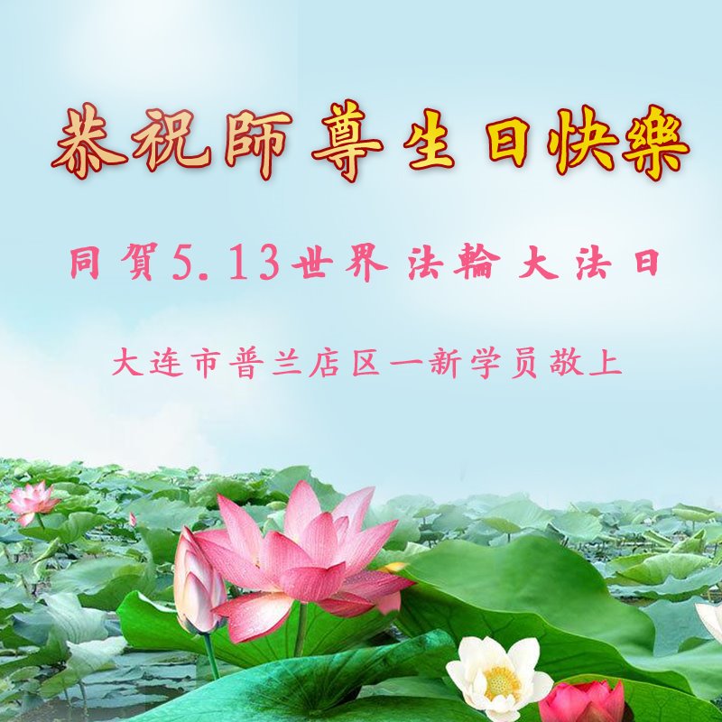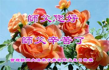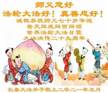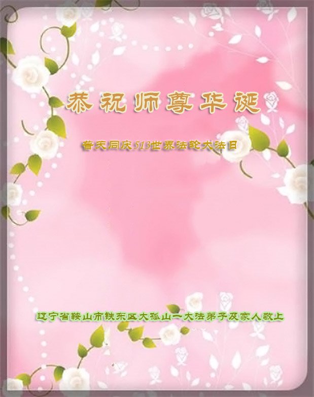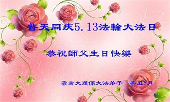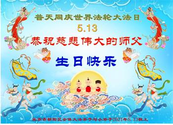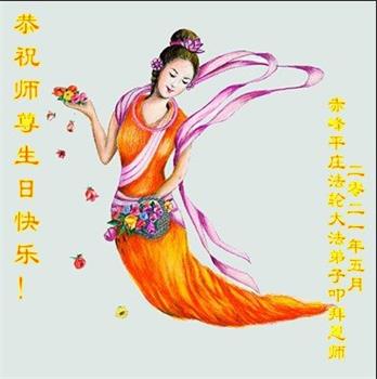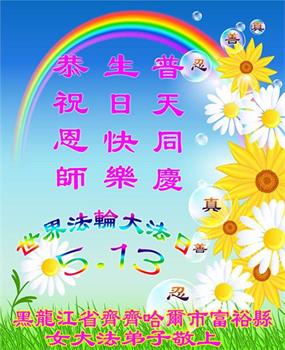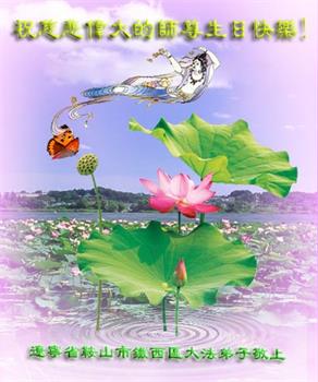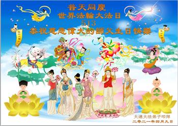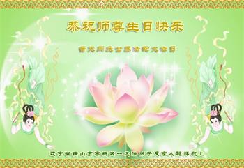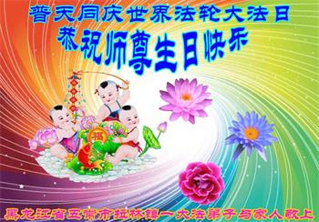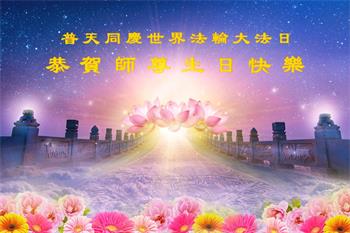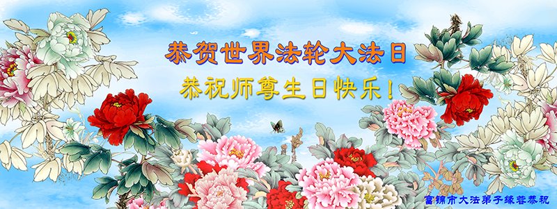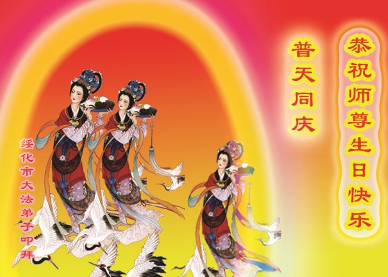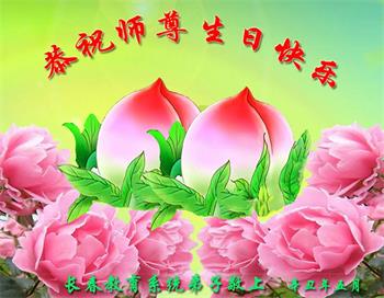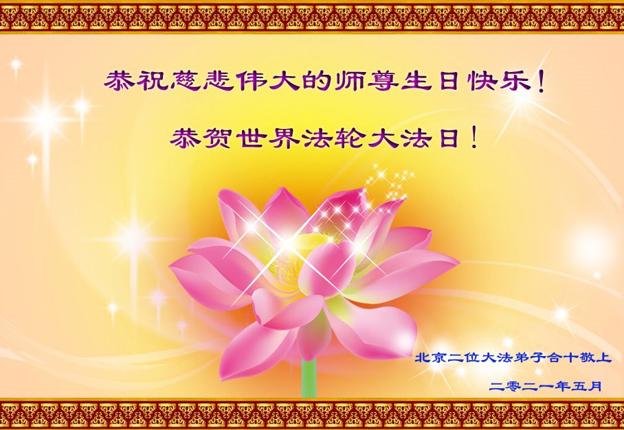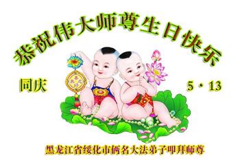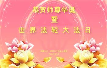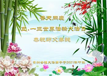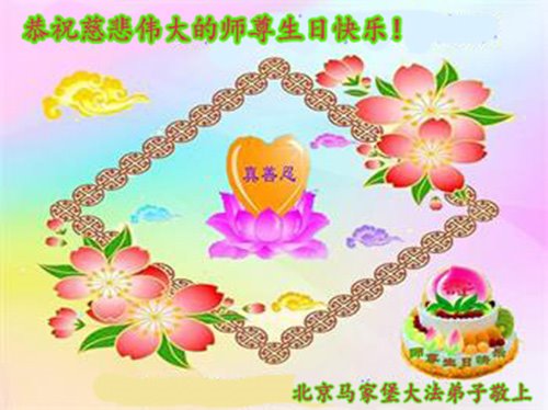 福建省福州市一大法弟子在贺词中说:“弟子双手合十,发自心底的恭祝慈悲伟大的师父华诞!每当5·13这辉煌的日子到来之际,弟子内心都充满对师父的无比感恩和思念。是师父把我脱胎换骨,重塑成一个全新的真我。”