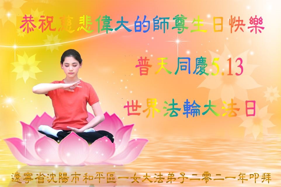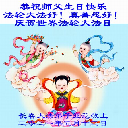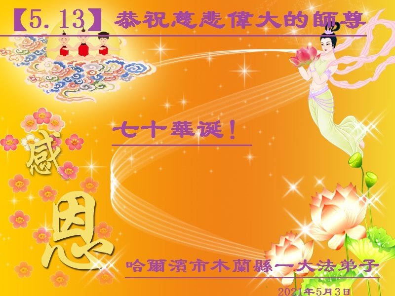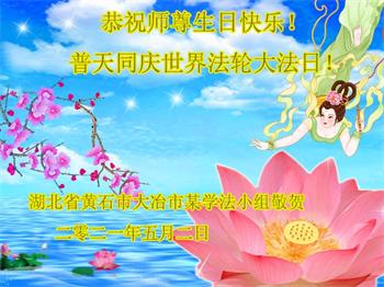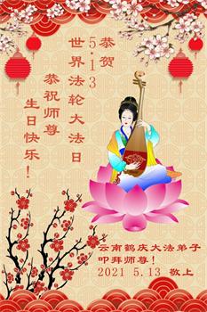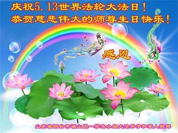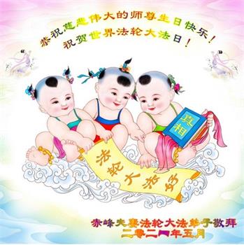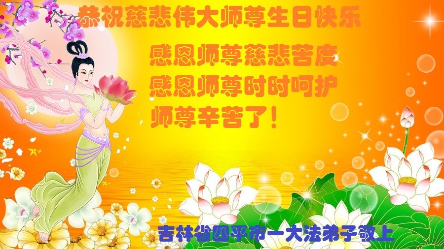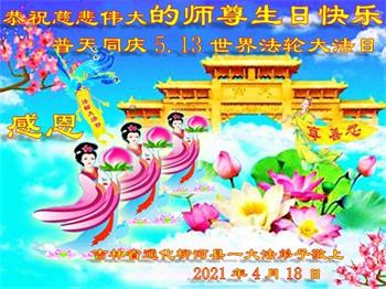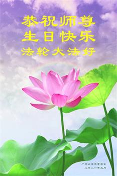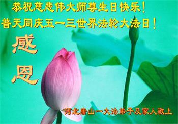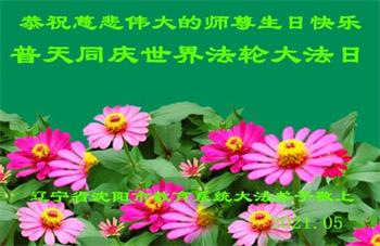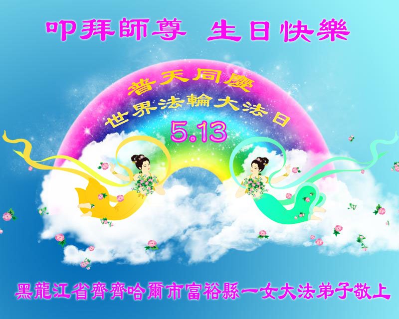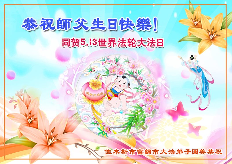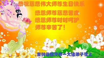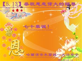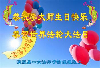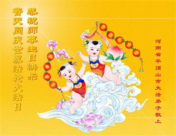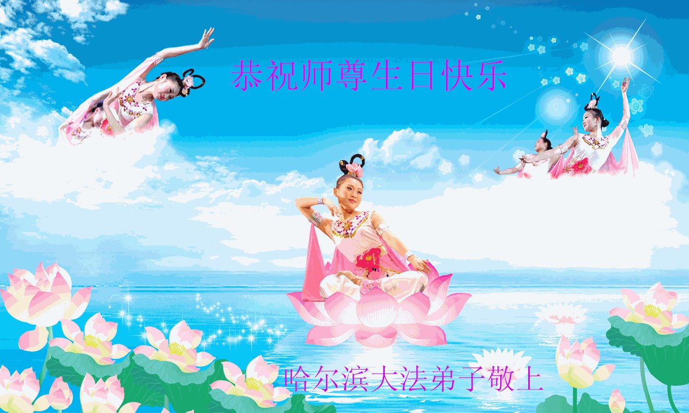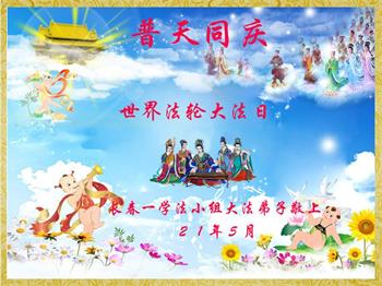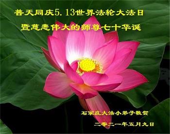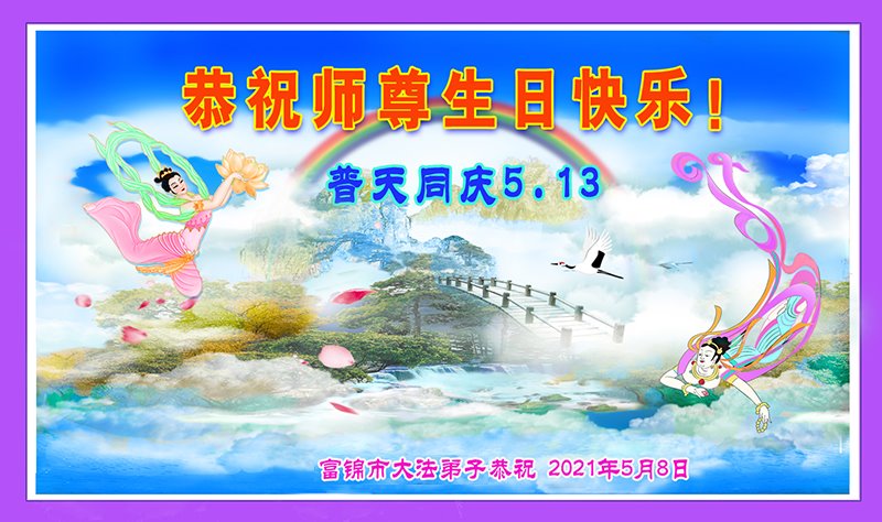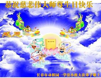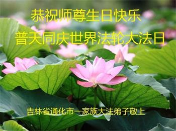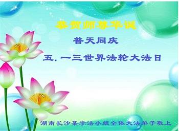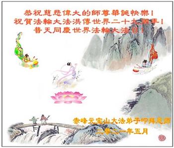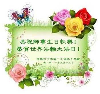 福建省福州市一大法弟子在贺词中说:“弟子双手合十,发自心底的恭祝慈悲伟大的师父华诞!每当5·13这辉煌的日子到来之际,弟子内心都充满对师父的无比感恩和思念。是师父把我脱胎换骨,重塑成一个全新的真我。”