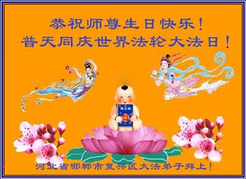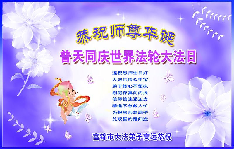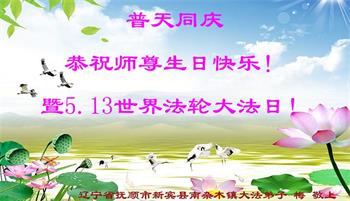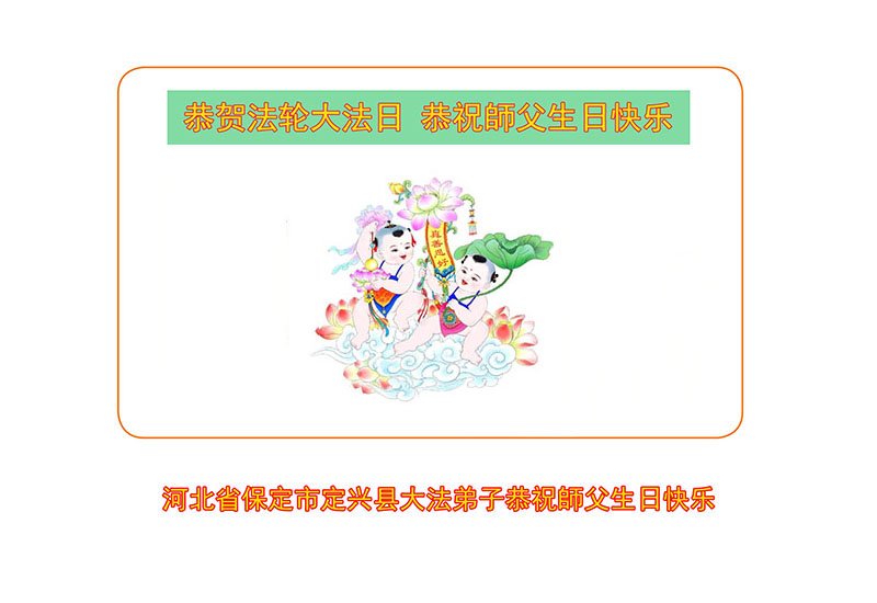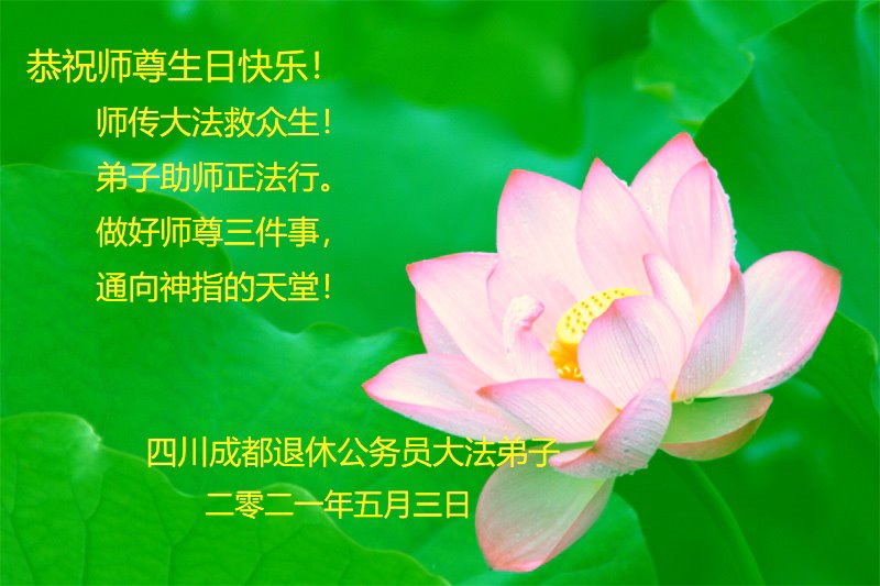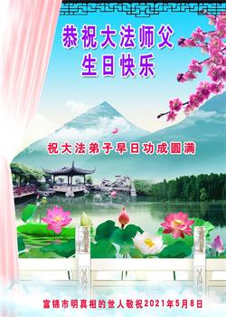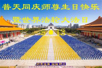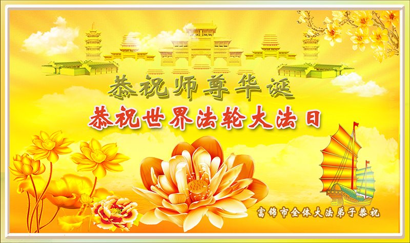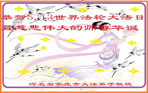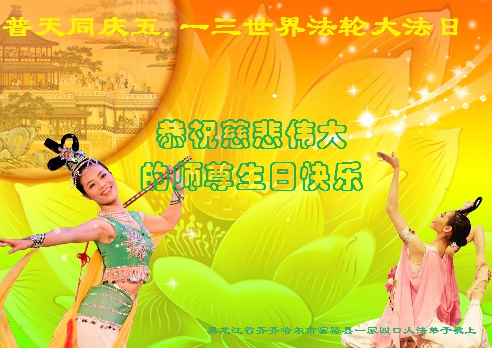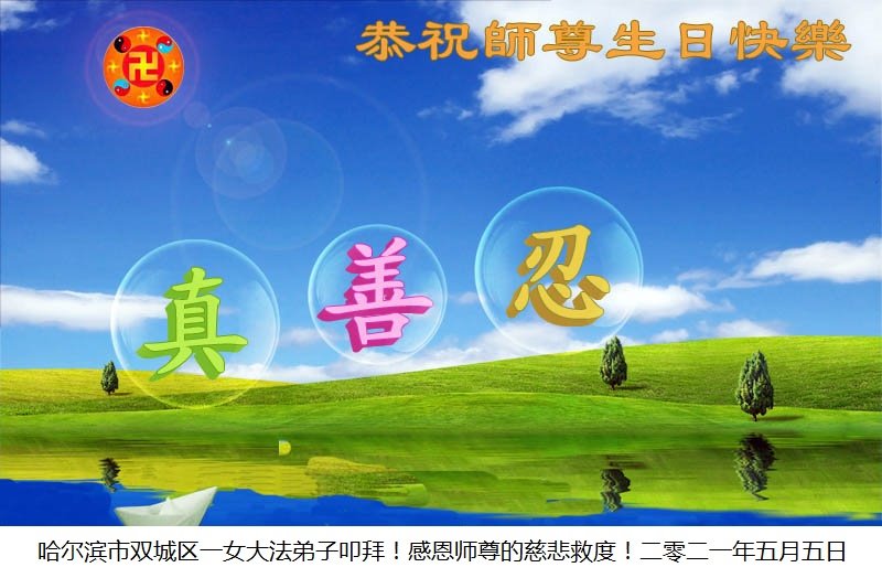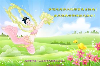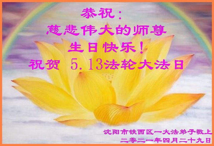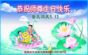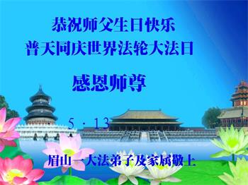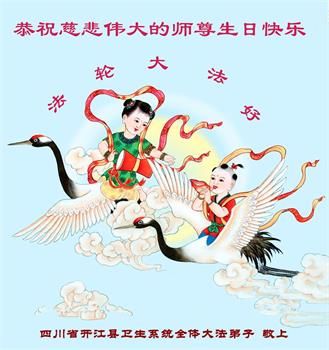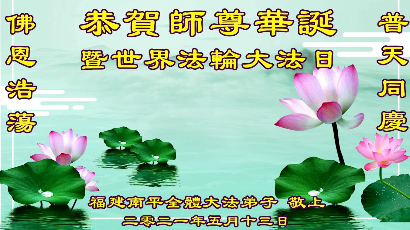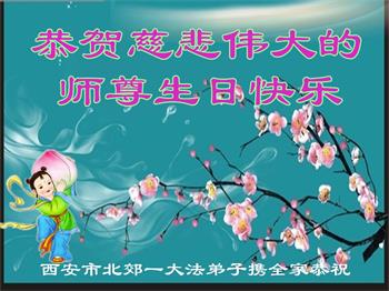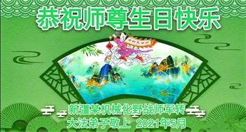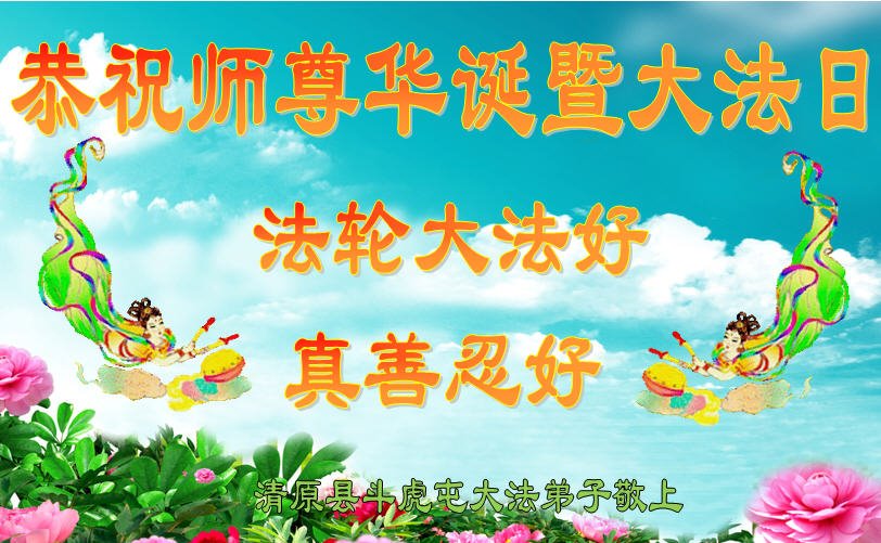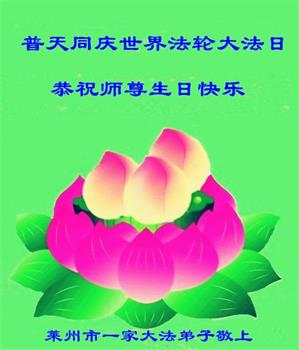福建省福州市一大法弟子在贺词中说:“弟子双手合十,发自心底的恭祝慈悲伟大的师父华诞!每当5·13这辉煌的日子到来之际,弟子内心都充满对师父的无比感恩和思念。是师父把我脱胎换骨,重塑成一个全新的真我。”