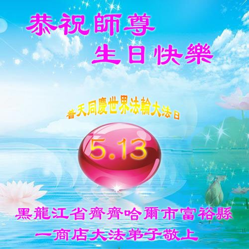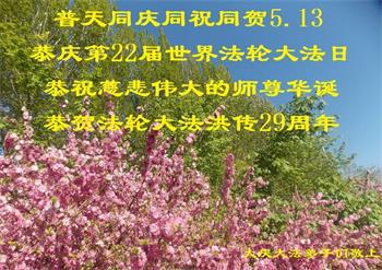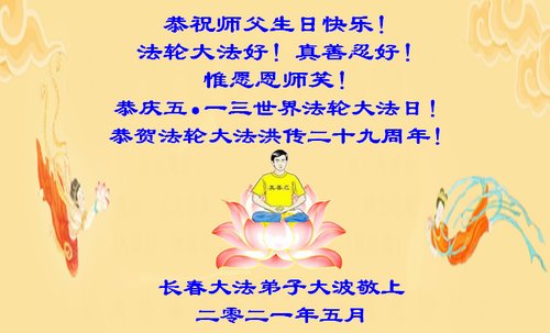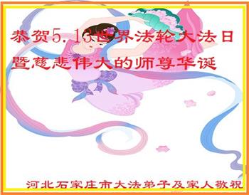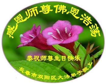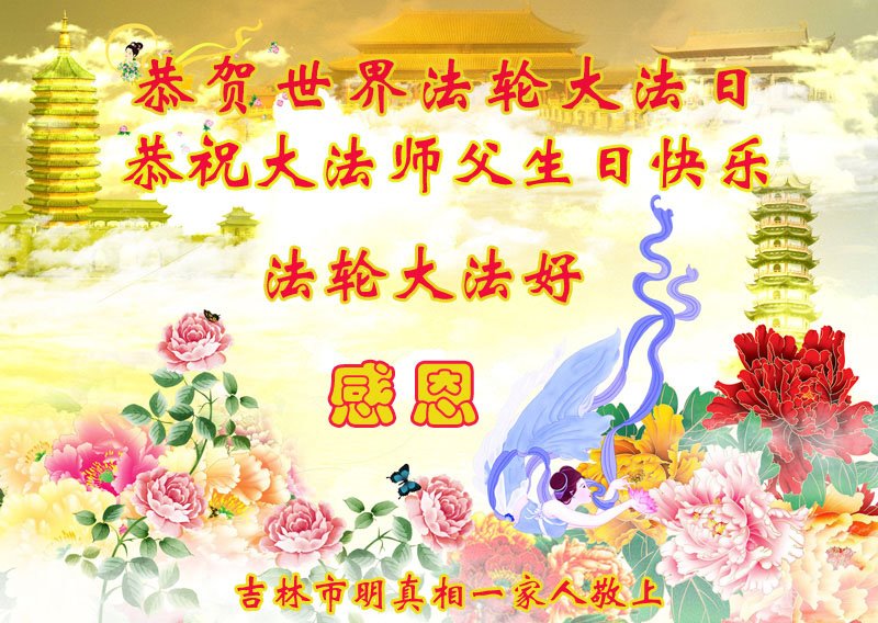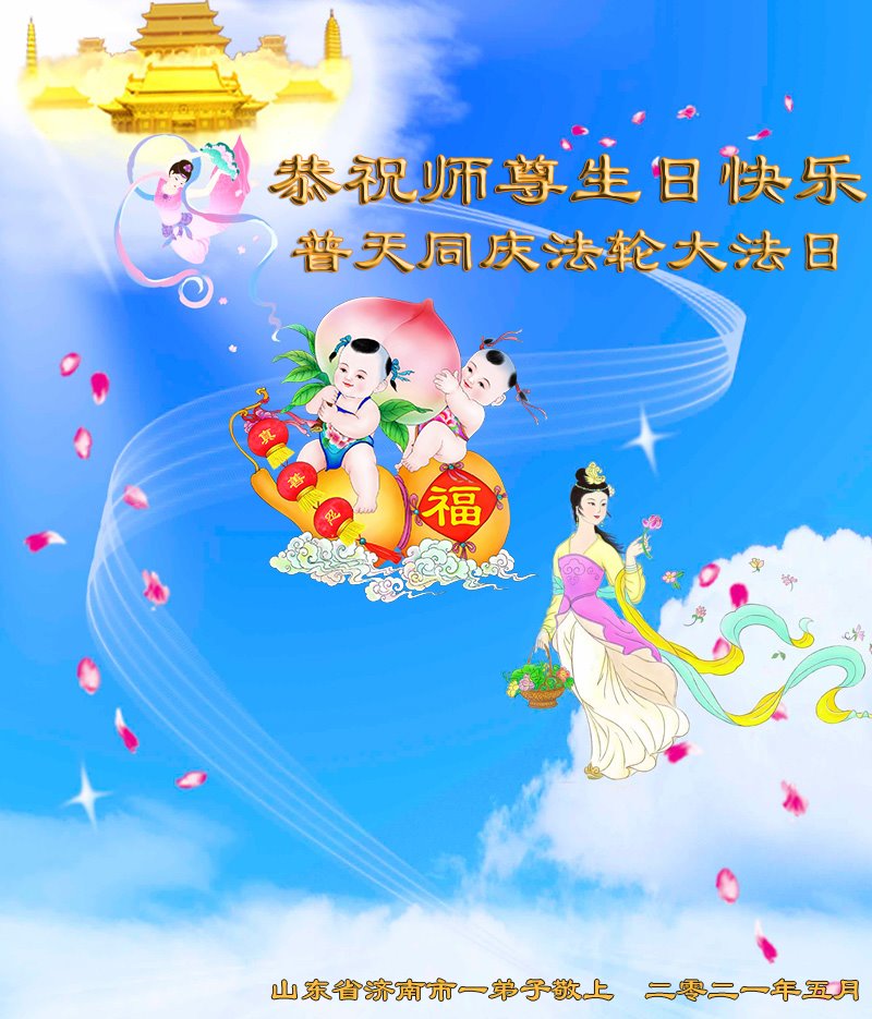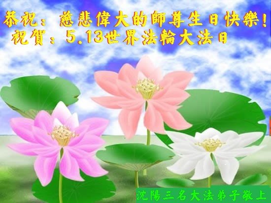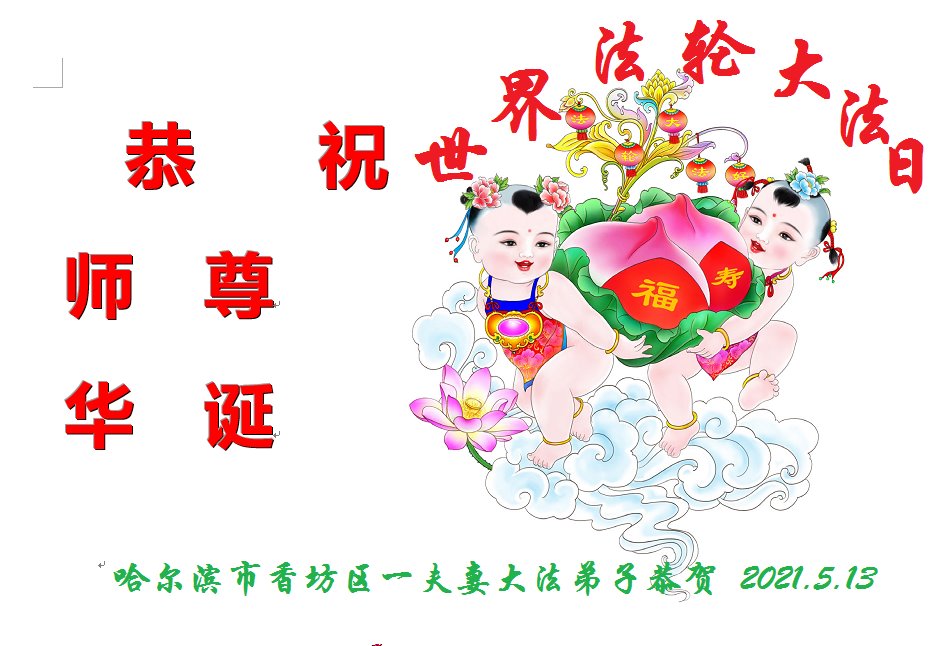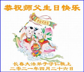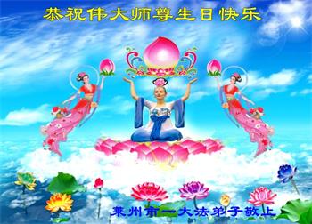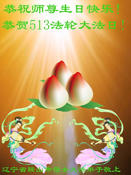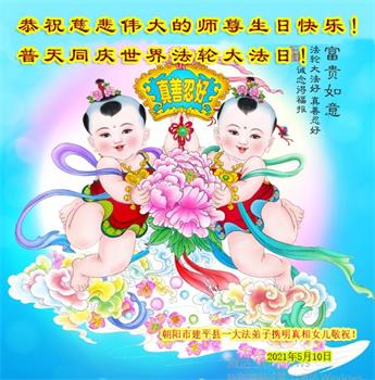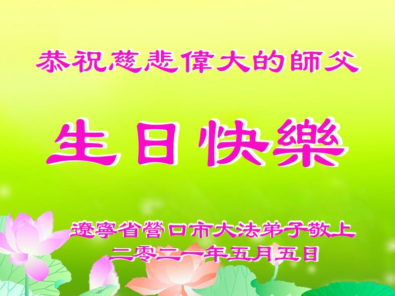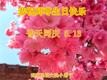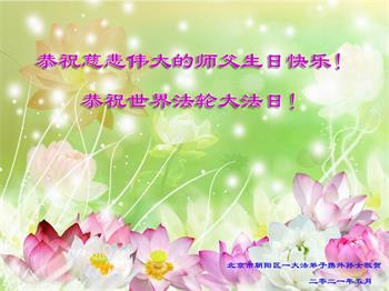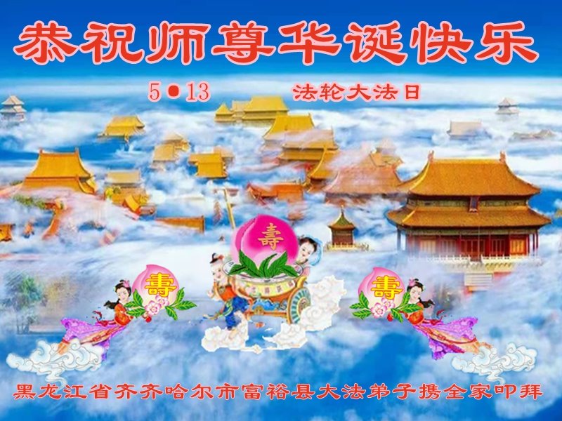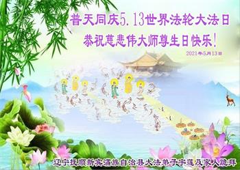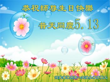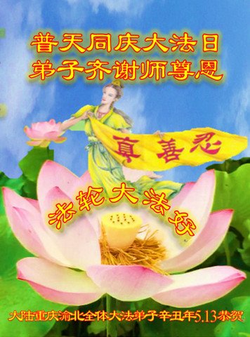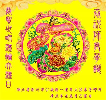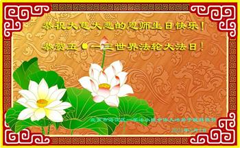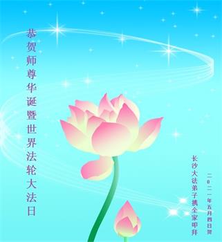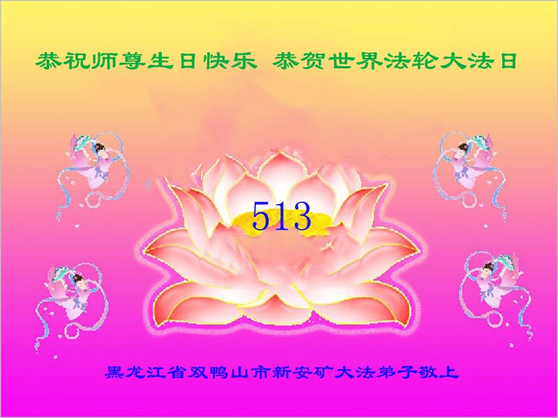 福建省福州市一大法弟子在贺词中说:“弟子双手合十,发自心底的恭祝慈悲伟大的师父华诞!每当5·13这辉煌的日子到来之际,弟子内心都充满对师父的无比感恩和思念。是师父把我脱胎换骨,重塑成一个全新的真我。”