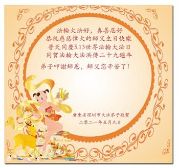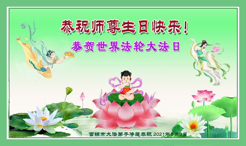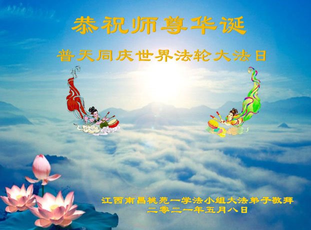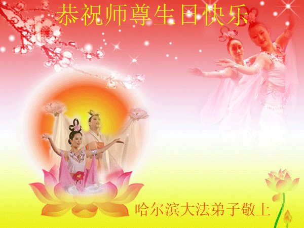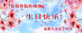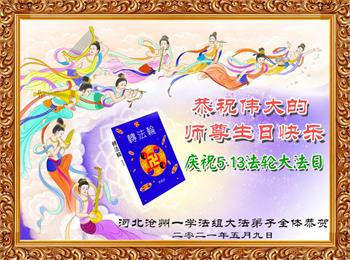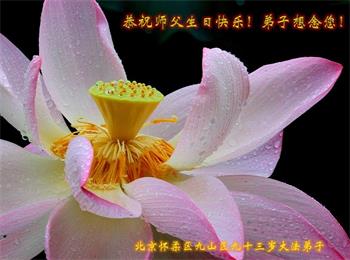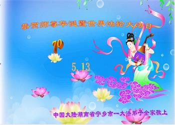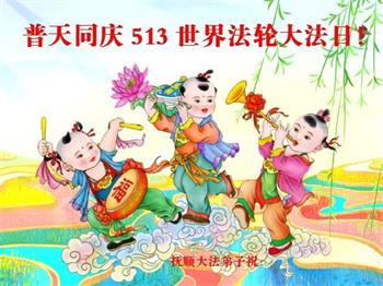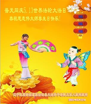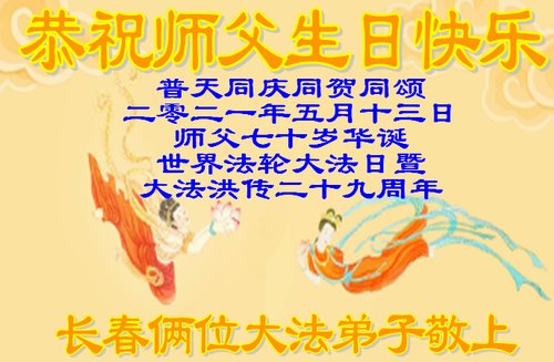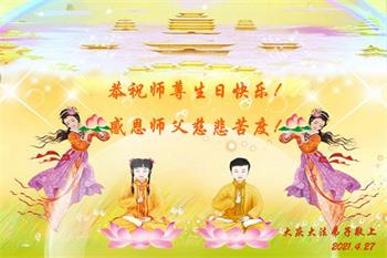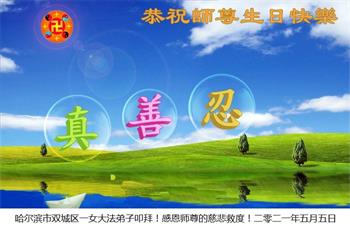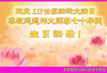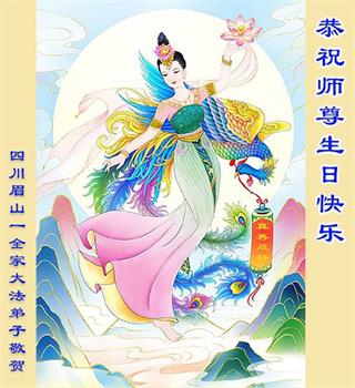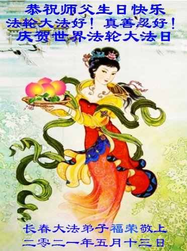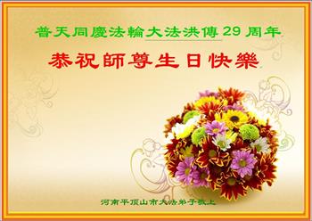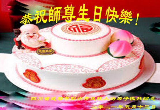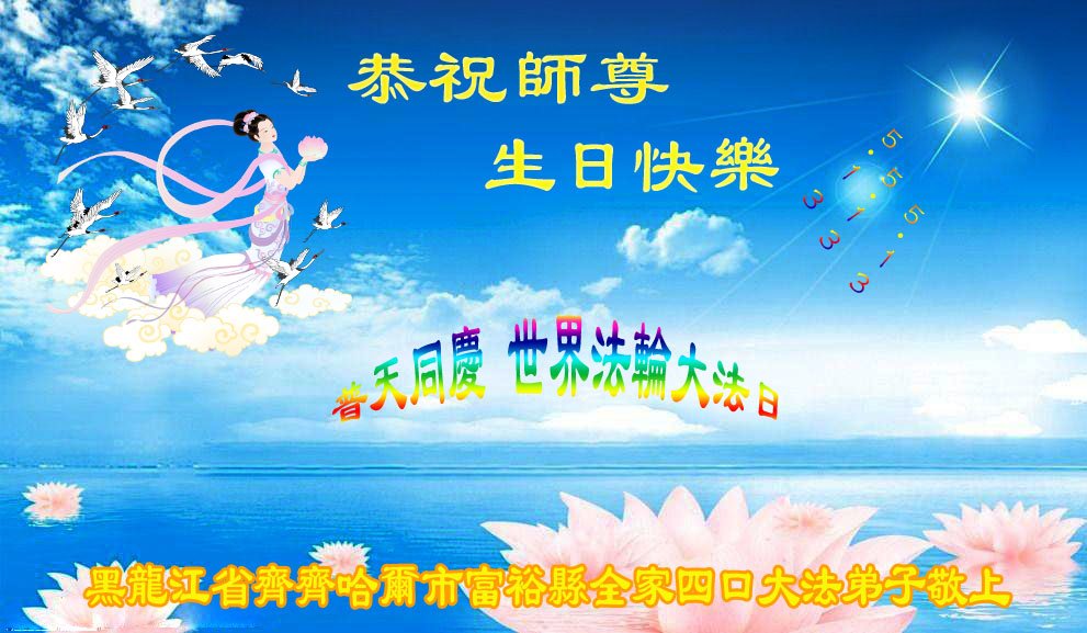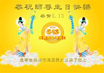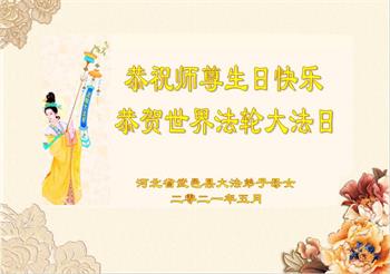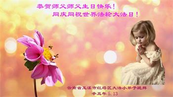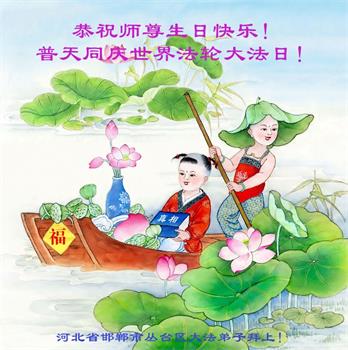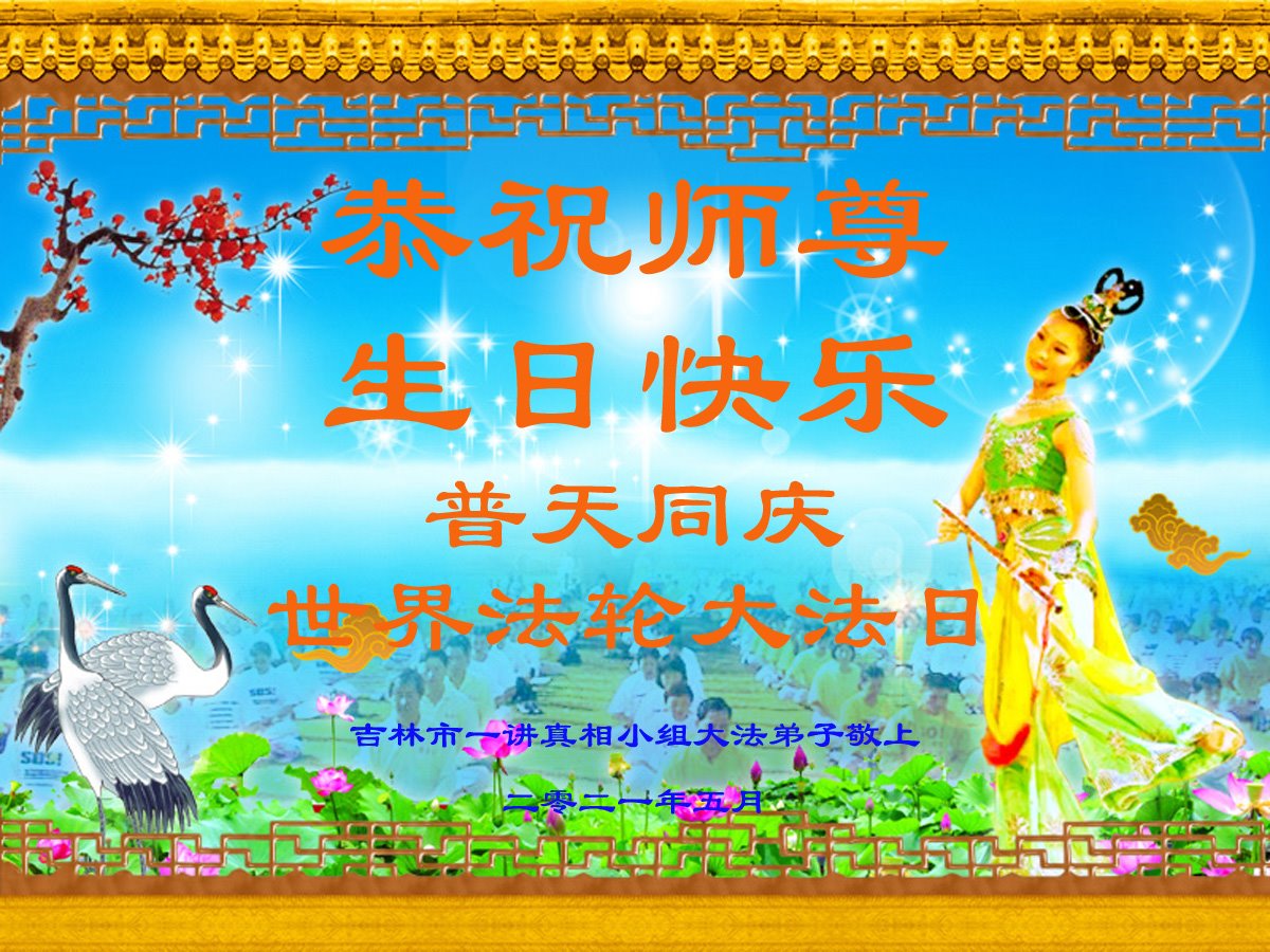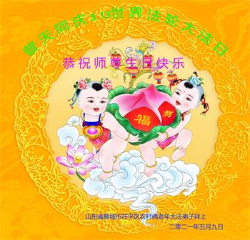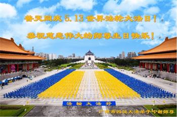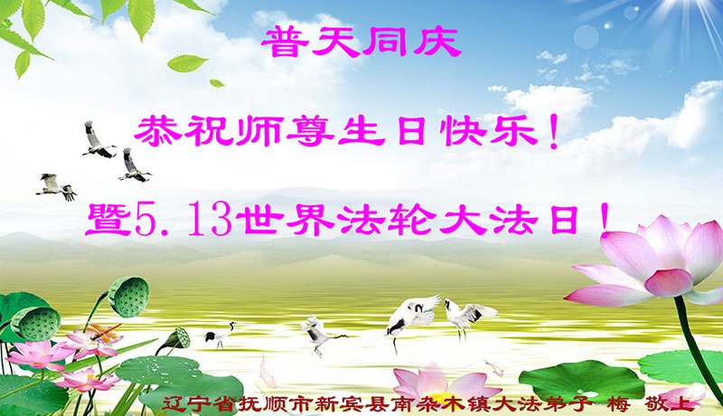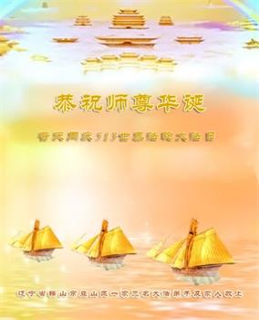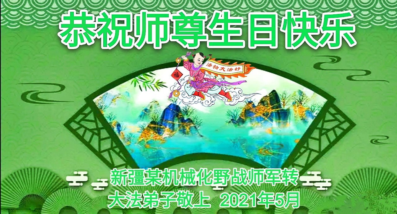 福建省福州市一大法弟子在贺词中说:“弟子双手合十,发自心底的恭祝慈悲伟大的师父华诞!每当5·13这辉煌的日子到来之际,弟子内心都充满对师父的无比感恩和思念。是师父把我脱胎换骨,重塑成一个全新的真我。”