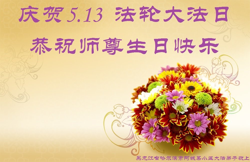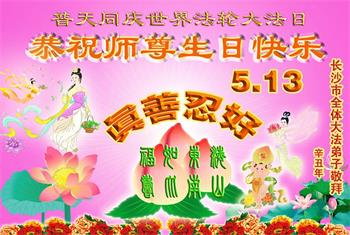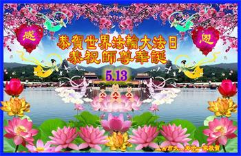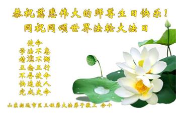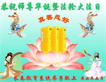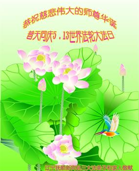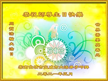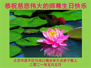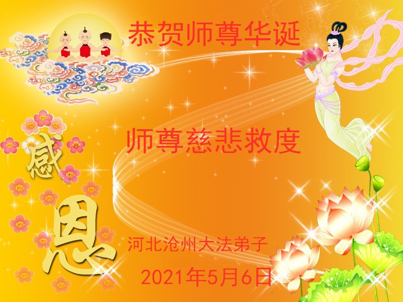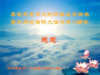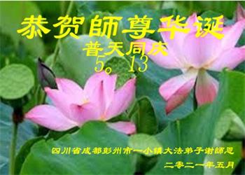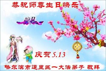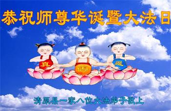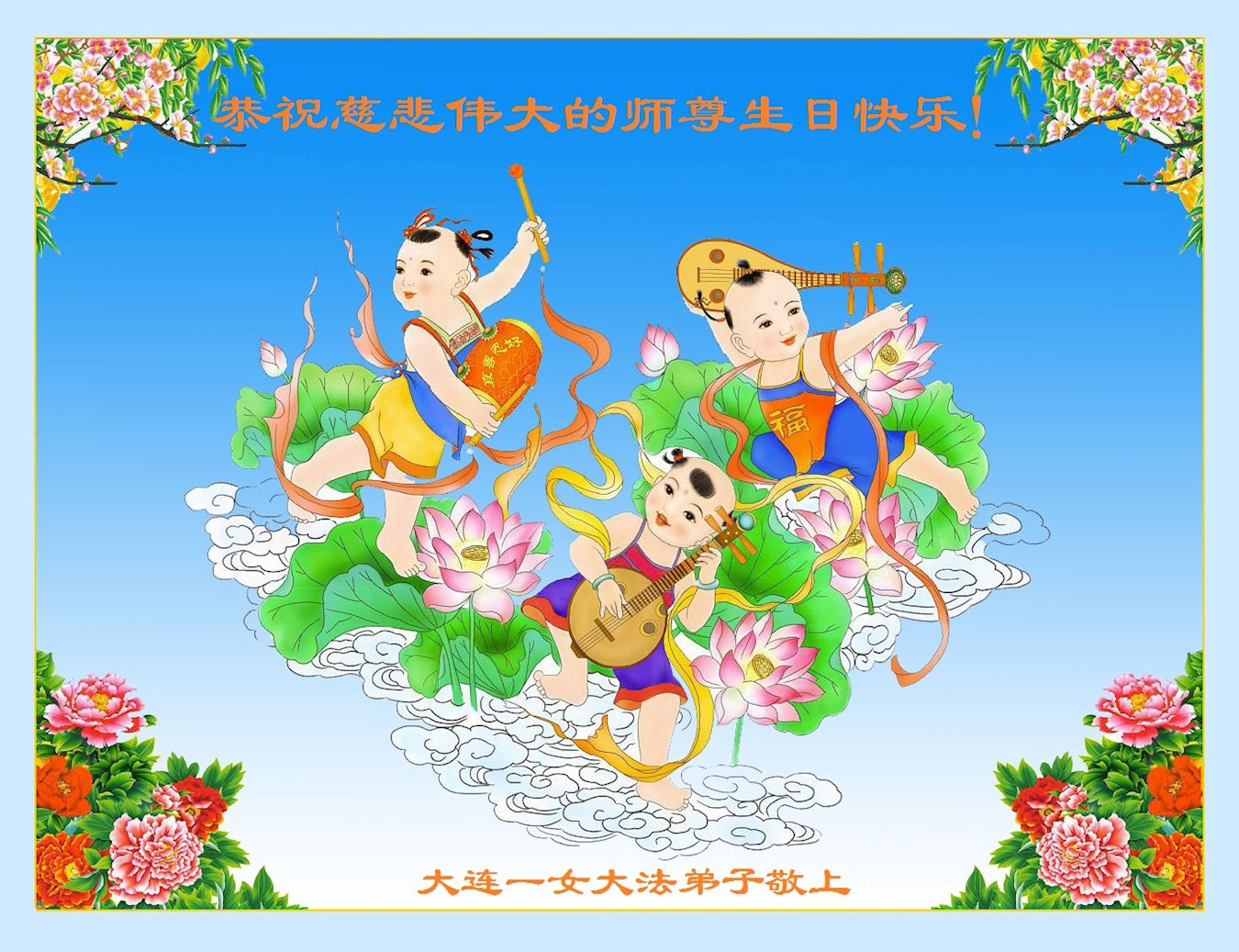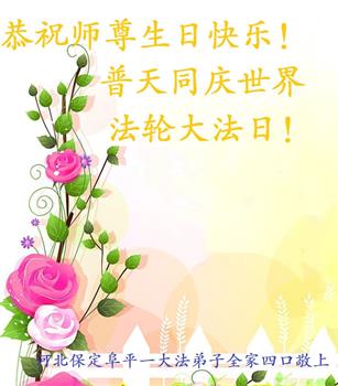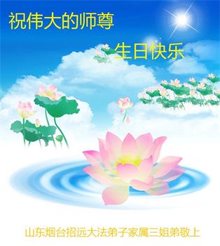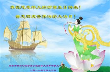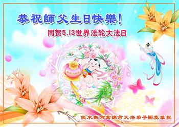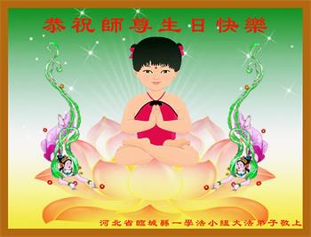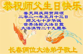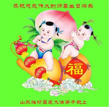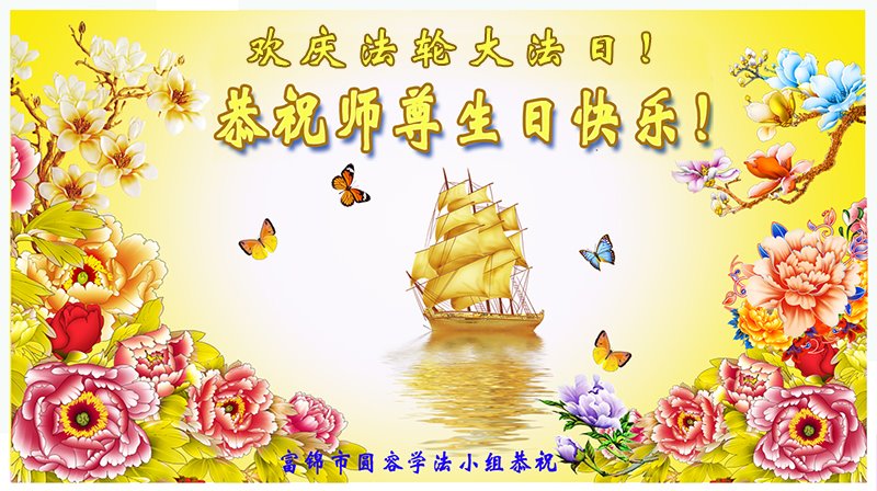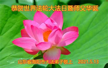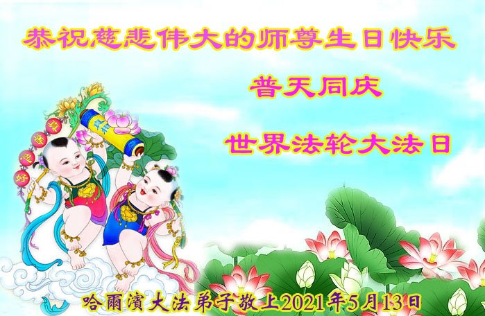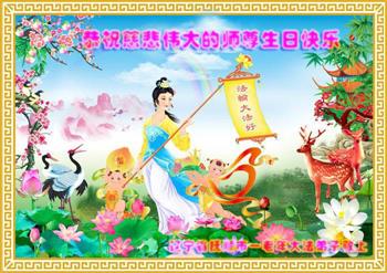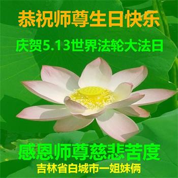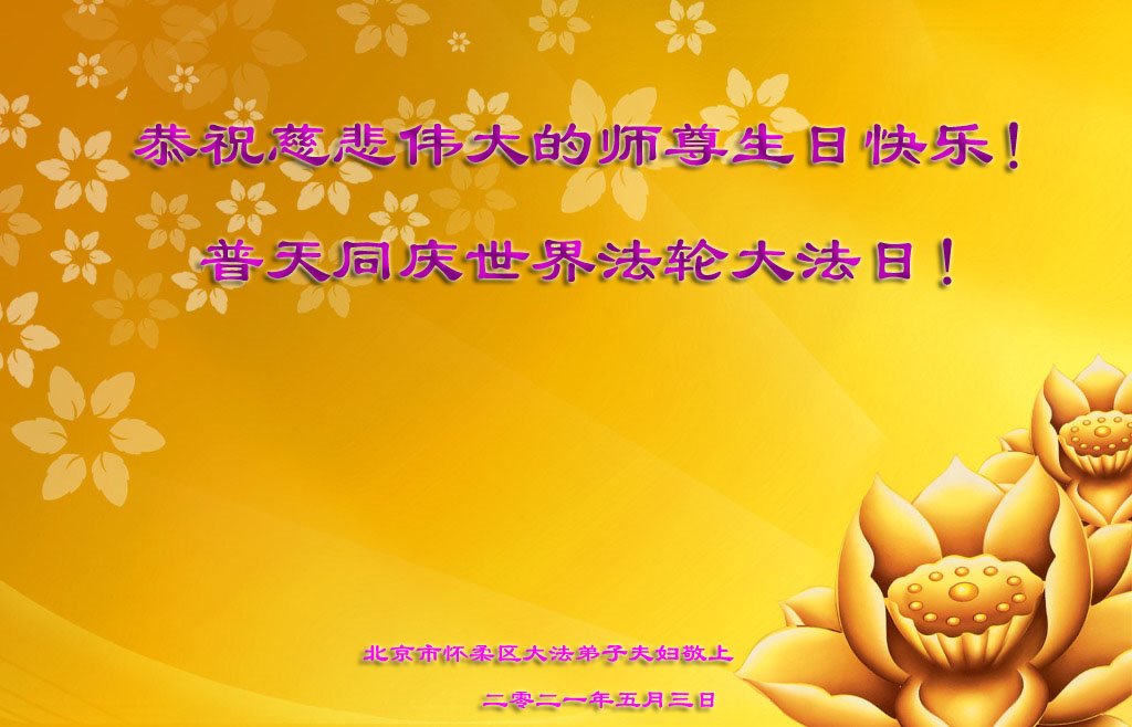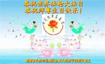 福建省福州市一大法弟子在贺词中说:“弟子双手合十,发自心底的恭祝慈悲伟大的师父华诞!每当5·13这辉煌的日子到来之际,弟子内心都充满对师父的无比感恩和思念。是师父把我脱胎换骨,重塑成一个全新的真我。”