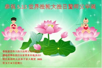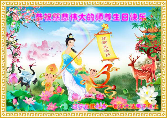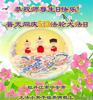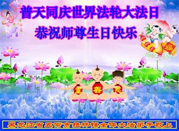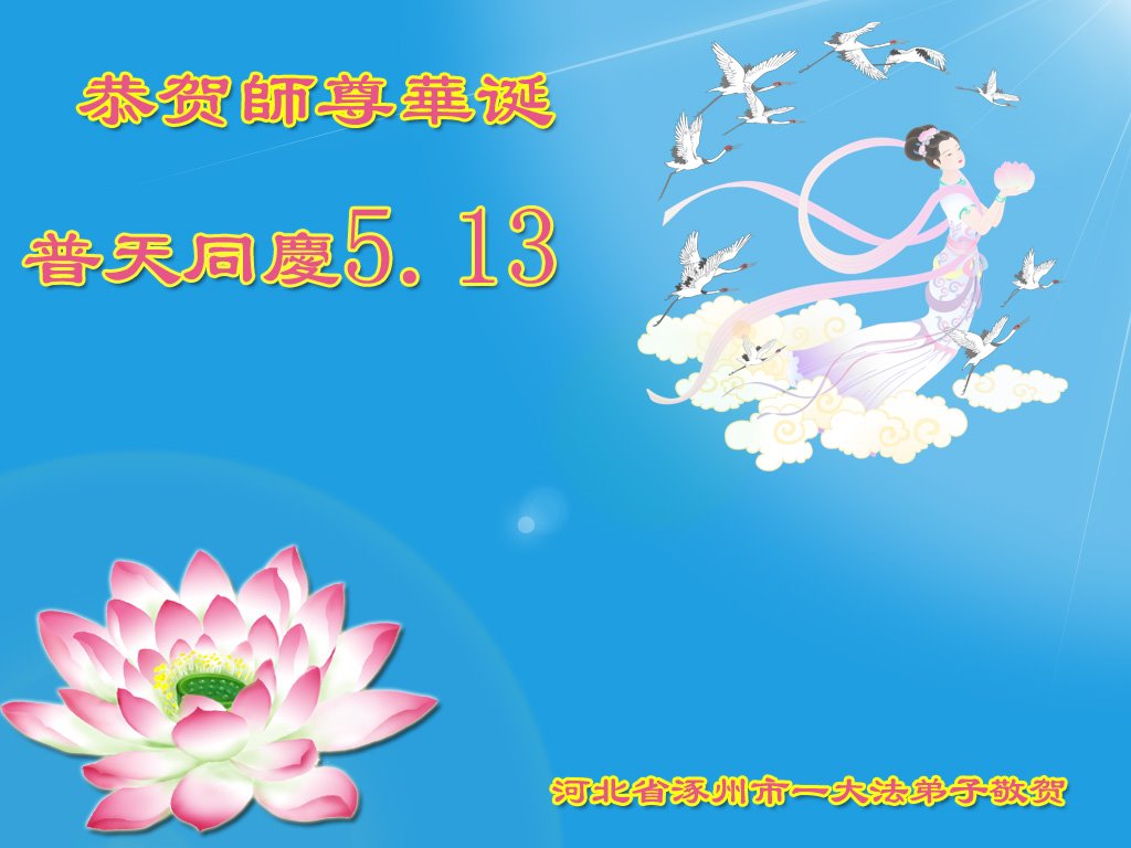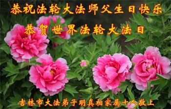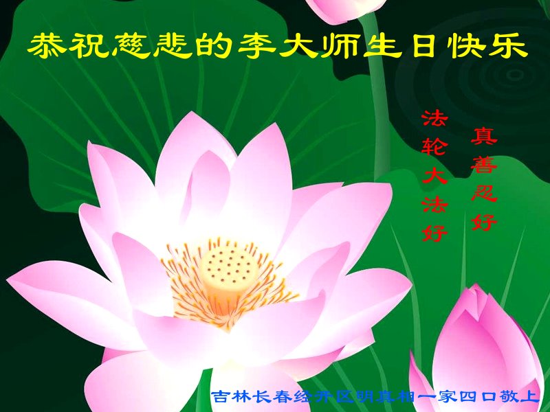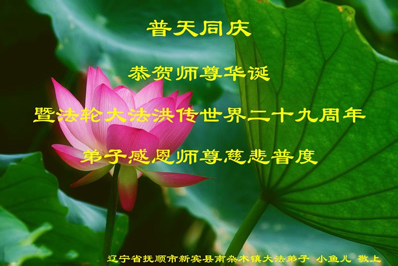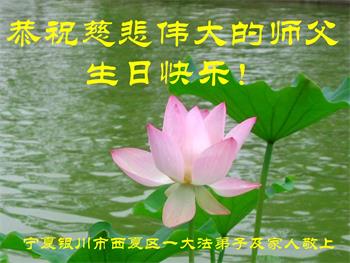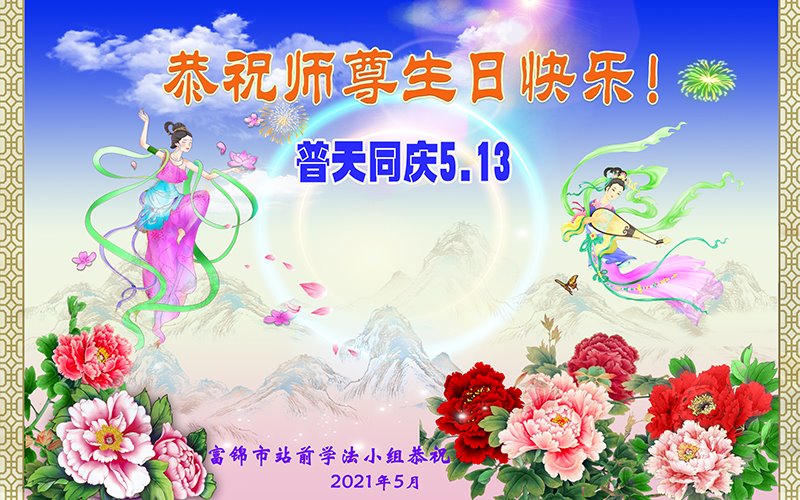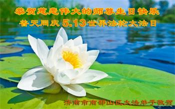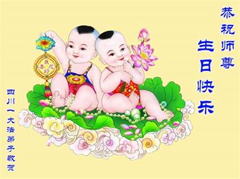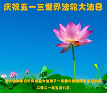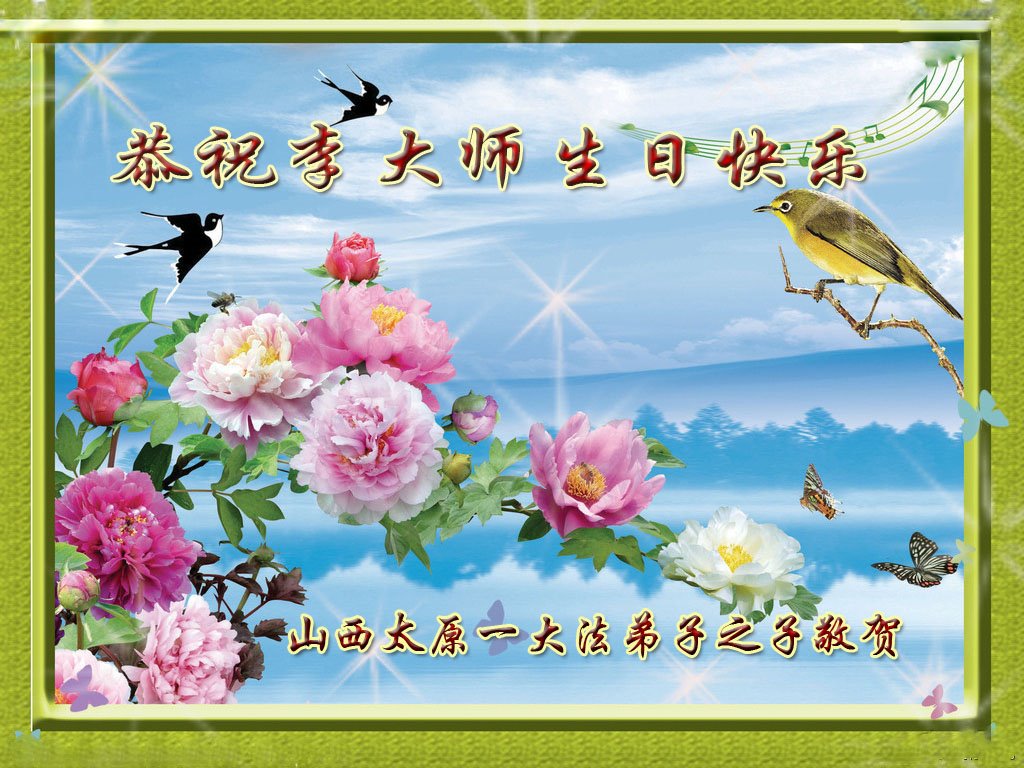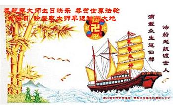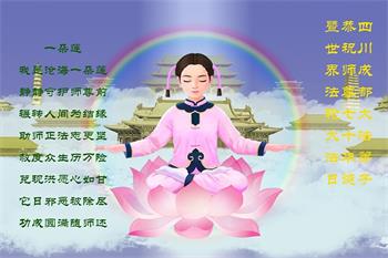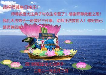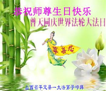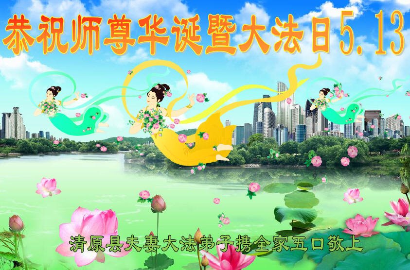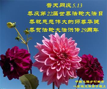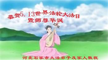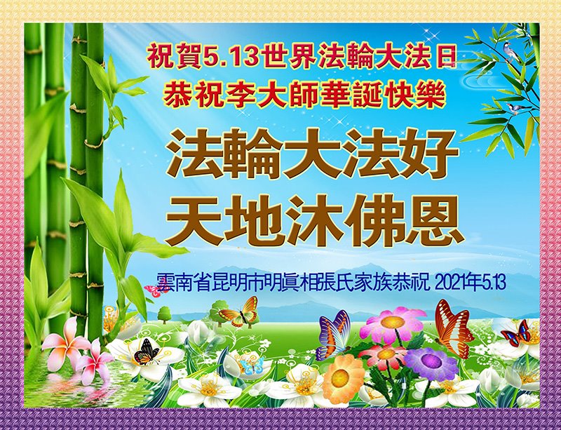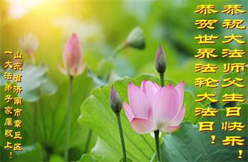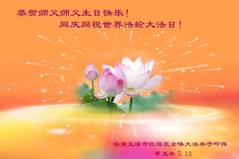 福建省福州市一大法弟子在贺词中说:“弟子双手合十,发自心底的恭祝慈悲伟大的师父华诞!每当5·13这辉煌的日子到来之际,弟子内心都充满对师父的无比感恩和思念。是师父把我脱胎换骨,重塑成一个全新的真我。”