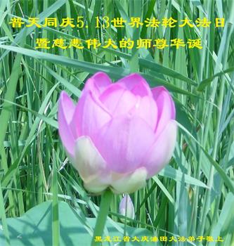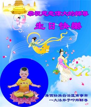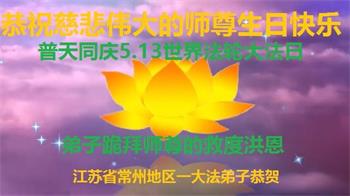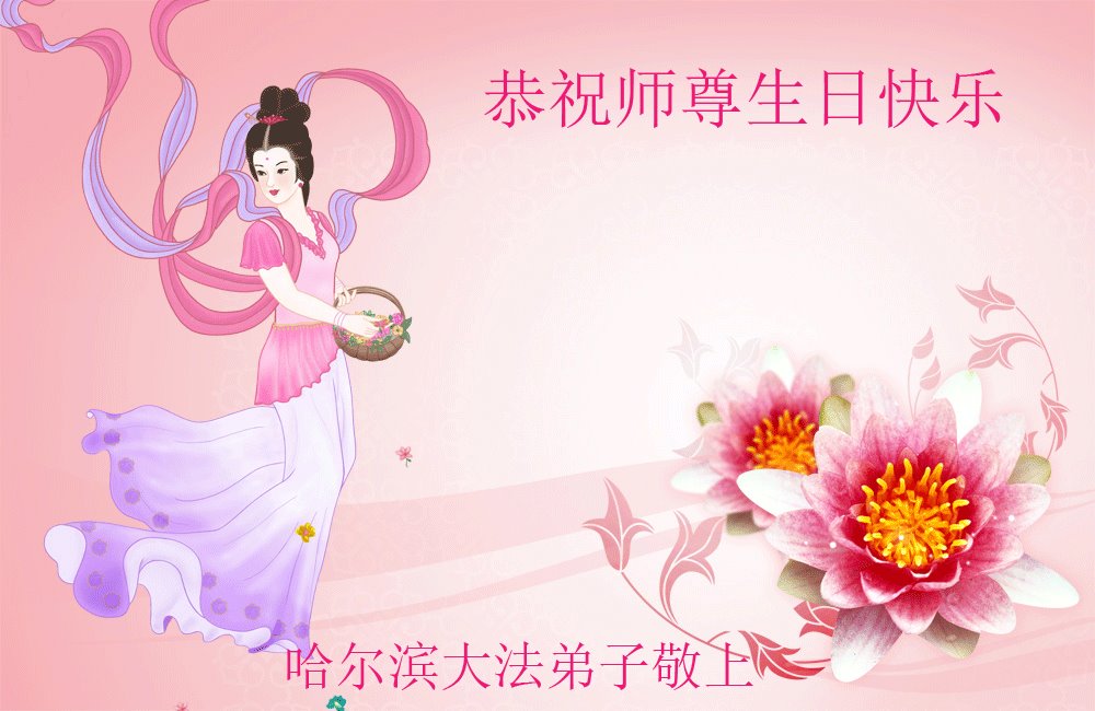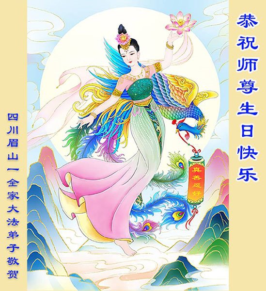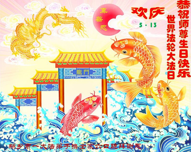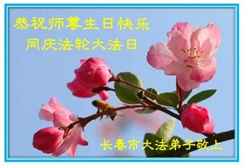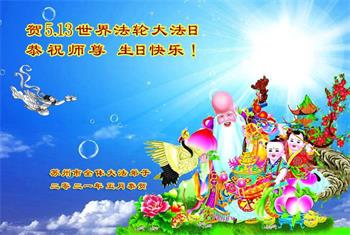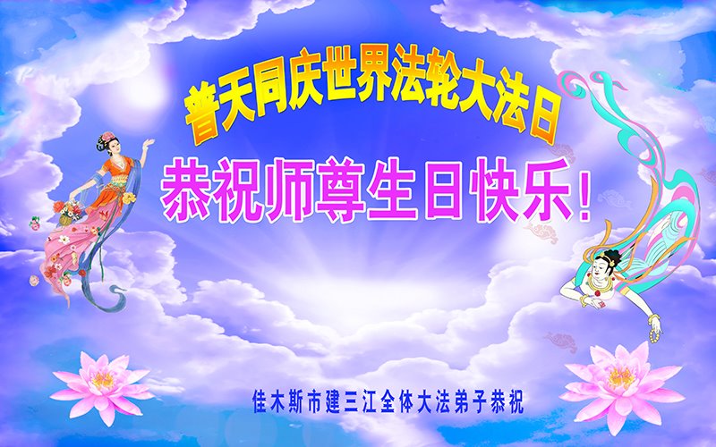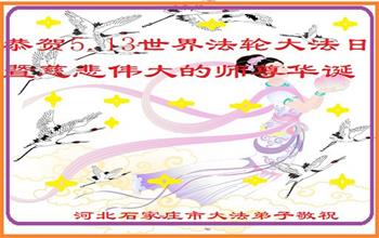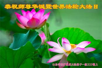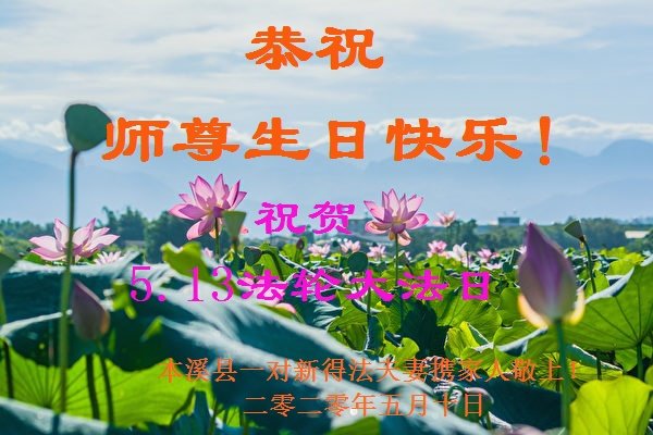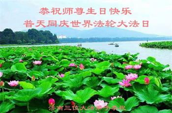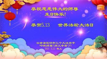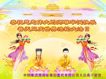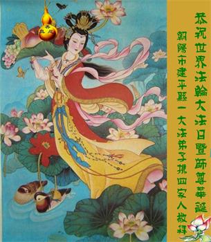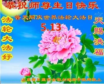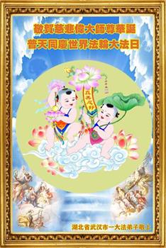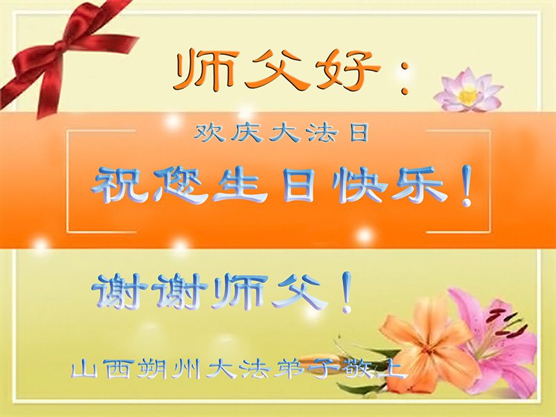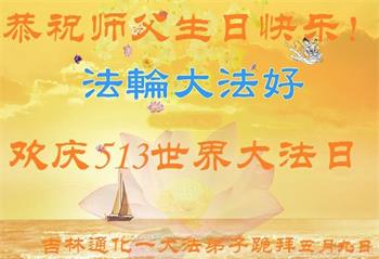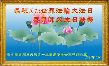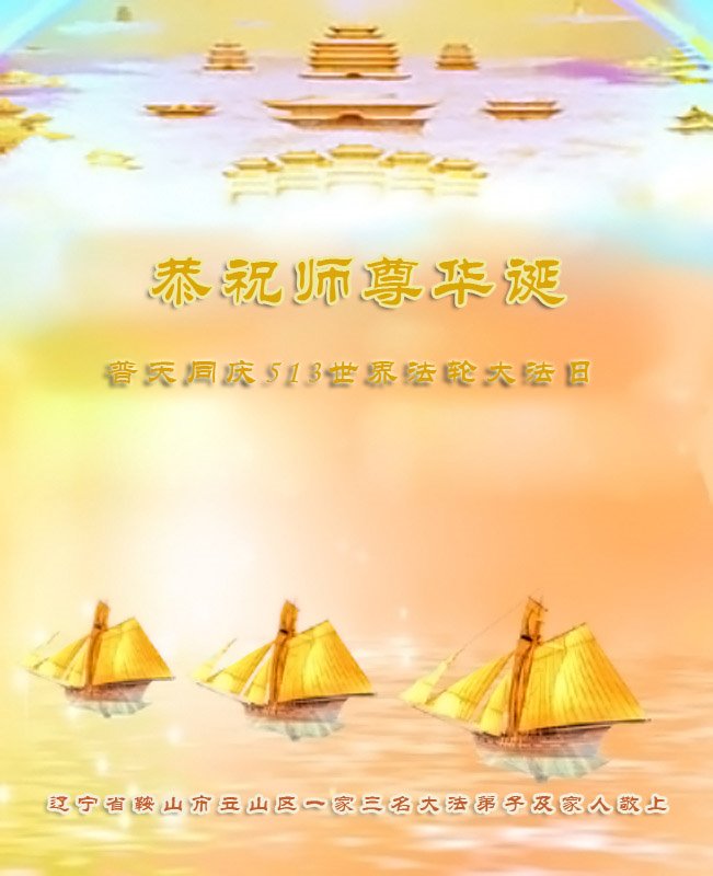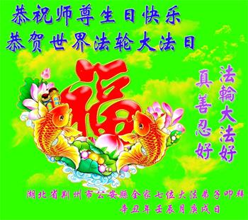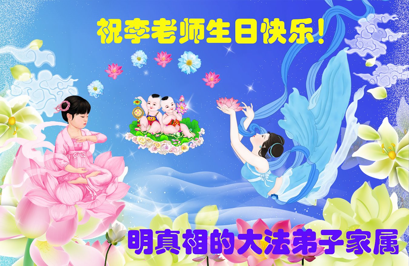福建省福州市一大法弟子在贺词中说:“弟子双手合十,发自心底的恭祝慈悲伟大的师父华诞!每当5·13这辉煌的日子到来之际,弟子内心都充满对师父的无比感恩和思念。是师父把我脱胎换骨,重塑成一个全新的真我。”