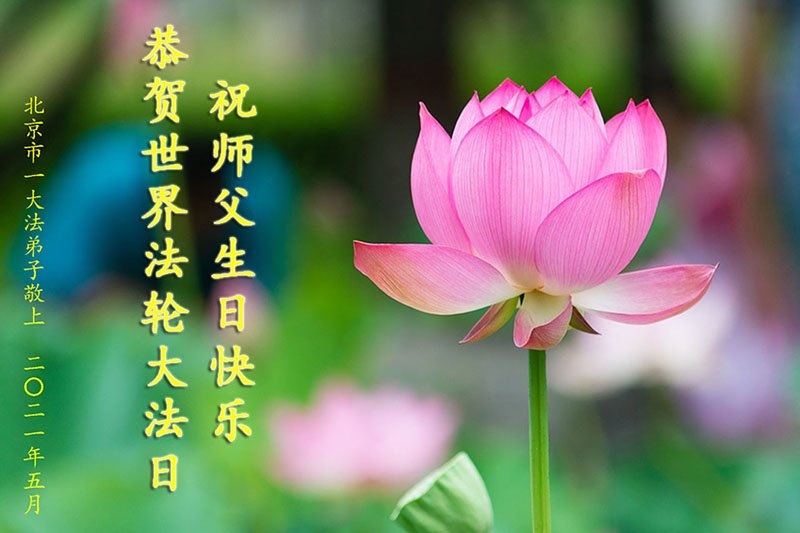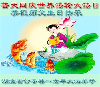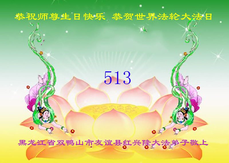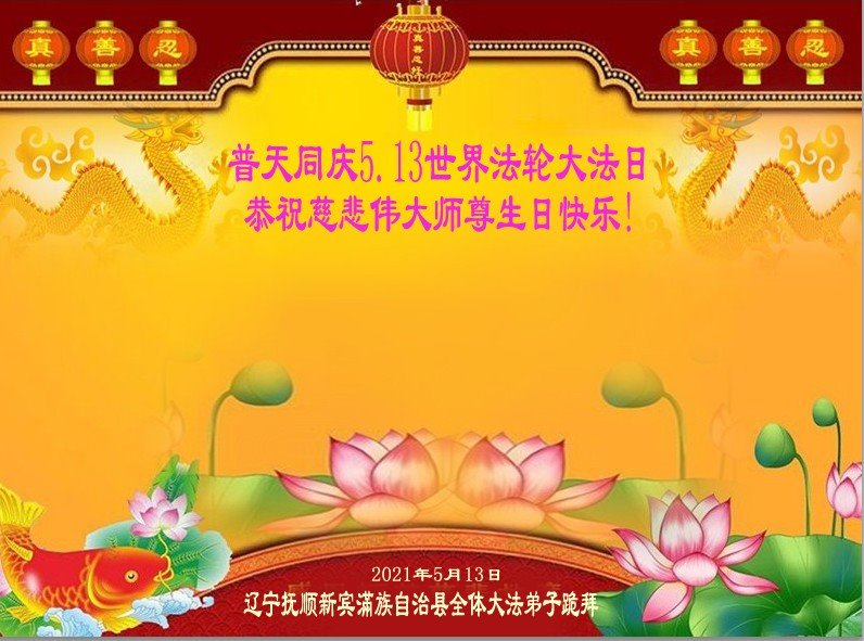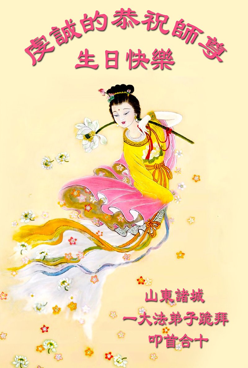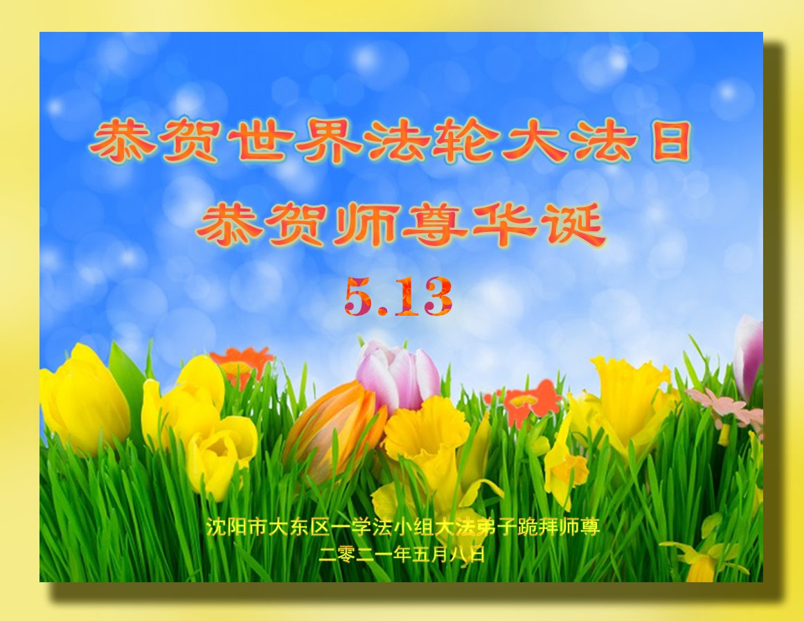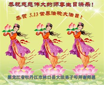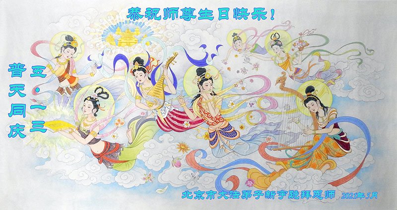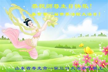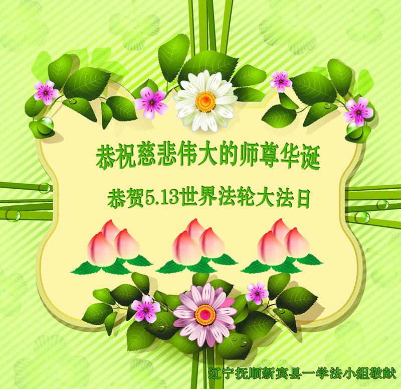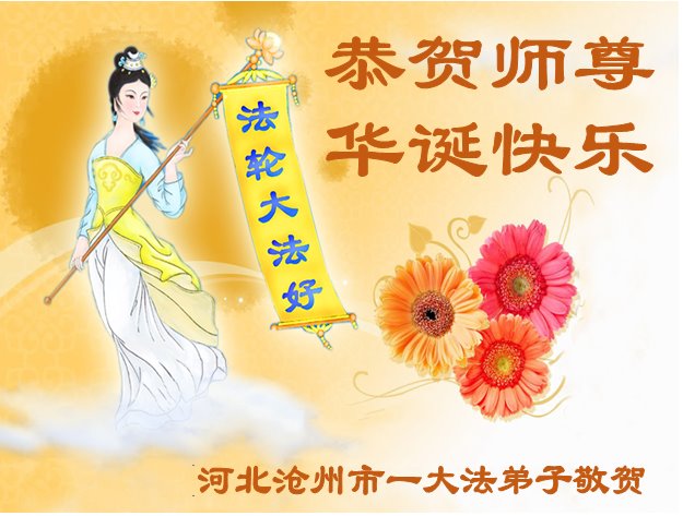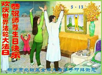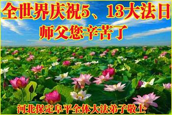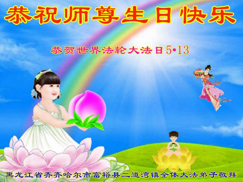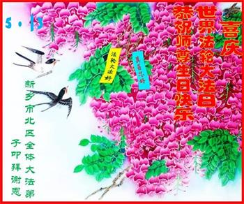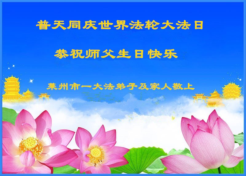 福建省福州市一大法弟子在贺词中说:“弟子双手合十,发自心底的恭祝慈悲伟大的师父华诞!每当5·13这辉煌的日子到来之际,弟子内心都充满对师父的无比感恩和思念。是师父把我脱胎换骨,重塑成一个全新的真我。”