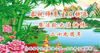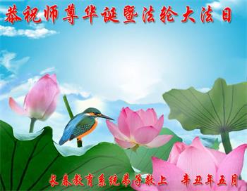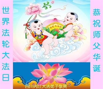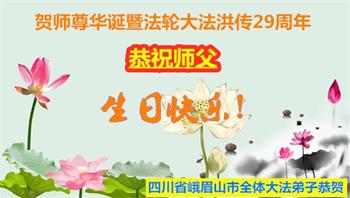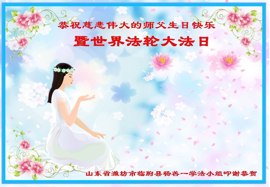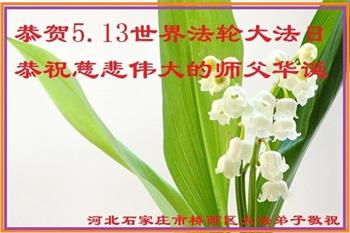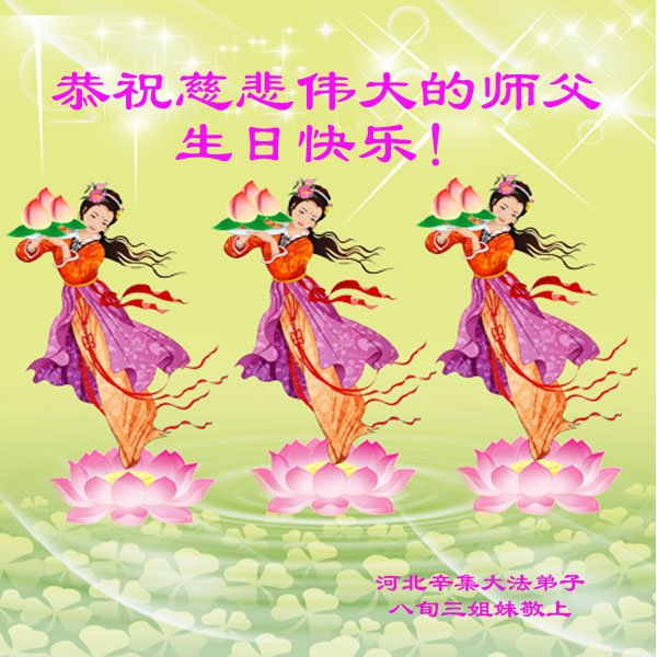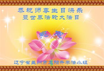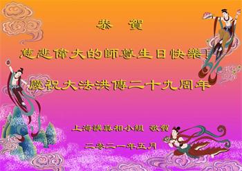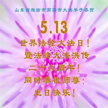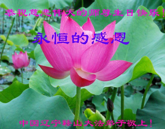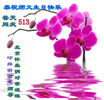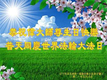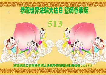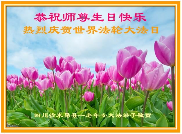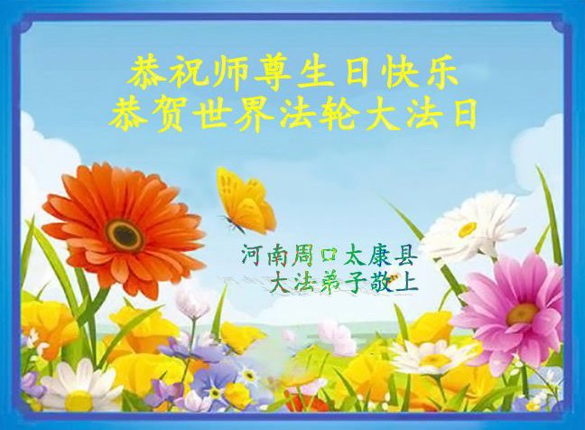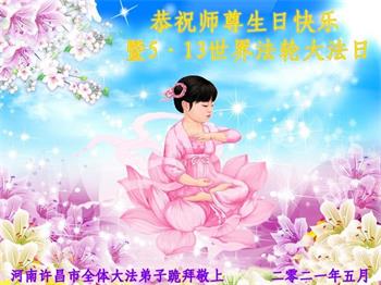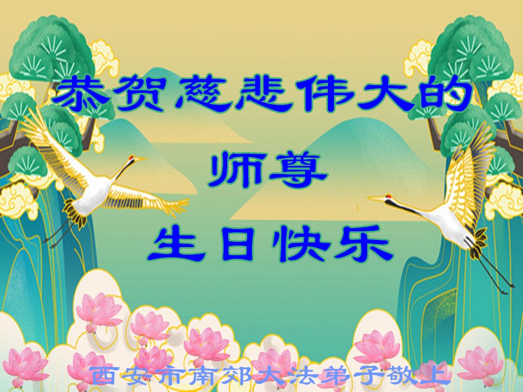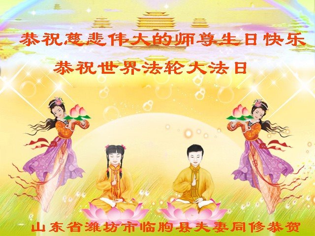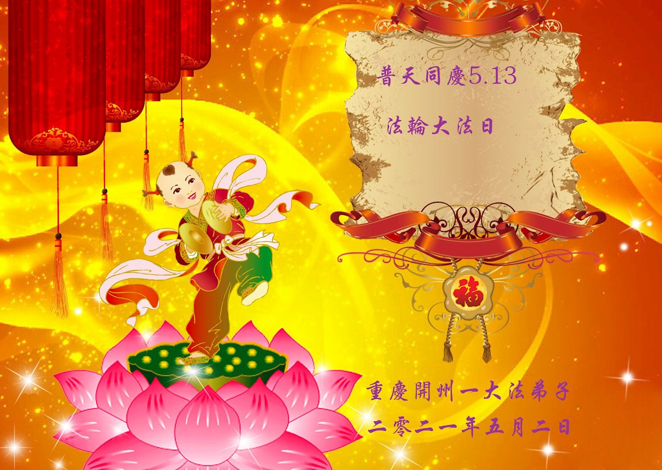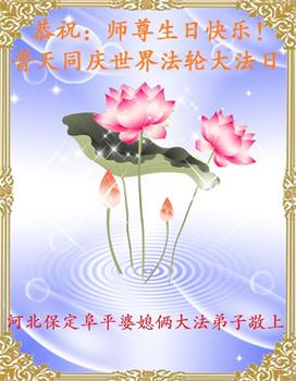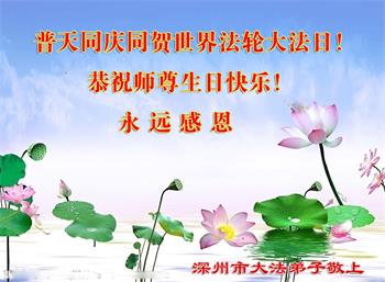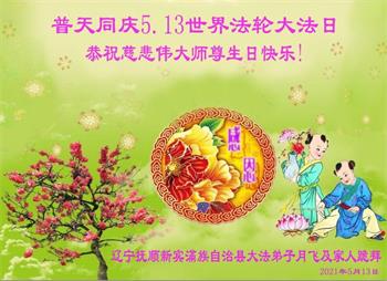 福建省福州市一大法弟子在贺词中说:“弟子双手合十,发自心底的恭祝慈悲伟大的师父华诞!每当5·13这辉煌的日子到来之际,弟子内心都充满对师父的无比感恩和思念。是师父把我脱胎换骨,重塑成一个全新的真我。”