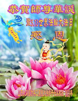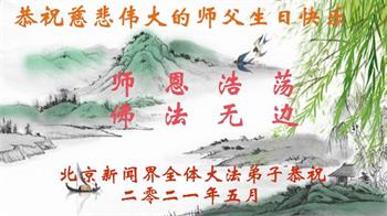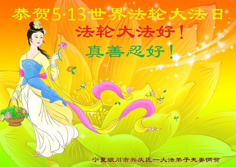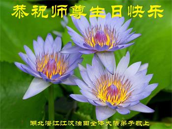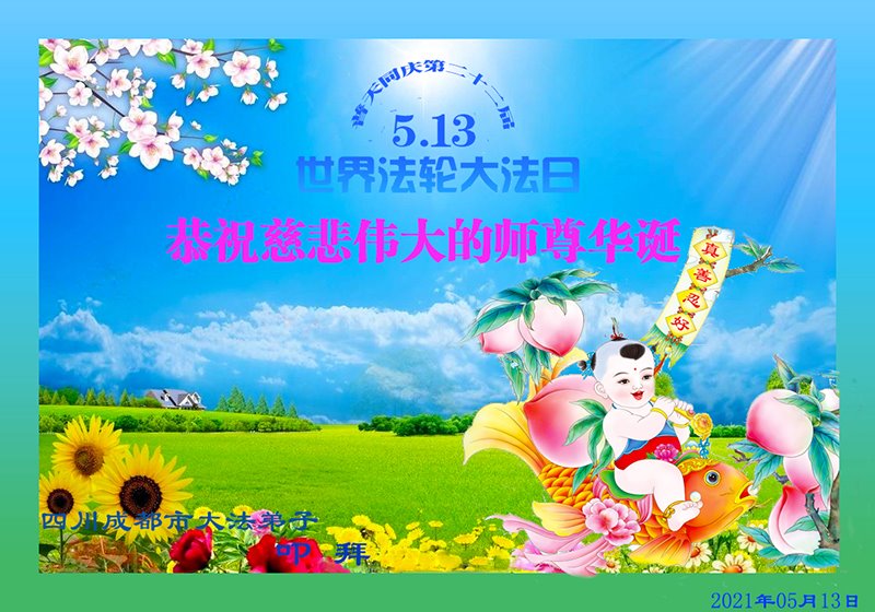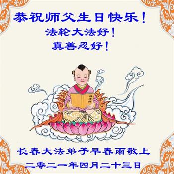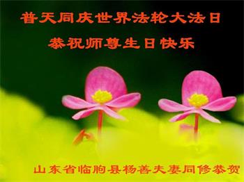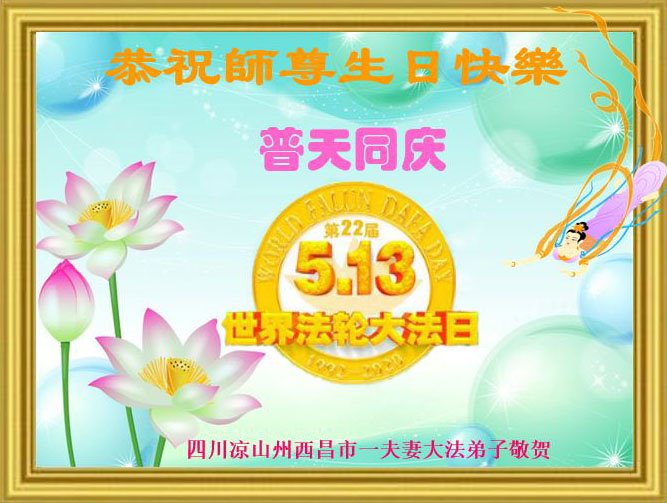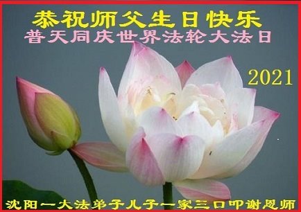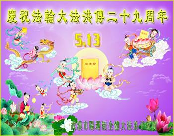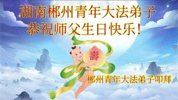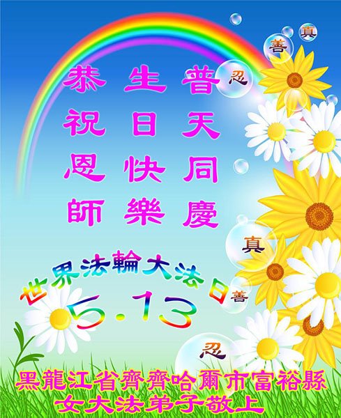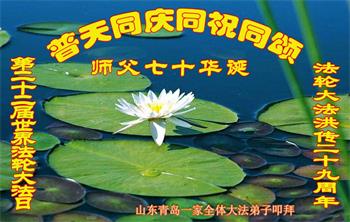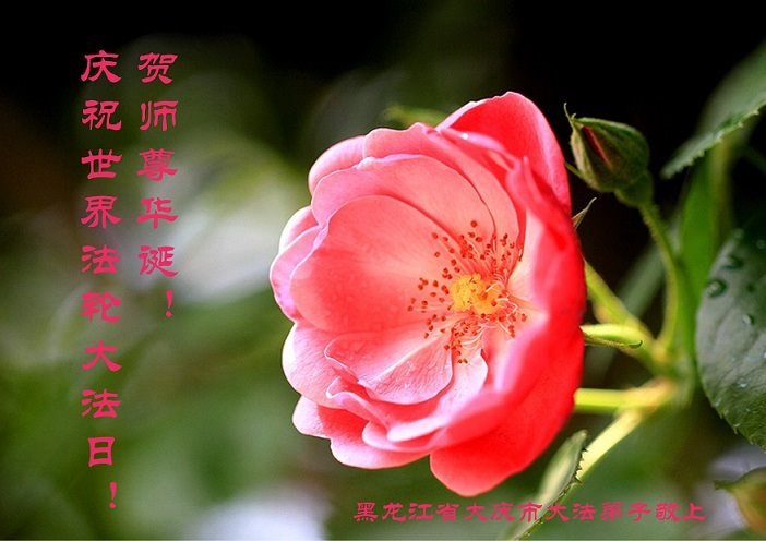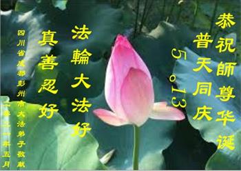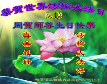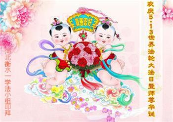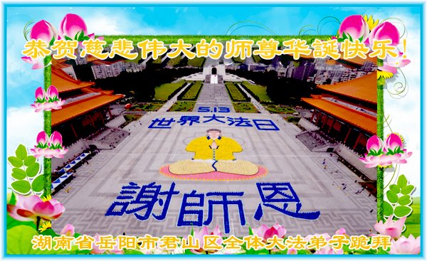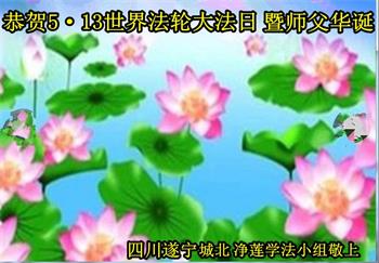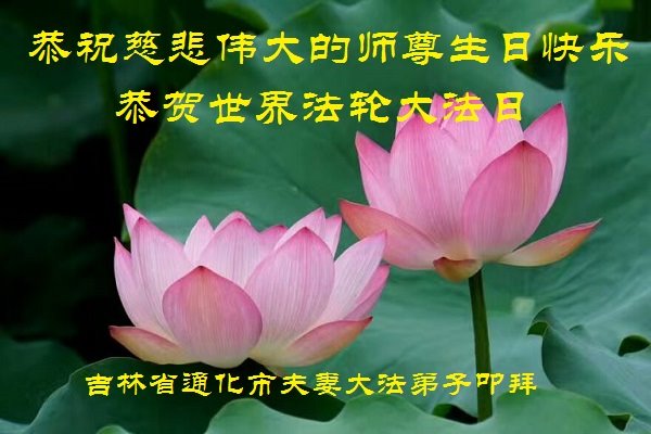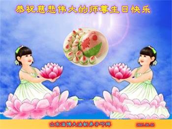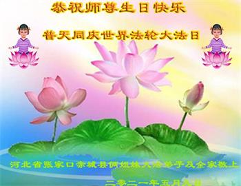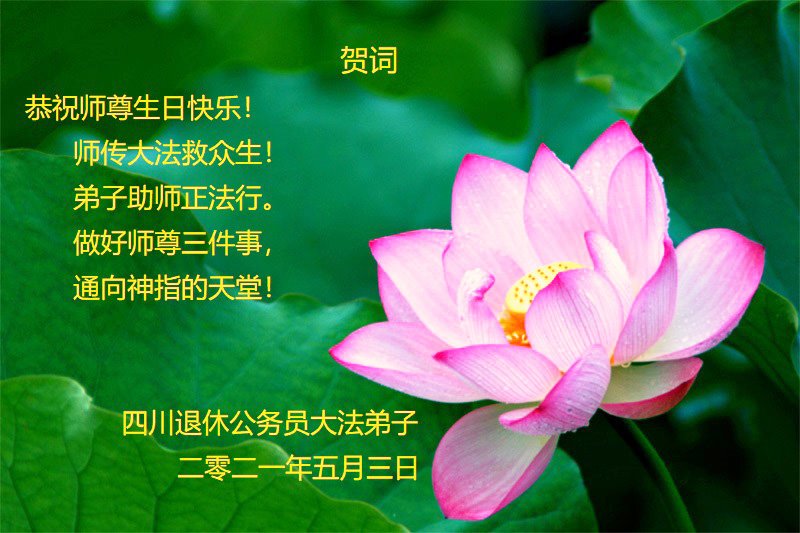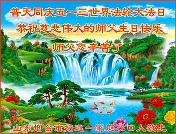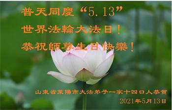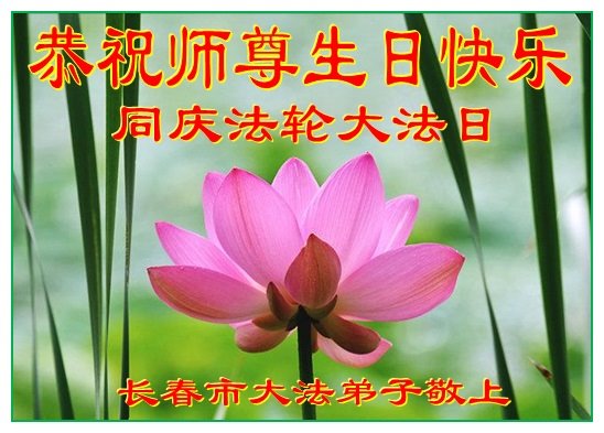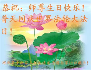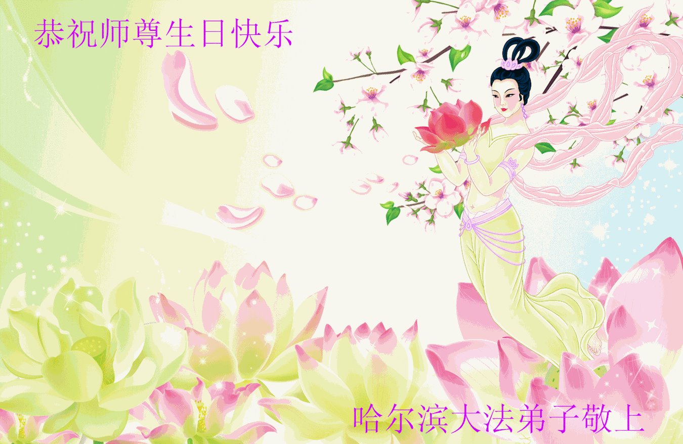 福建省福州市一大法弟子在贺词中说:“弟子双手合十,发自心底的恭祝慈悲伟大的师父华诞!每当5·13这辉煌的日子到来之际,弟子内心都充满对师父的无比感恩和思念。是师父把我脱胎换骨,重塑成一个全新的真我。”