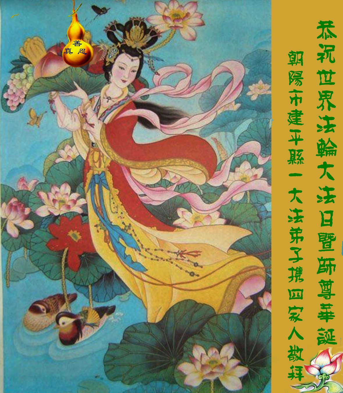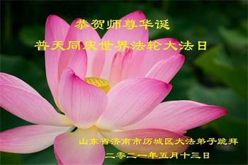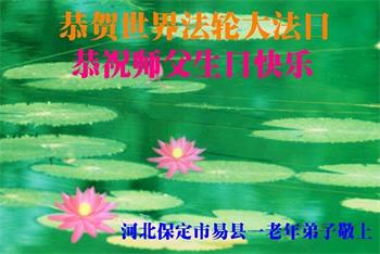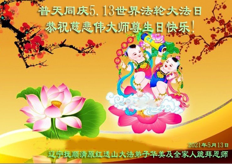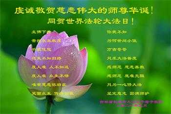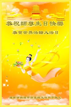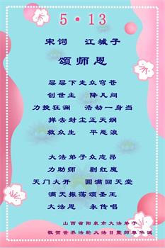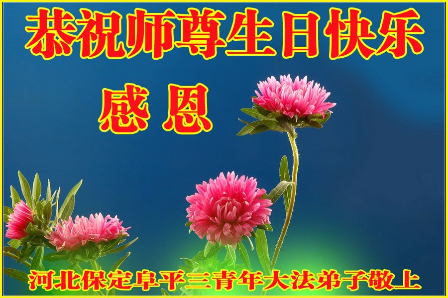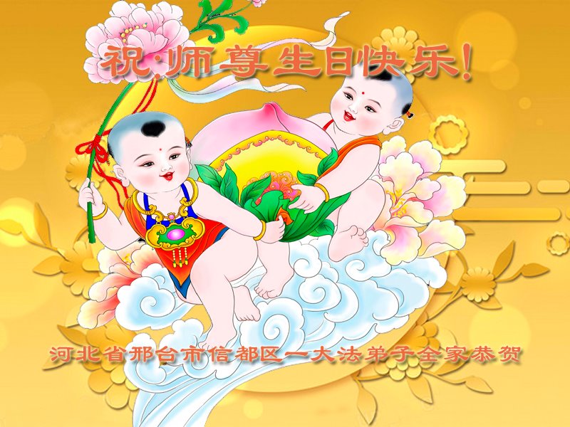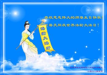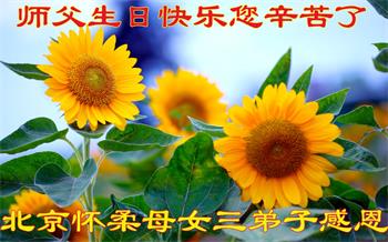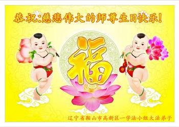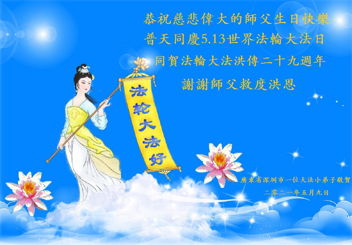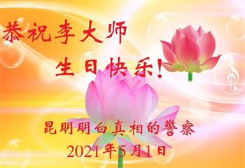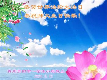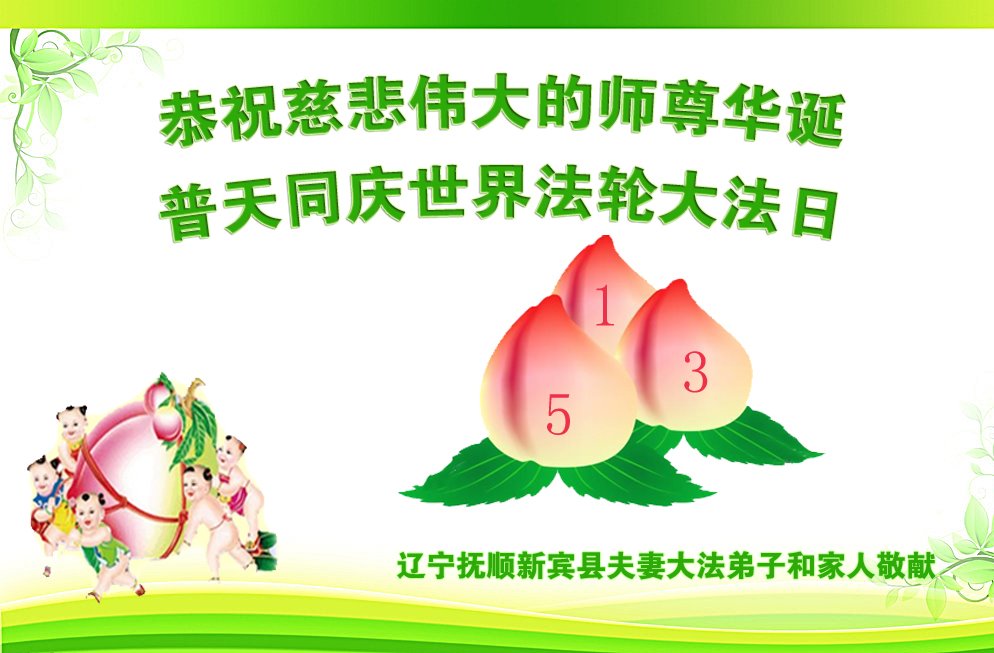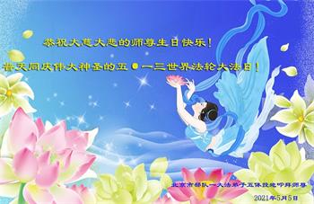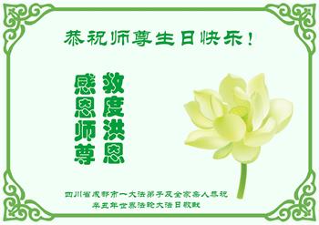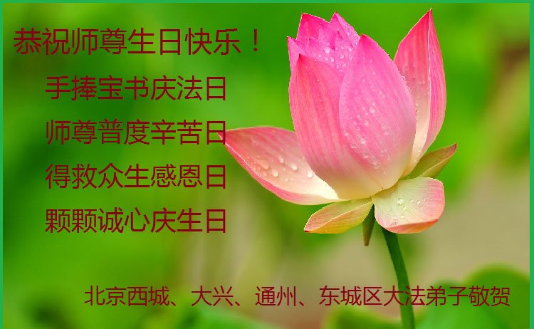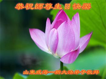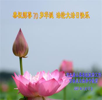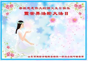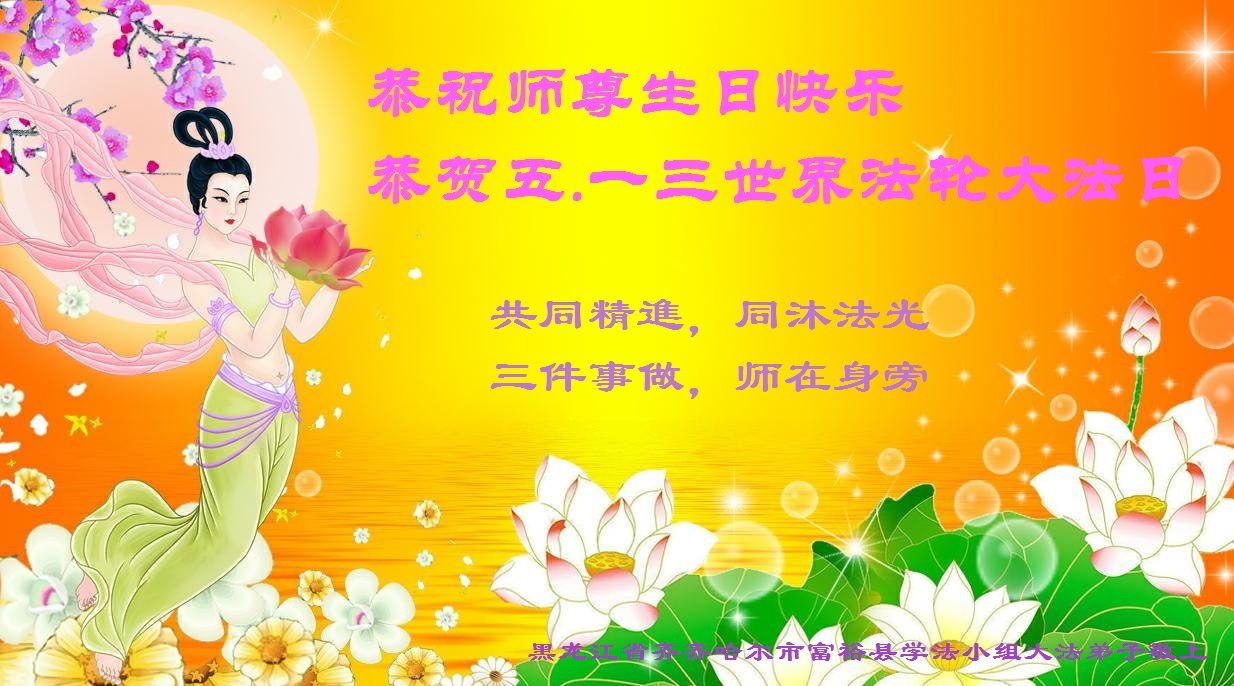 福建省福州市一大法弟子在贺词中说:“弟子双手合十,发自心底的恭祝慈悲伟大的师父华诞!每当5·13这辉煌的日子到来之际,弟子内心都充满对师父的无比感恩和思念。是师父把我脱胎换骨,重塑成一个全新的真我。”