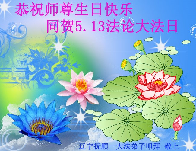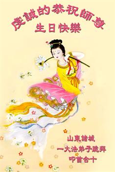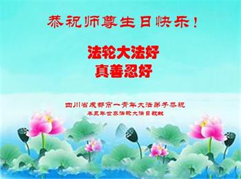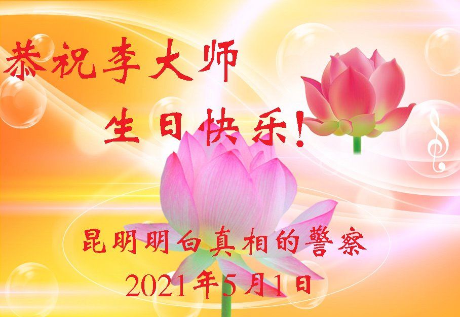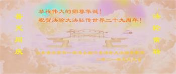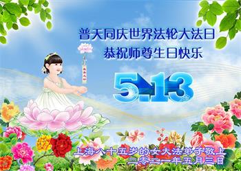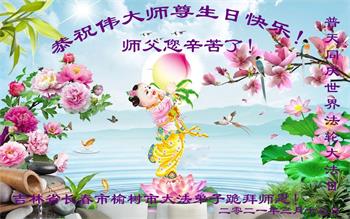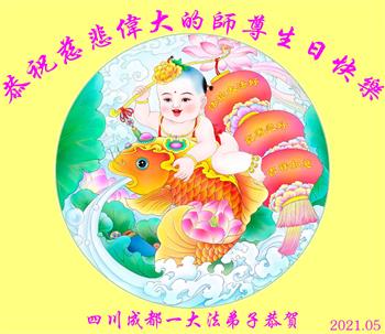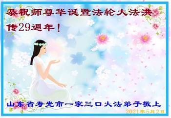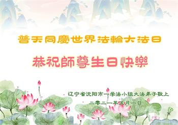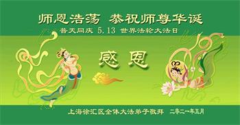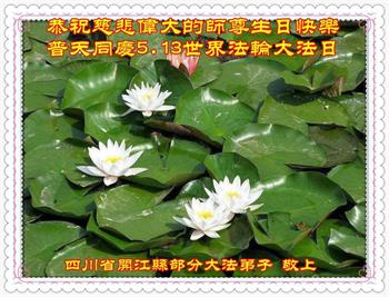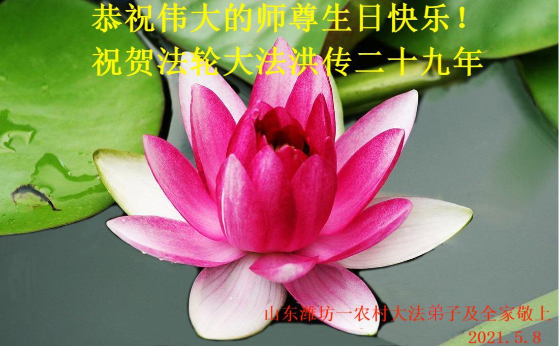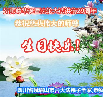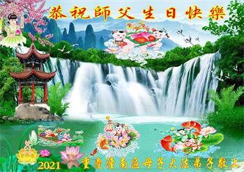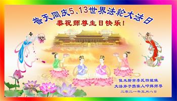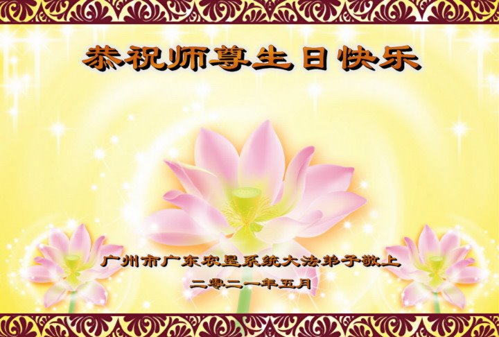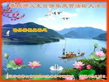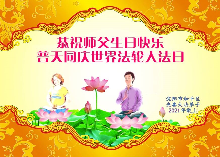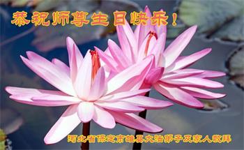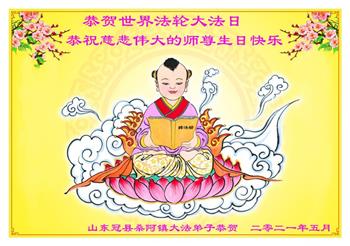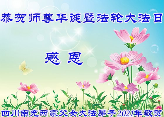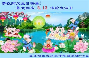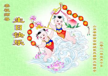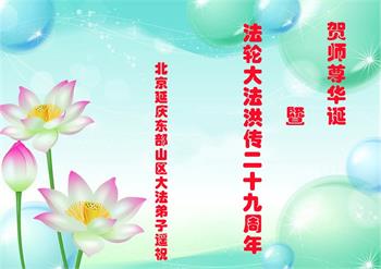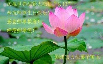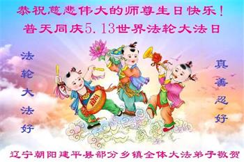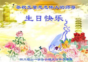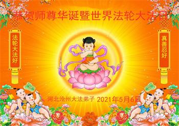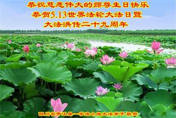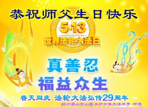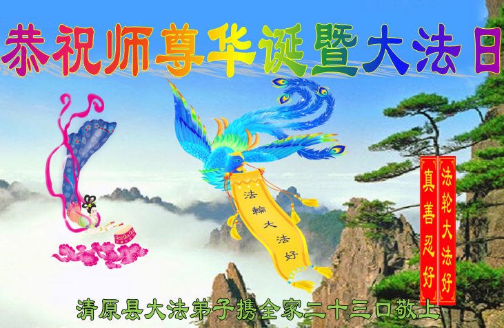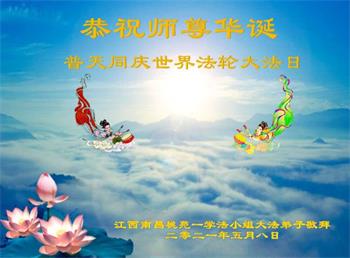 福建省福州市一大法弟子在贺词中说:“弟子双手合十,发自心底的恭祝慈悲伟大的师父华诞!每当5·13这辉煌的日子到来之际,弟子内心都充满对师父的无比感恩和思念。是师父把我脱胎换骨,重塑成一个全新的真我。”