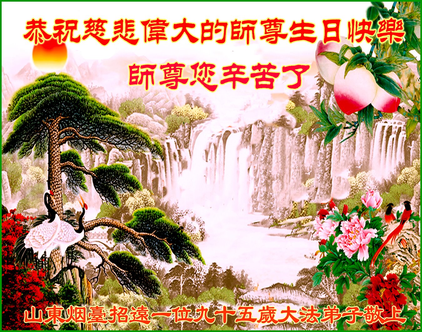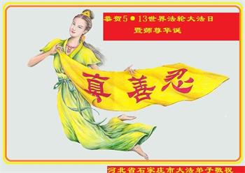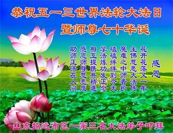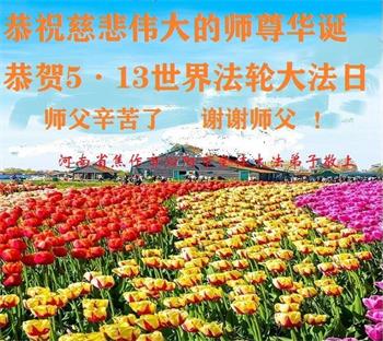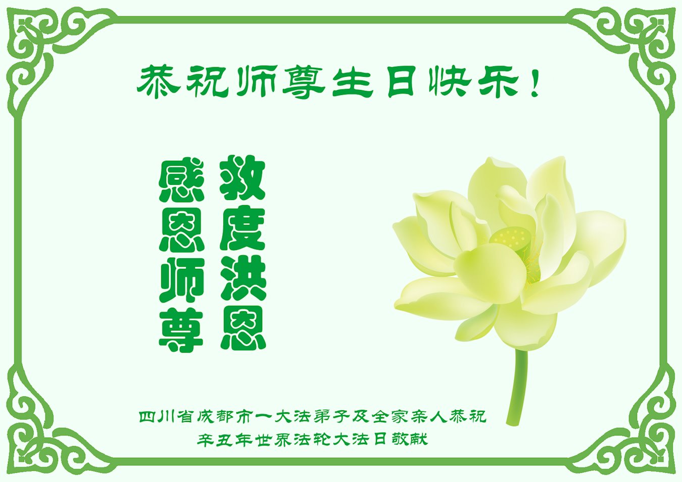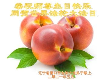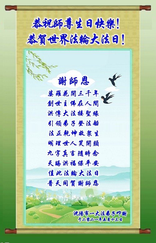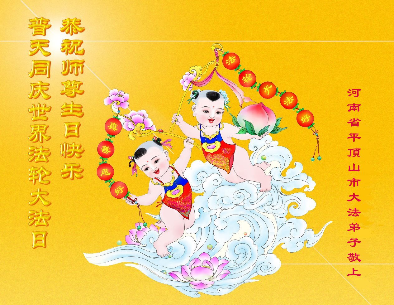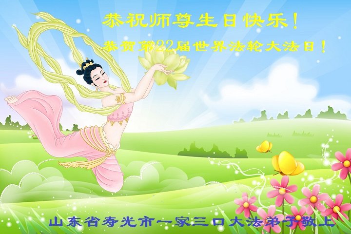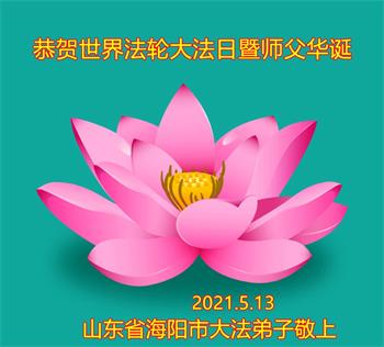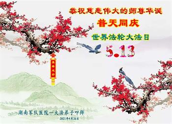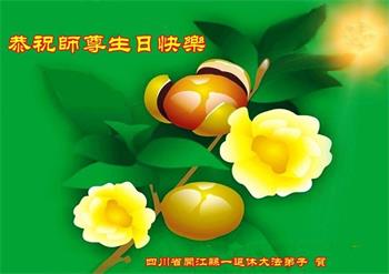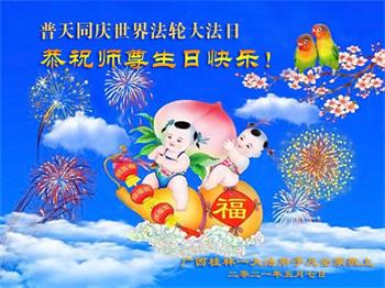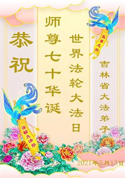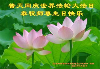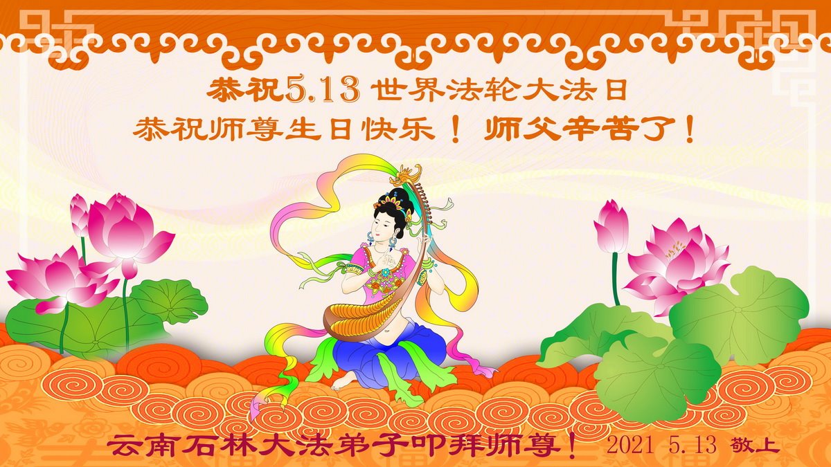 福建省福州市一大法弟子在贺词中说:“弟子双手合十,发自心底的恭祝慈悲伟大的师父华诞!每当5·13这辉煌的日子到来之际,弟子内心都充满对师父的无比感恩和思念。是师父把我脱胎换骨,重塑成一个全新的真我。”