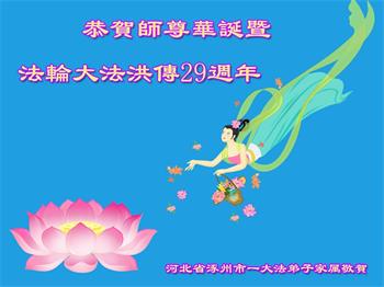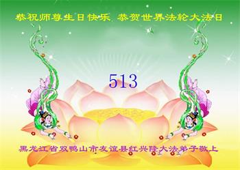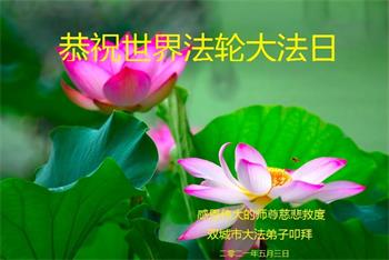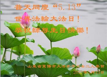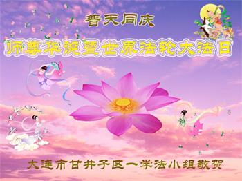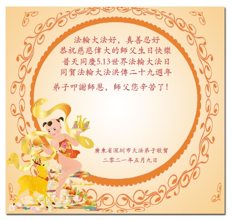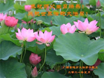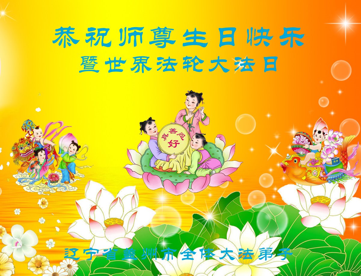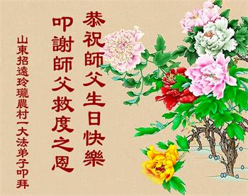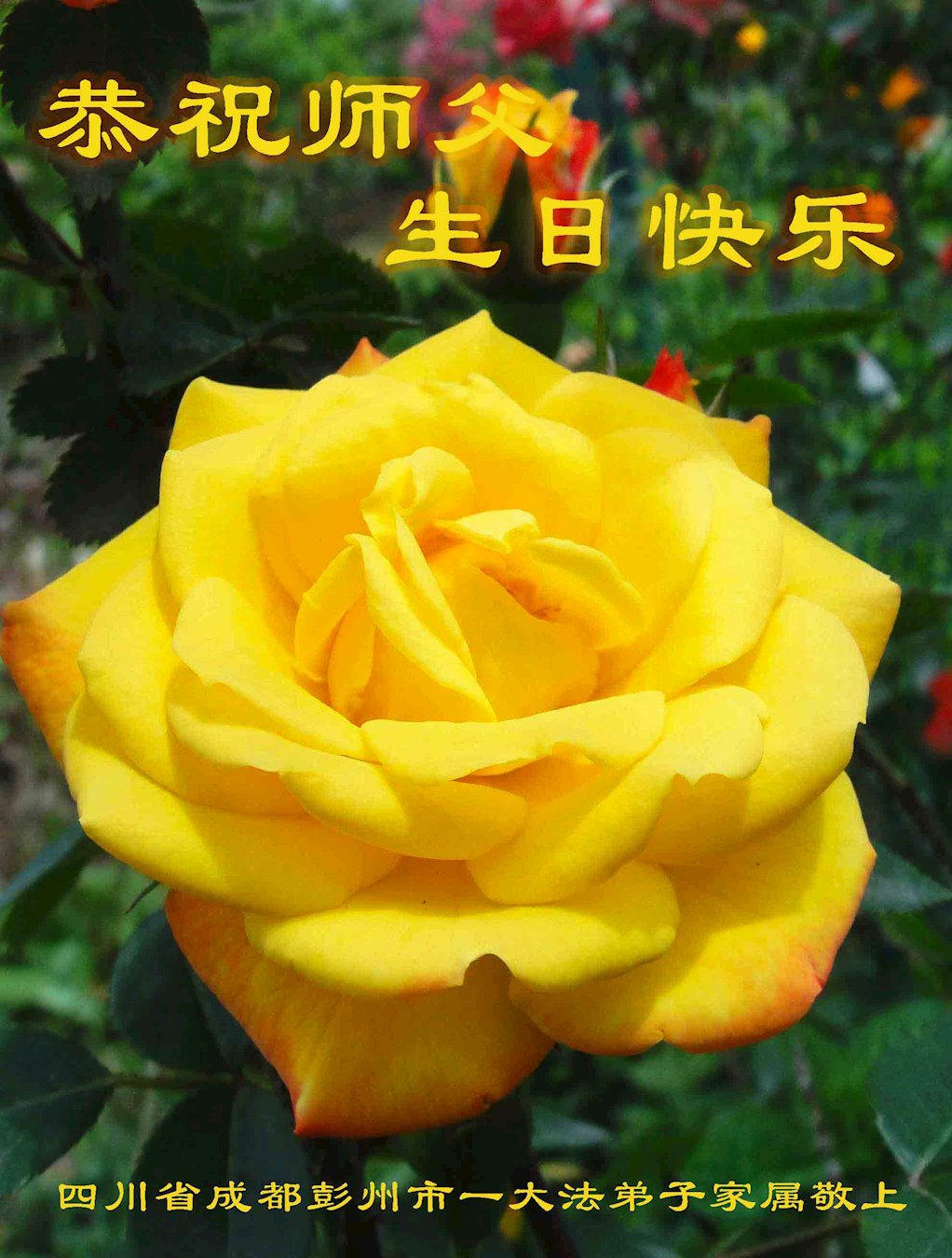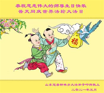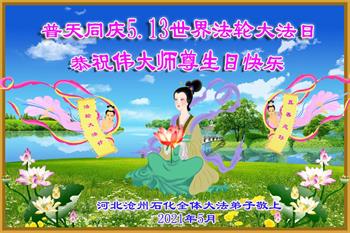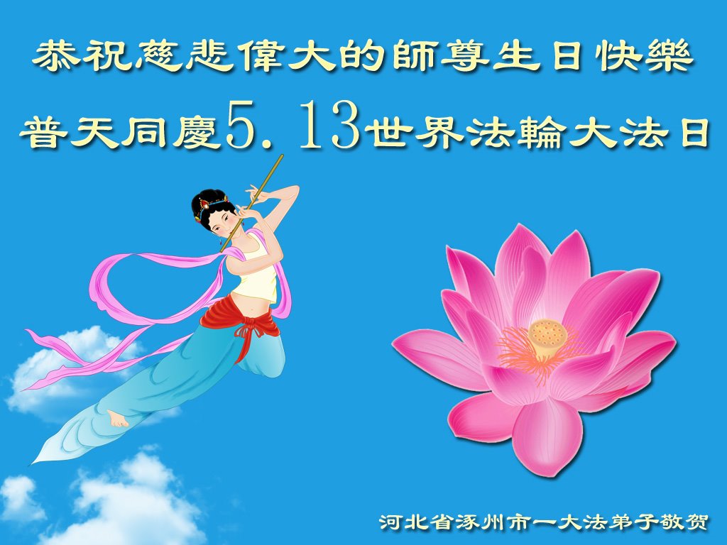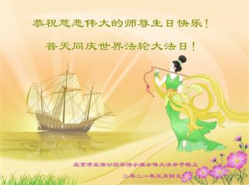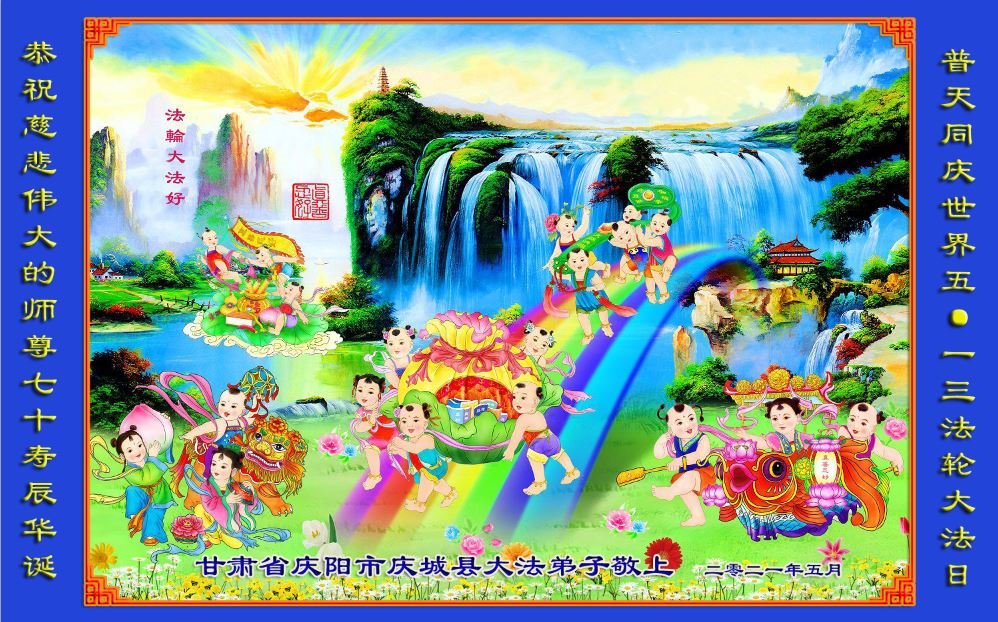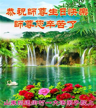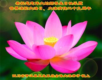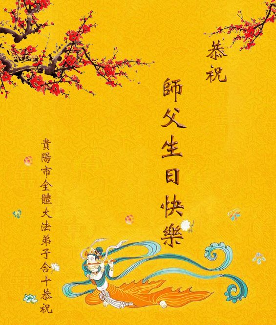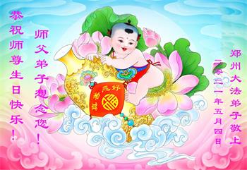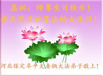 福建省福州市一大法弟子在贺词中说:“弟子双手合十,发自心底的恭祝慈悲伟大的师父华诞!每当5·13这辉煌的日子到来之际,弟子内心都充满对师父的无比感恩和思念。是师父把我脱胎换骨,重塑成一个全新的真我。”