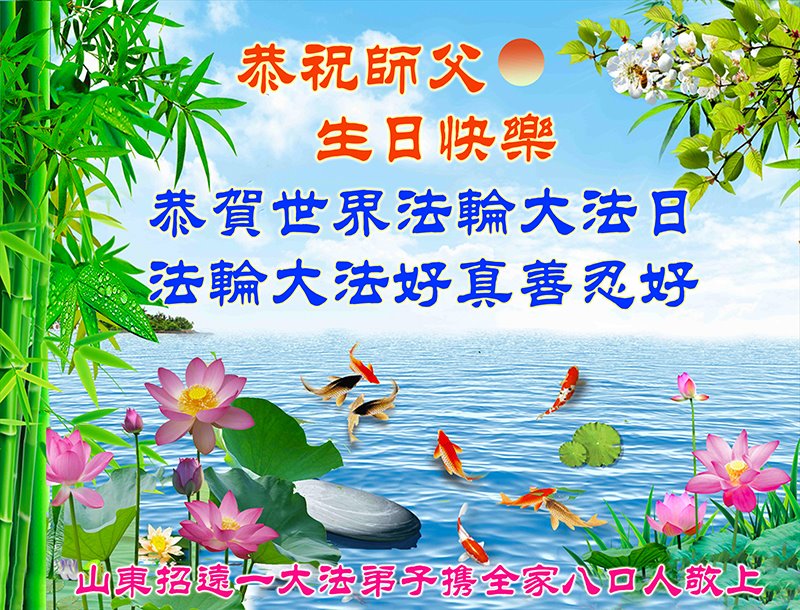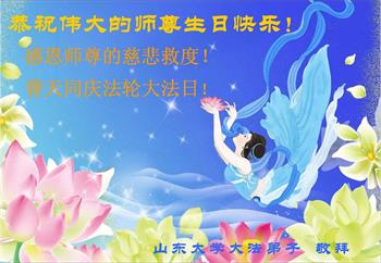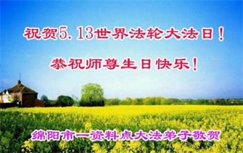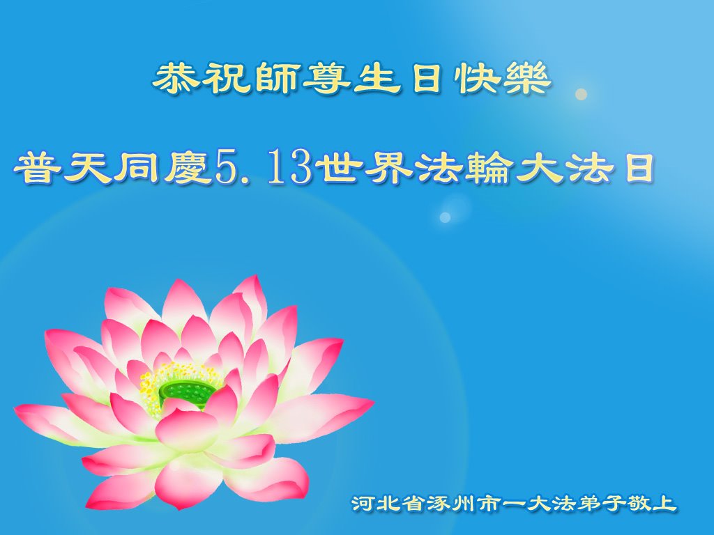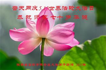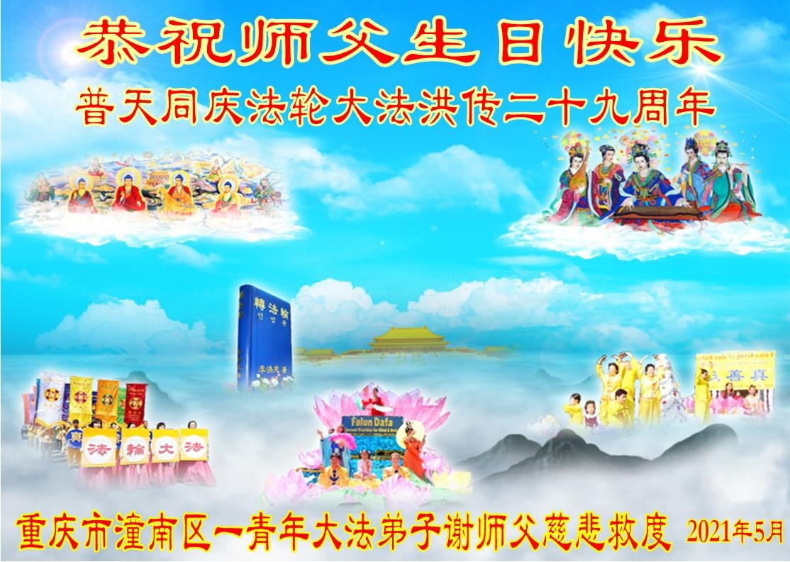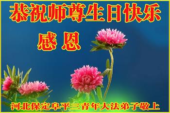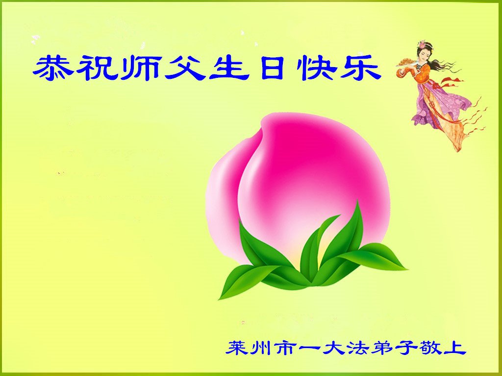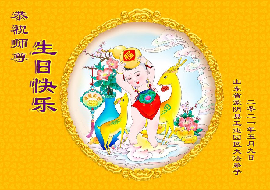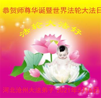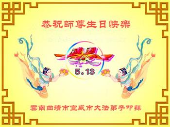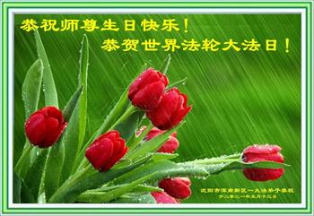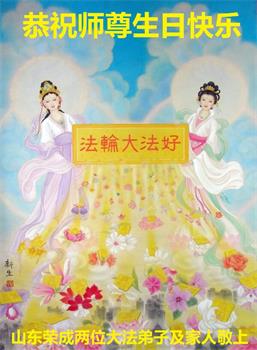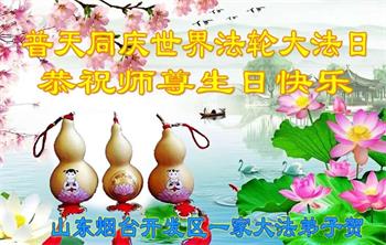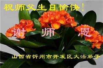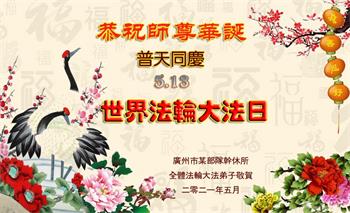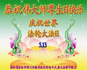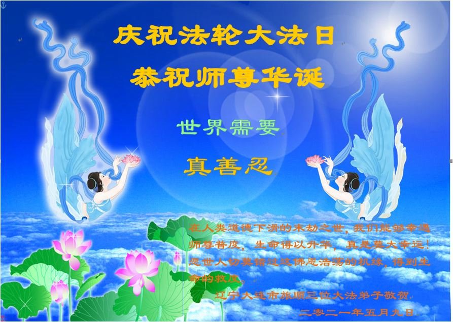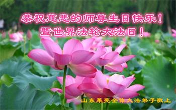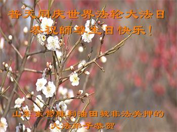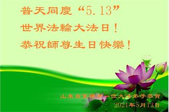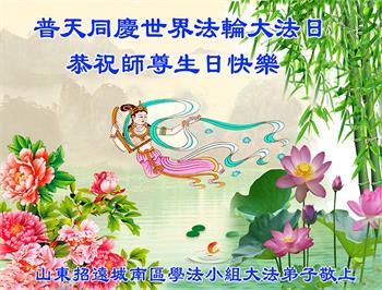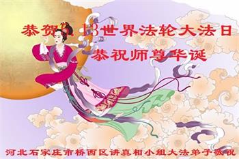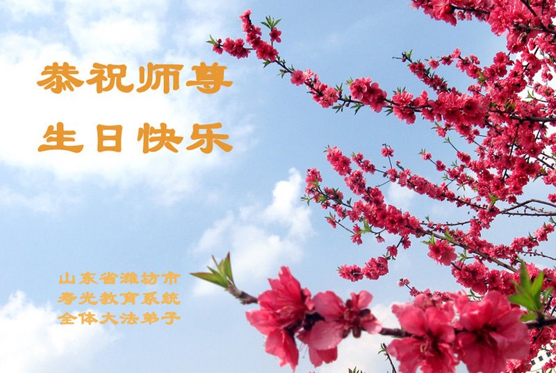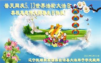 福建省福州市一大法弟子在贺词中说:“弟子双手合十,发自心底的恭祝慈悲伟大的师父华诞!每当5·13这辉煌的日子到来之际,弟子内心都充满对师父的无比感恩和思念。是师父把我脱胎换骨,重塑成一个全新的真我。”