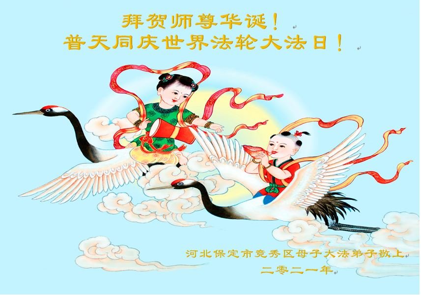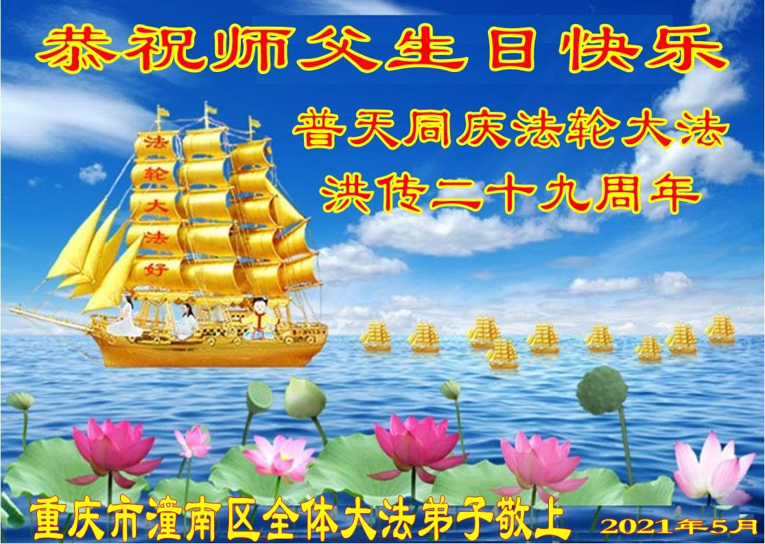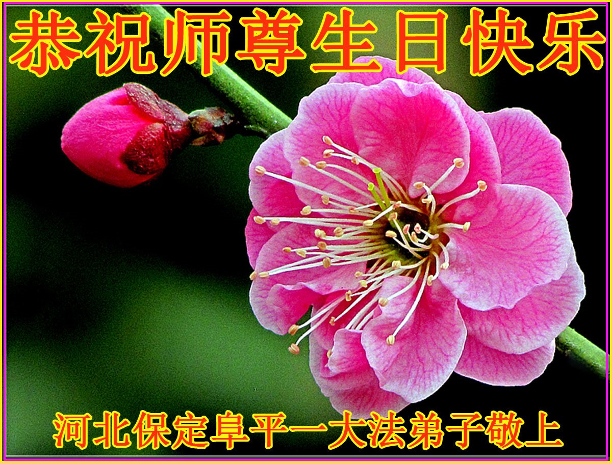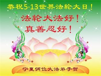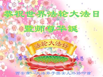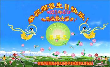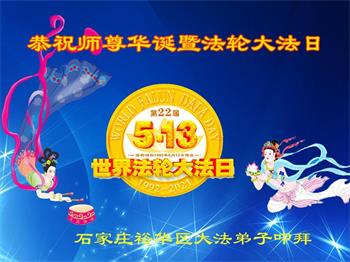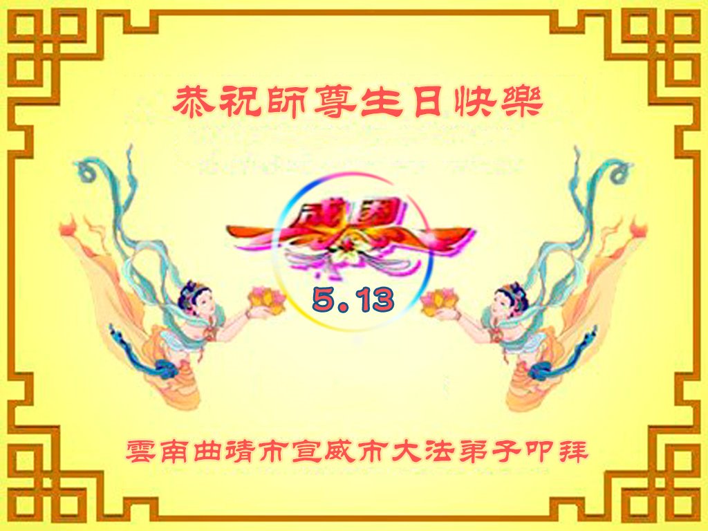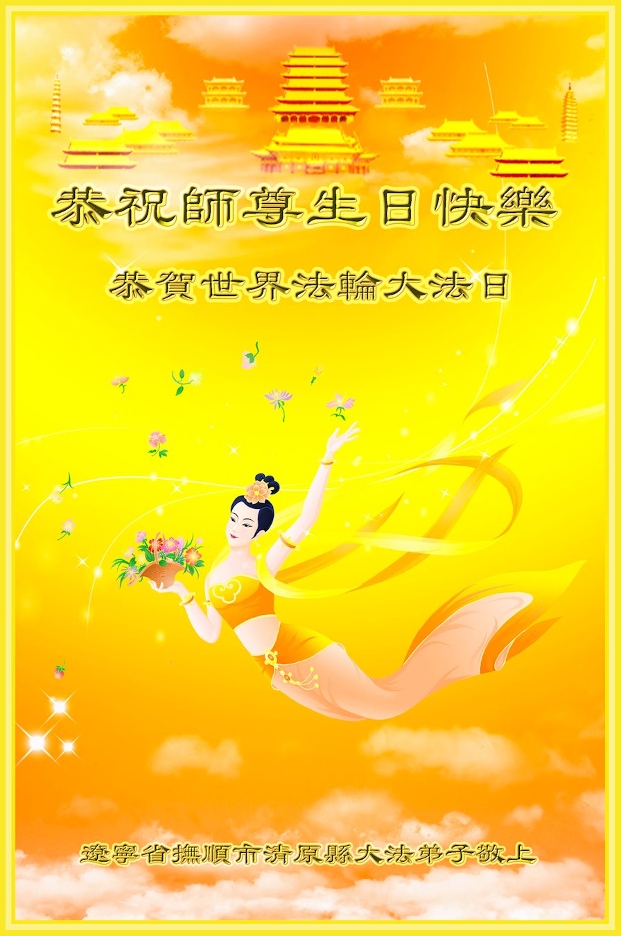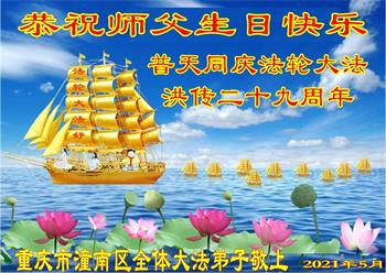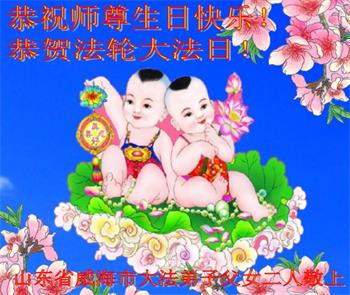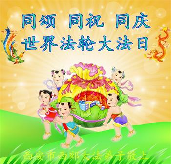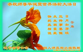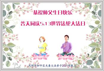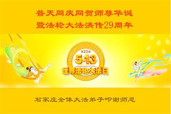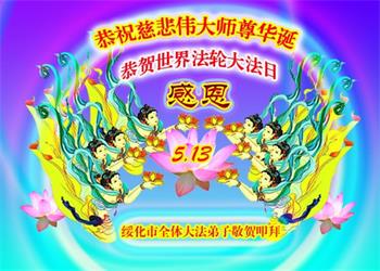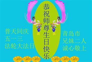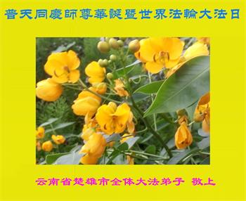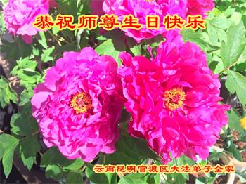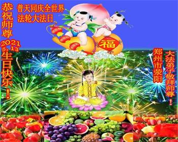 福建省福州市一大法弟子在贺词中说:“弟子双手合十,发自心底的恭祝慈悲伟大的师父华诞!每当5·13这辉煌的日子到来之际,弟子内心都充满对师父的无比感恩和思念。是师父把我脱胎换骨,重塑成一个全新的真我。”