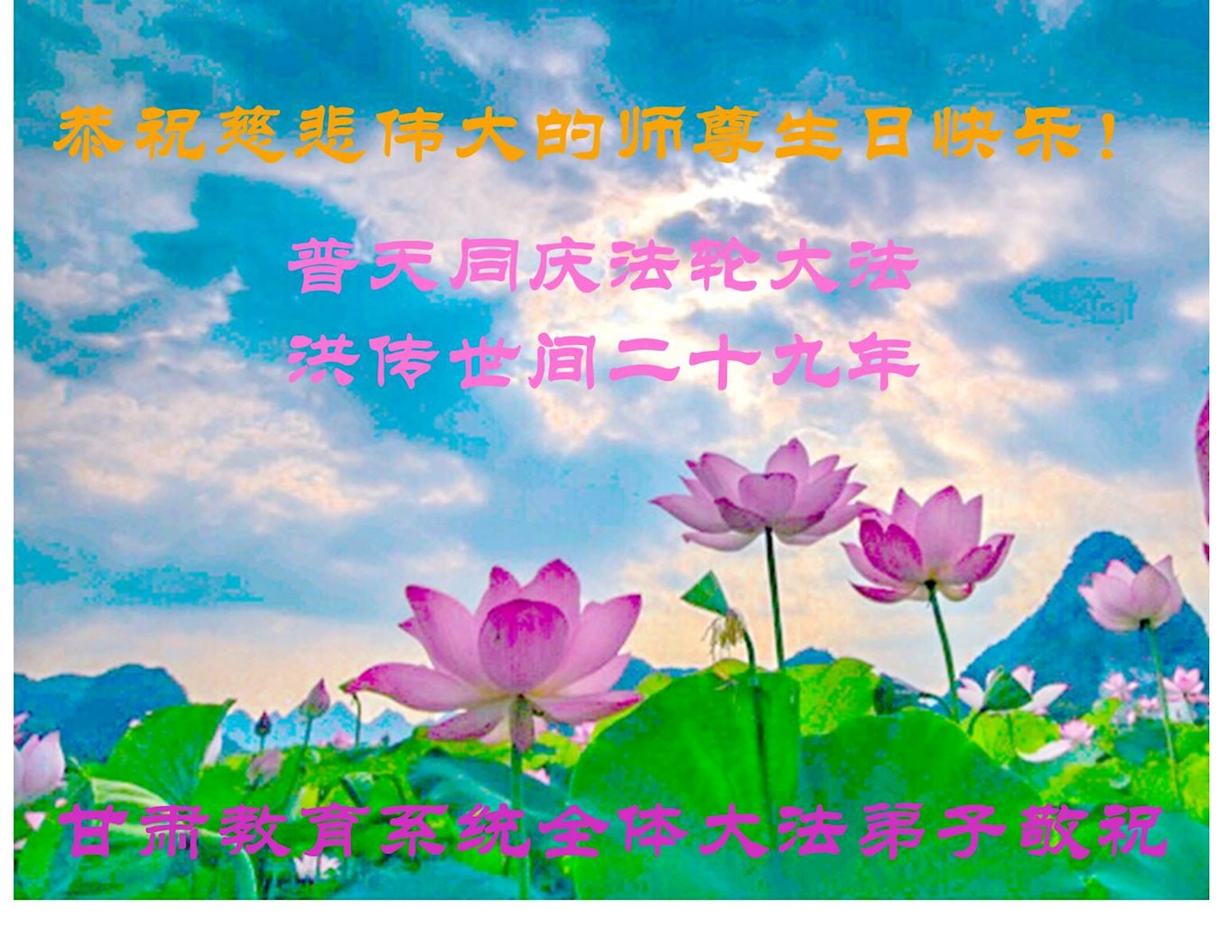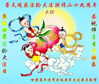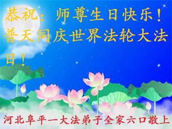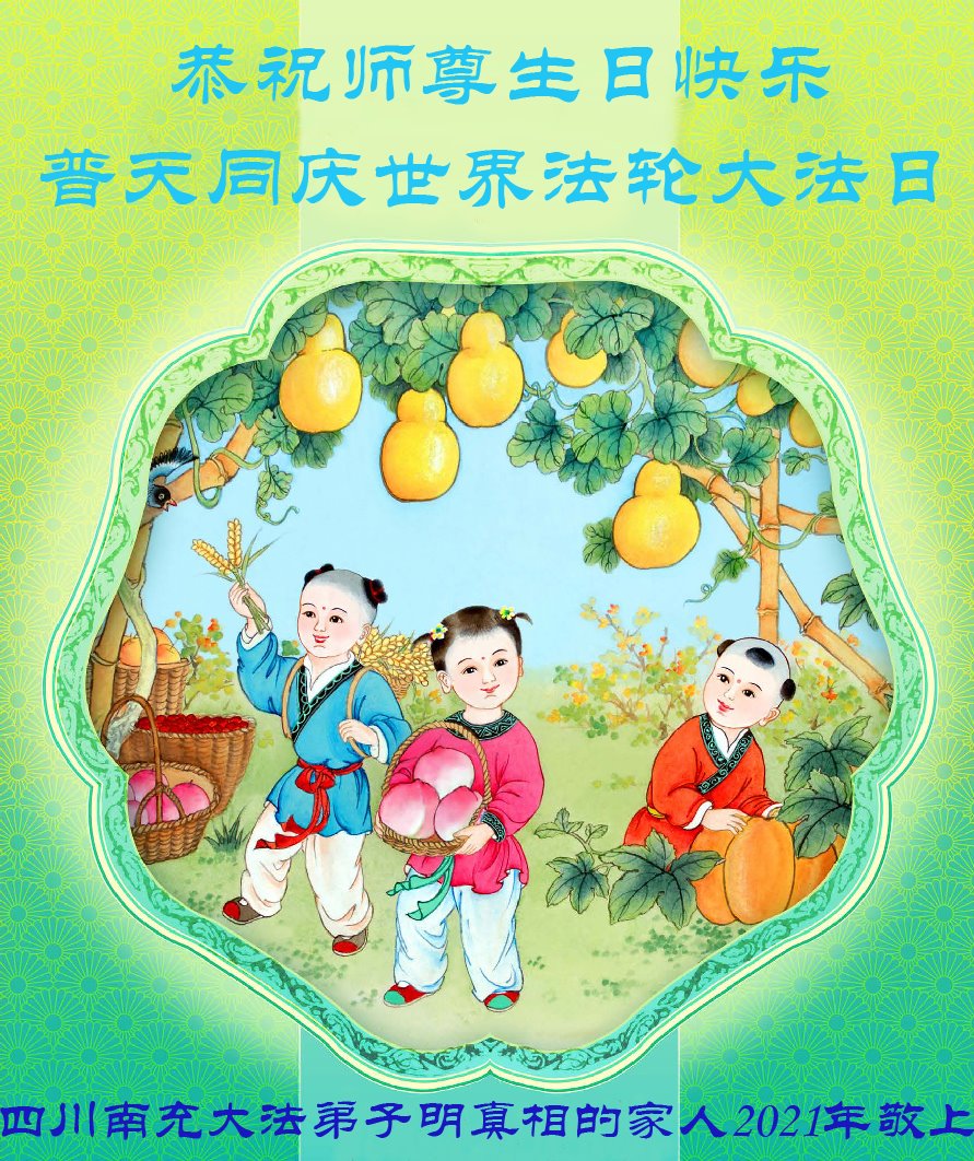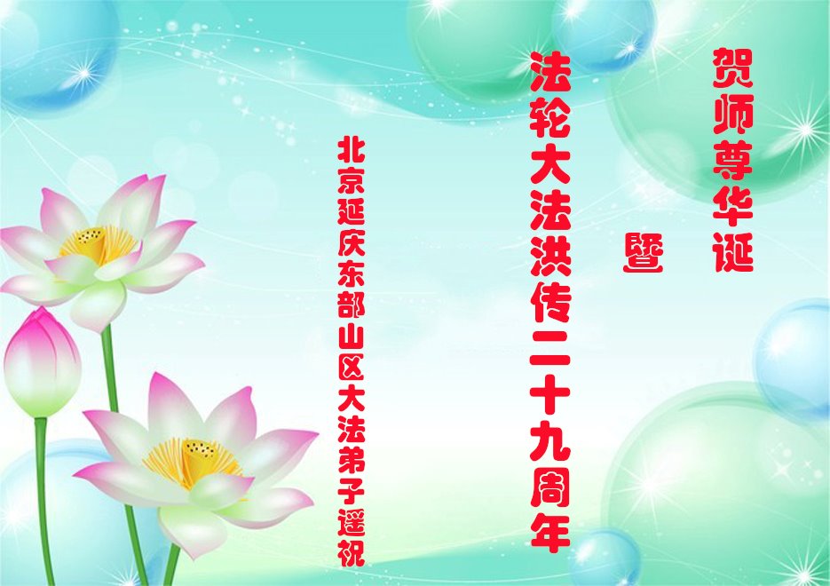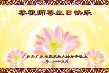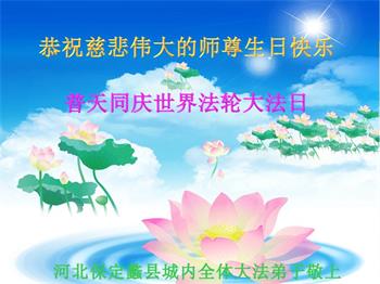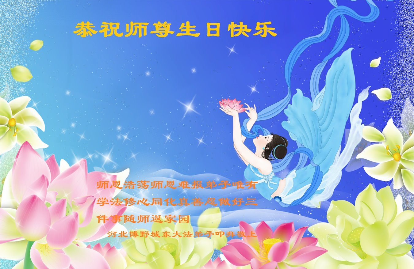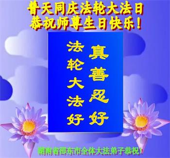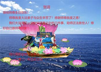 下面是来自北京市、天津市、上海市、重庆市、黑龙江省、吉林省、辽宁省、甘肃省、青海省、河北省、河南省、山东省、安徽省、浙江省、江苏省、江西省、陕西省、山西省、湖北省、湖南省、四川省、贵州省、广东省、云南省、福建省、海南省、新疆维吾尔自治区、内蒙古自治区、广西壮族自治区、宁夏回族自治区的法轮功学员敬致师尊的部份贺词。