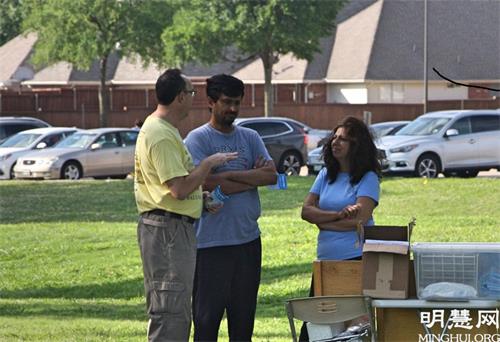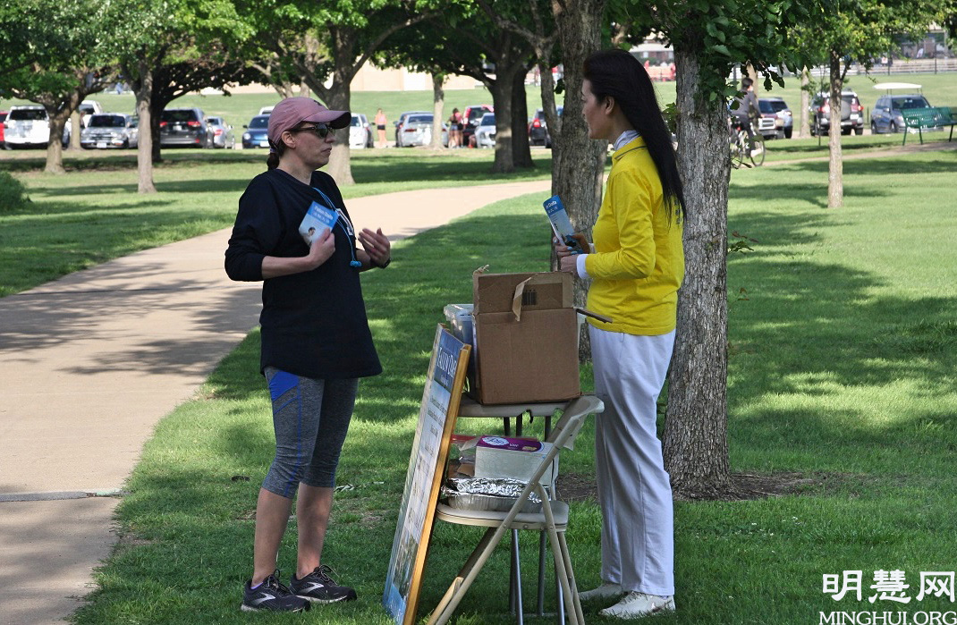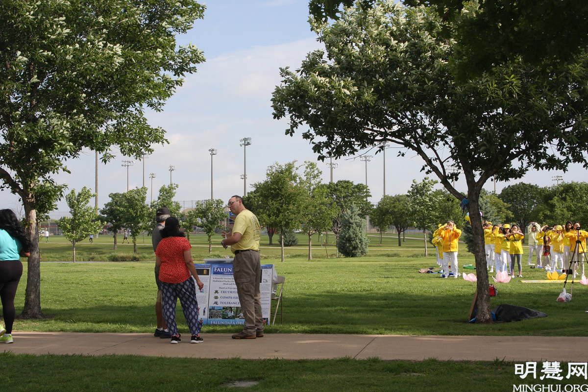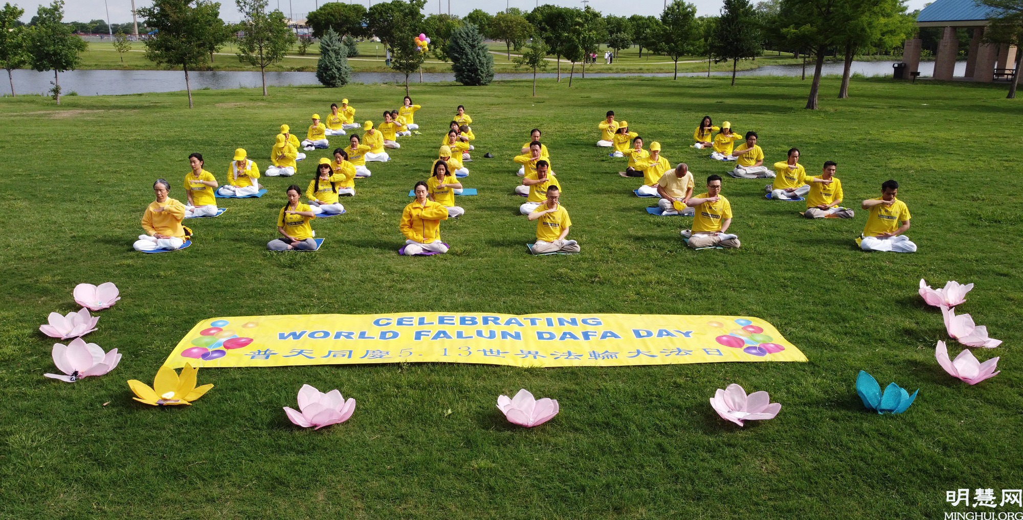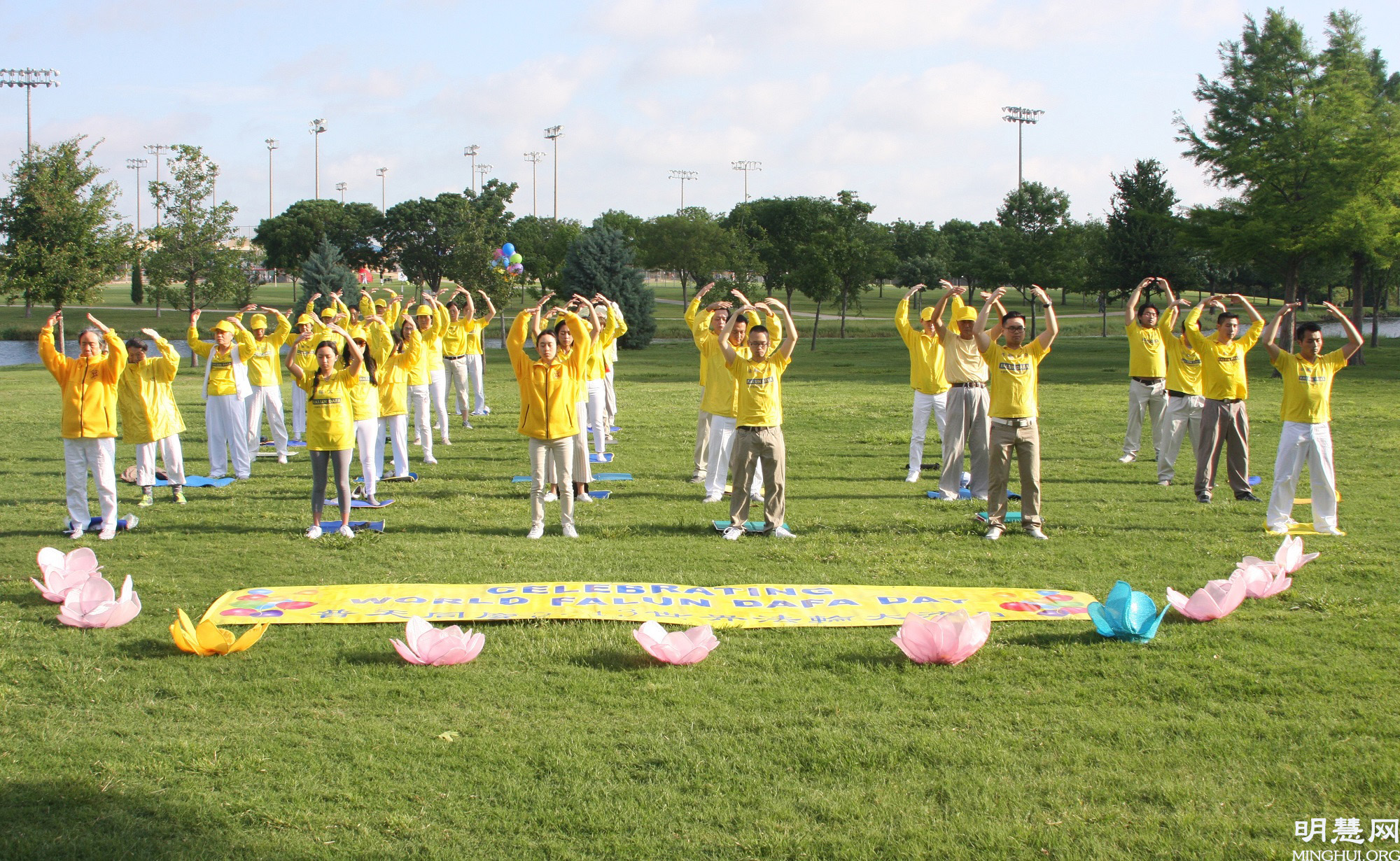 达拉斯五月的天气宜人,天空湛蓝、白云轻飘,公园里绿草茵茵,春风拂面。法轮功学员们展开“庆祝世界法轮大法日”的大型横幅,身着明黄色的T-恤衫、白色衣裤集体炼功。美好的景象吸引着来公园散步、锻炼的居民们频频驻足,询问有关法轮功的信息。