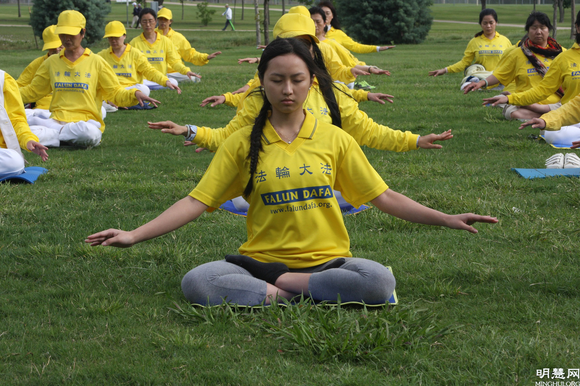 ![]() 图8:法轮功学员张女士和女儿参加庆祝世界法轮大法日的集体炼功活动。 |