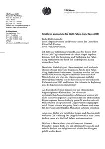 就象在法兰克福一样,在全世界其它地方,人们都应该能够在没有恐惧和压制的情况下修炼法轮功。今天你们为此发出了一个明确的信号!