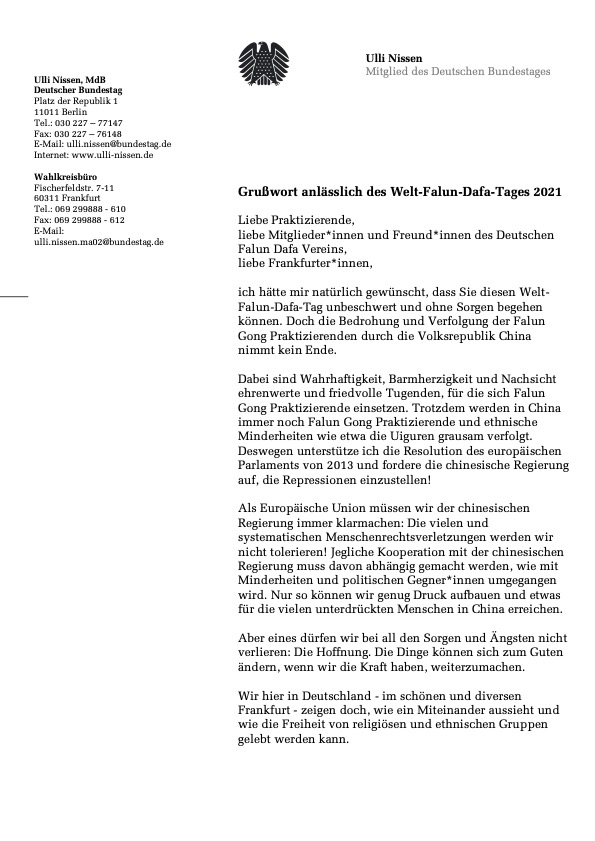 乌莉·尼森是来自法兰克福的德国联邦议会议员,她在贺信中称赞真、善、忍是法轮功学员所尊崇的“可敬的和平的美德”,谴责中共对法轮功学员的迫害,并表示支持欧洲议会于二零一三年做出的决定,即谴责中共活摘法轮功学员及良心犯器官的罪行。