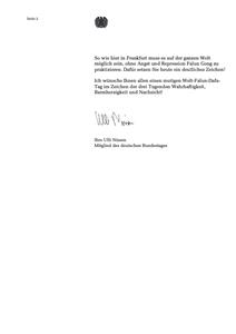因此,作为黑森州议会绿党议员,我们要求中共立即停止对法轮功学员的迫害和施暴。我们要求中国政府,根据国际规范和国家法律保障包括法轮功修炼者在内的人权。