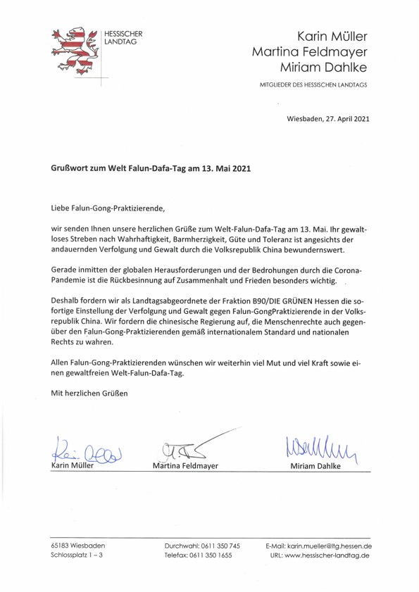 黑森州议会绿党议员、黑森州副议长卡琳·穆勒 (Karin Müller ),以及绿党议员玛蒂娜·费德迈尔(Martina Feldmayer)和米莉昂·达尔克(Miriam Dahlke)共同发来贺信,祝贺世界法轮大法日,表示十分钦佩法轮功学员面对迫害始终坚持真、善、忍理念的精神,并要求中共立即停止对法轮功学员的迫害。