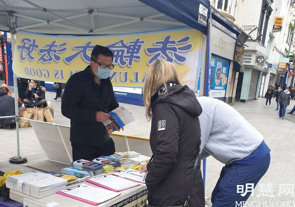 一位老年的英国女士在征签板上签字后,一脸严肃地问:“这件事(指中共迫害法轮大法)多长时间了? ”学员告诉她:“中共从1999年就开始了迫害,已经20多年了。”她又问:“你们做这件事(指讲真相) 多少年了?”学员说:“从迫害开始时就一直向全世界讲真相,直至今日。”