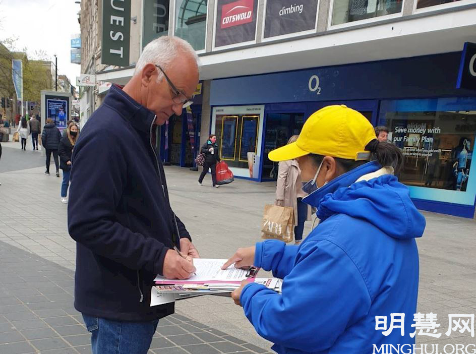 很多路人主动来法轮功学员的摊位前签名支持。接近中午的时候,有一个英国老人在看摊位后方的展板。他签了名反迫害,还拿了几张传单。他说:“中共应该为它们干的这些坏事付出代价。先不说别的,就中共病毒(Covid-19)这个问责来说,中共应该为全世界生命负责。这么多人都被瘟疫害死了,全世界的政府都应向它追责。”