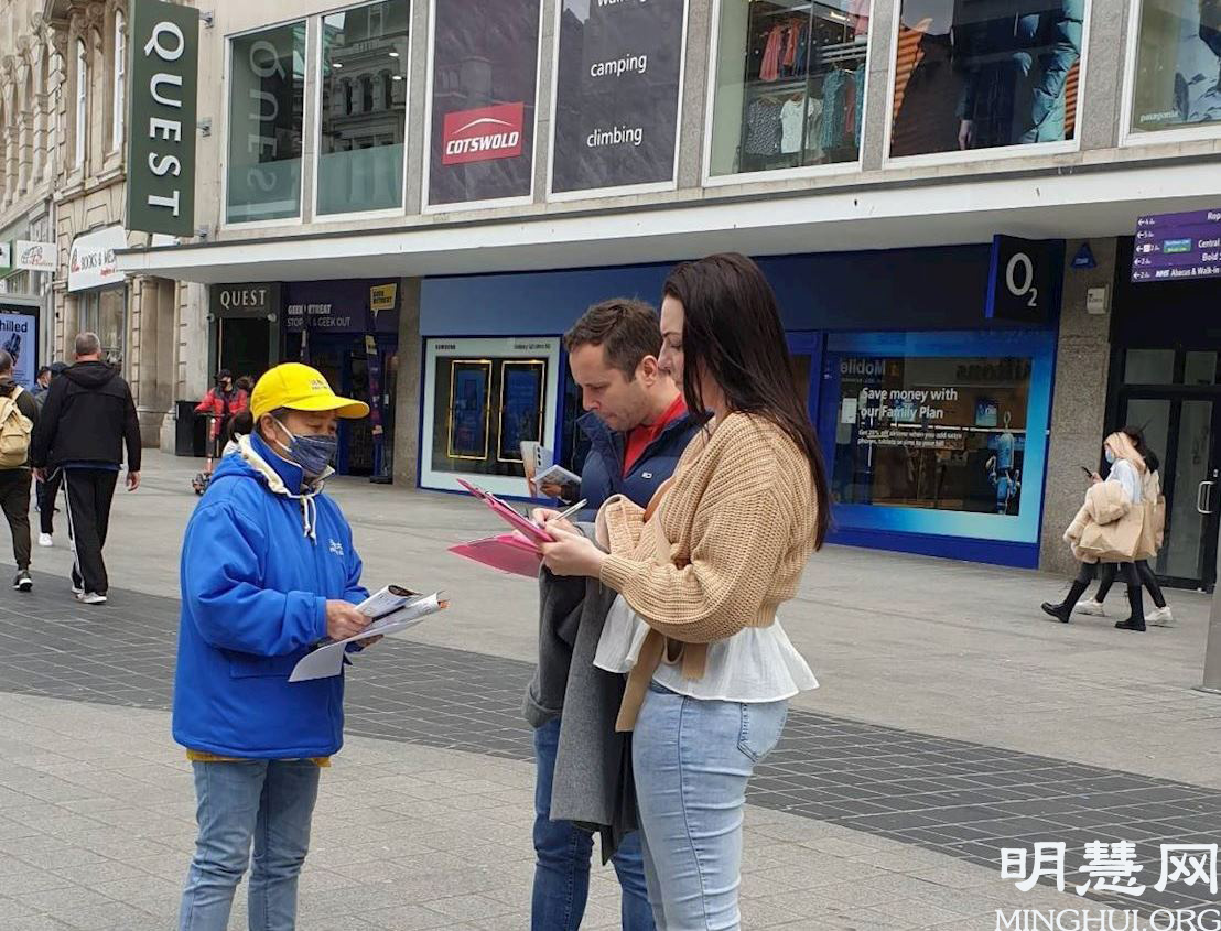 利物浦一位老华侨接过真相传单认真看着,看了很久之后径直走了过来,情绪激动地指着传单上“天灭中共”几个字说:“我们全家就等着那一天,中共垮台的那一天。”