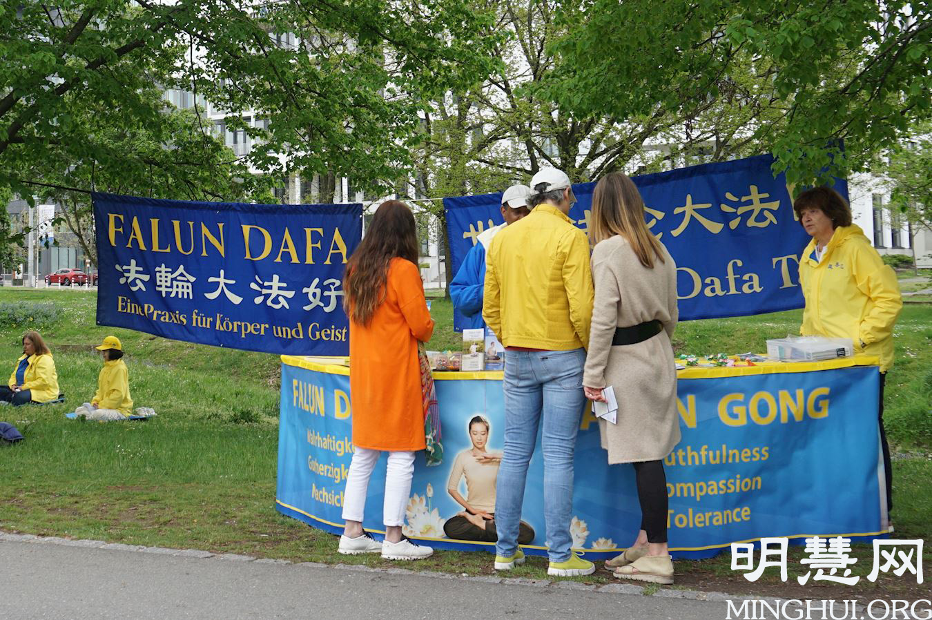 行人有的驻足观望学员炼功,有的走到展板前仔细阅读,有的直接到展位前与学员交谈,希望能了解更多的信息。在了解真相后,人们纷纷签名,支持法轮功学员反迫害。