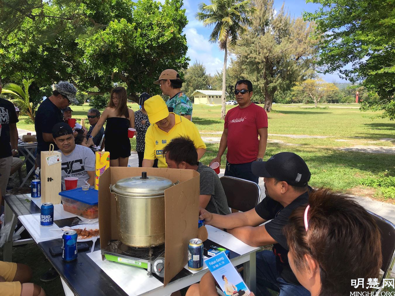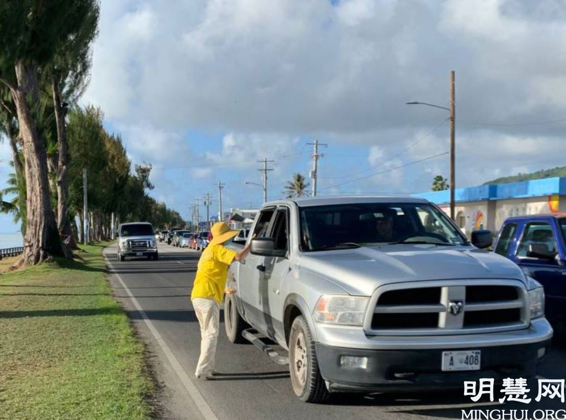 ![]() 图2:和塞班岛民众交谈,传递大法的真相传单 |