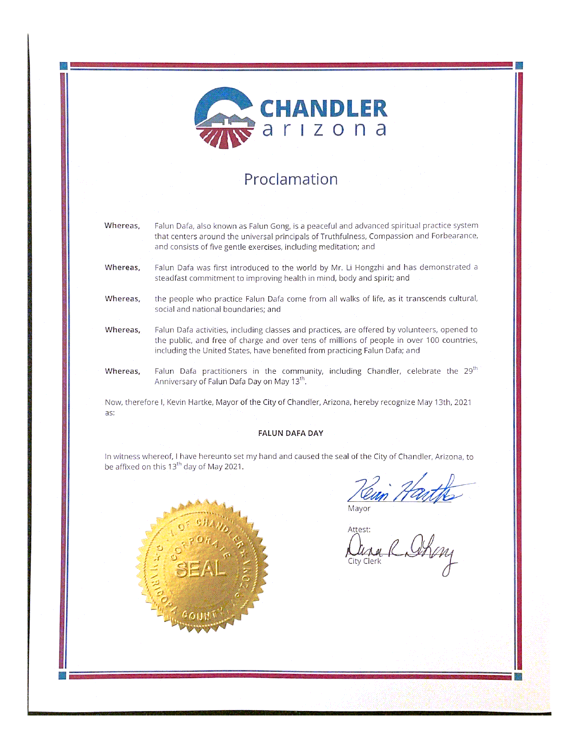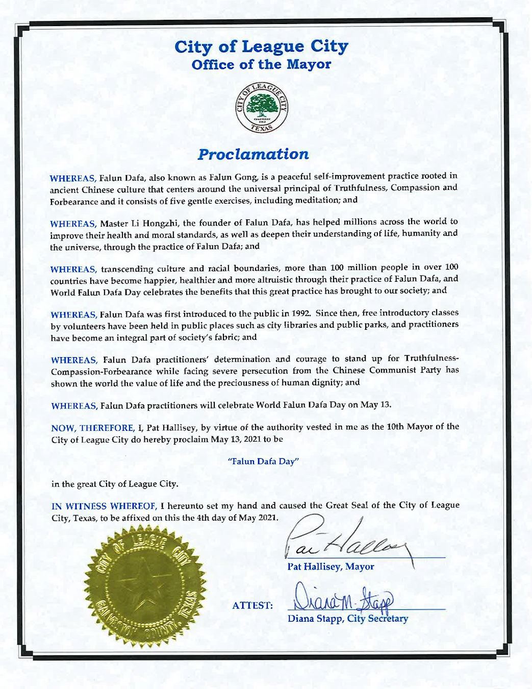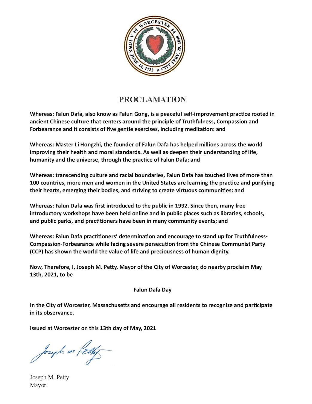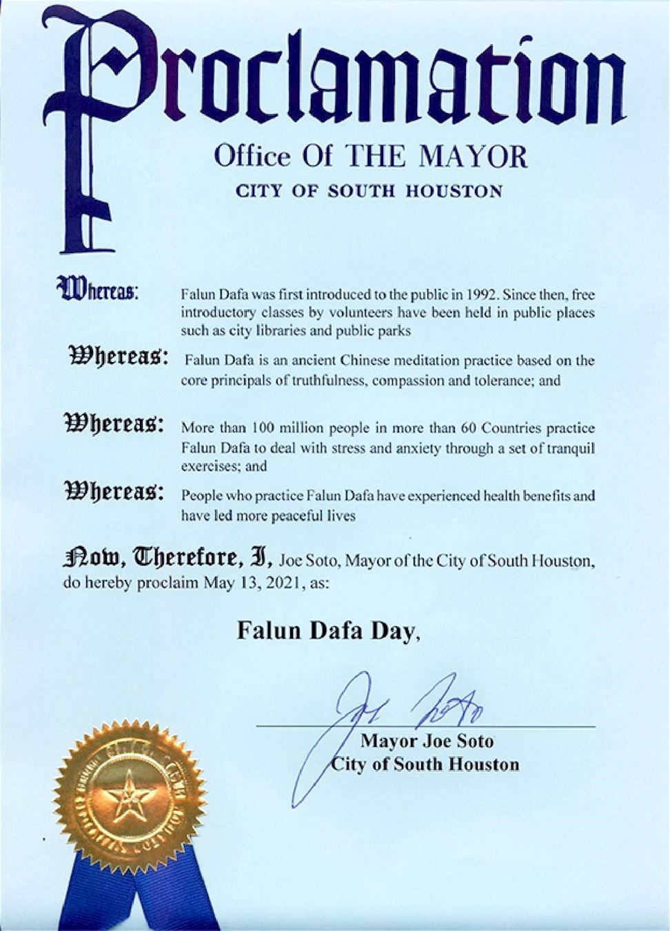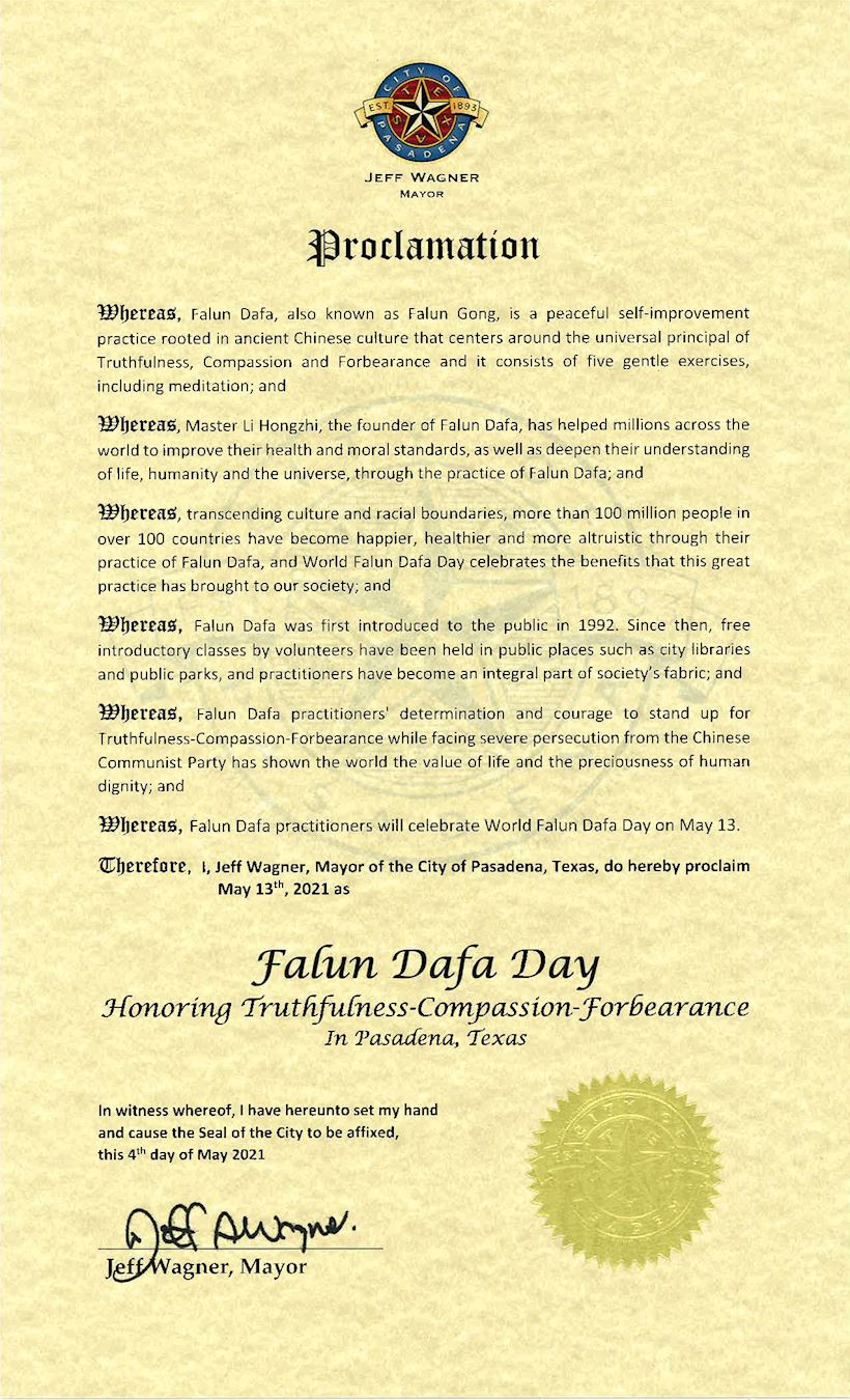 鉴于,二零二一年是法轮大法洪传的第二十九周年,修炼者在修炼法轮大法后身体得到明显改善;