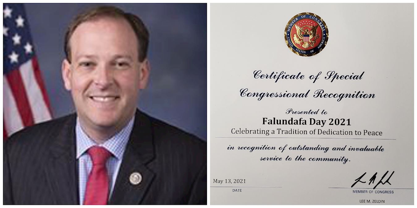 ![]() 图2:纽约州第一选区国会议员李·米泽尔丁(Lee m. Zeldin)发来荣誉证书褒奖“法轮大法日”,赞赏法轮功学员二十一年一直坚守的平和理念。 |