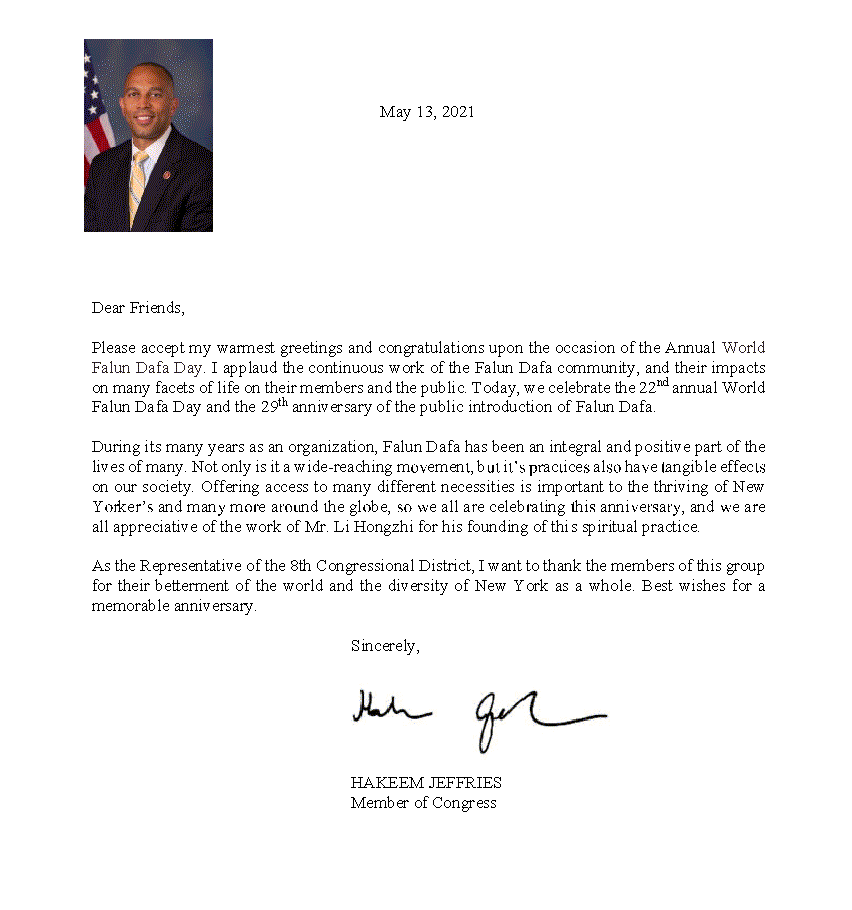 国会议员哈基姆·杰弗里斯(Hakeem Jeffries)在贺信中说:“在这一年一度的世界法轮大法日,请接受我最热烈的问候和祝贺。”