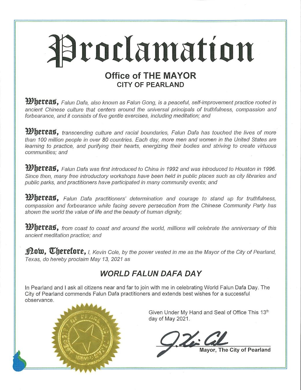 在此,美国众议院议员汤姆•瑞德呼吁社区所有的民众在法轮大法洪传二十九周年之际,褒奖二零二一年五月十三日为“世界法轮大法日”,并且认同法轮大法的价值和对全社会做出的杰出贡献。