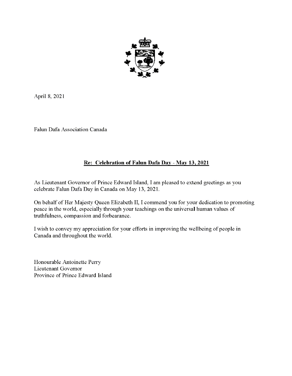 爱德华王子岛省督安托瓦内特·佩里(Antoinette Perry)在贺信中说:作为爱德华王子岛省的省督,我很高兴在2021年5月13日庆祝加拿大法轮大法日之际致以问候。