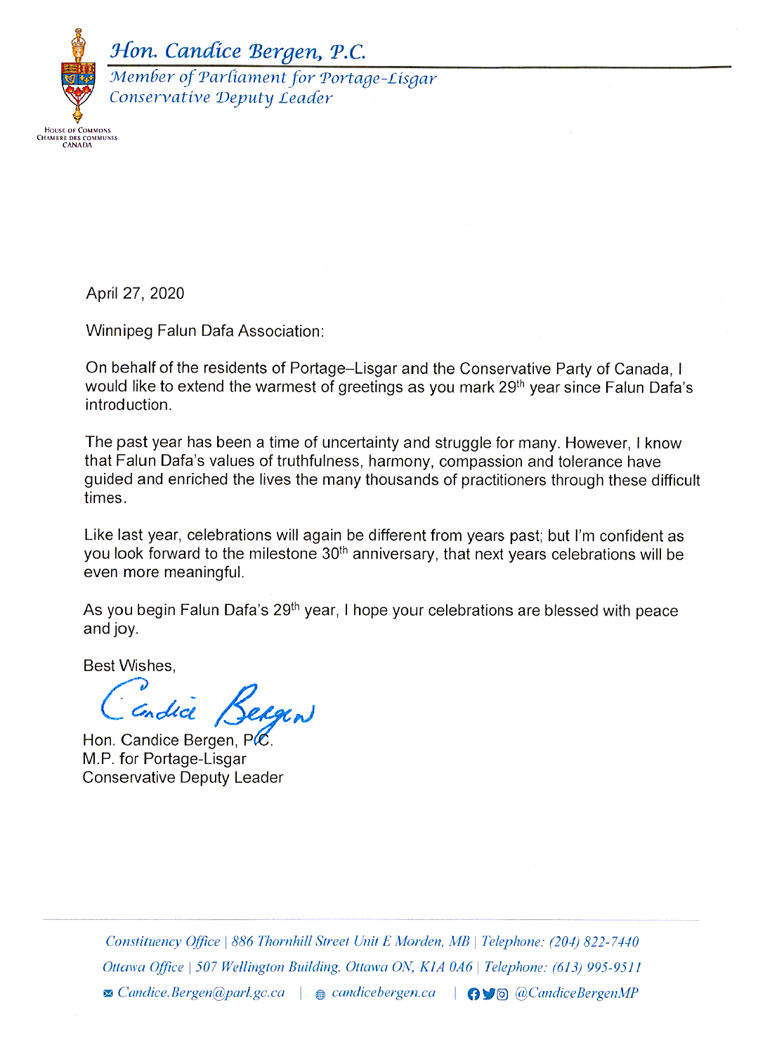 国会议员和保守党众议院议长坎迪斯·卑尔根(Hon. Candice Bergen)在贺信中说:我代表坎蒂丝·卑尔根的居民和加拿大保守党,在法轮大法弘传29周年之际表达我最热烈的问候。