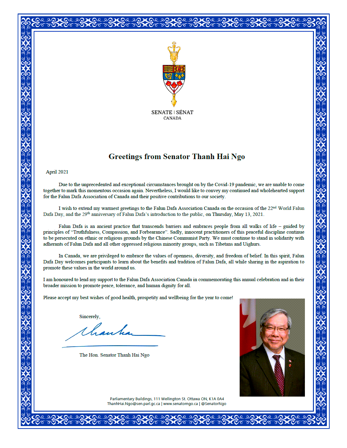 加拿大参议员吴蓝海(Thanh Hai Ngo)在贺信中表示:由于疫情大流行带来的前所未有的特殊情况,我们无法聚在一起来欢庆这个节日。 尽管如此,我想对加拿大法轮大法学会及其对社会的积极贡献表达我一如既往的全心全意的支持。
