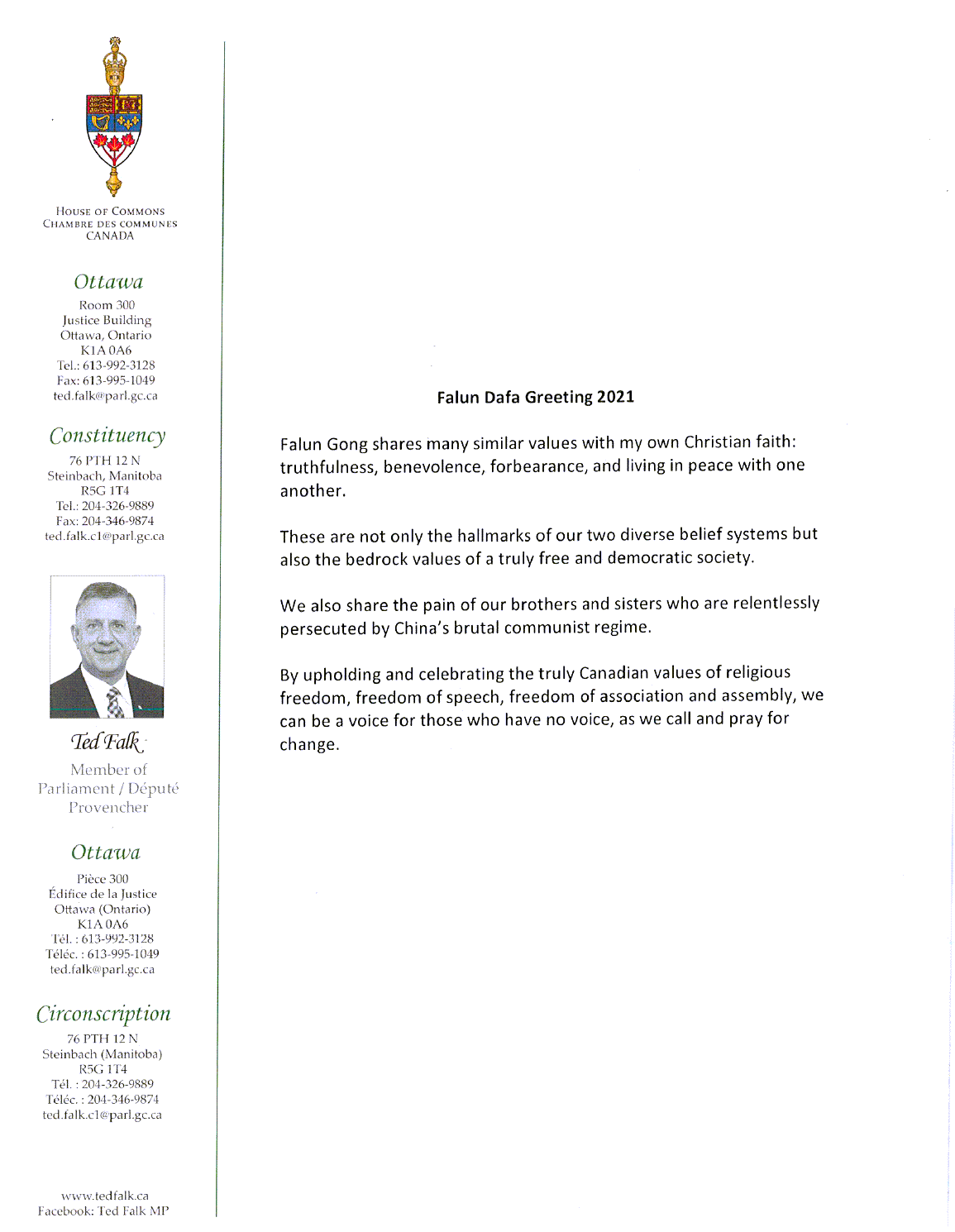 曼尼托巴国会议员-泰德·福克(ted Falk)的贺信:法轮功与我自己的基督徒信仰有许多类似的价值观:真、善、忍,与他人和平共处。