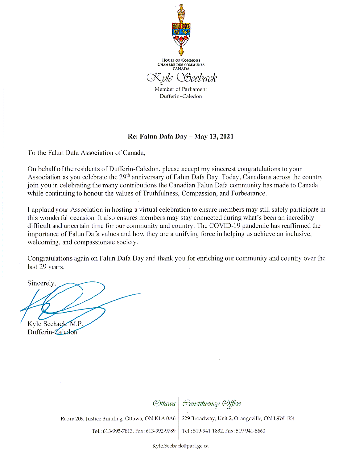 达弗林·卡尔顿国会议员- 凯尔·塞贝克(Kyle Seeback)说:在庆祝法轮大法29周年之际,我代表达弗林·卡尔顿的居民,向你们学会表示最诚挚的祝贺。