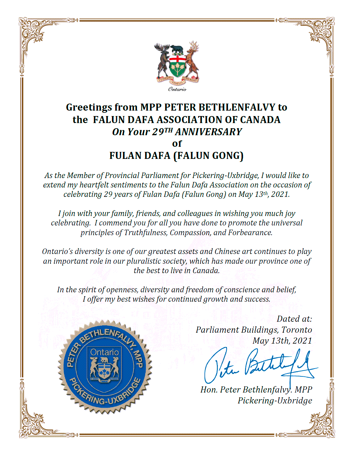 安省财政厅长彼得·贝思伦法维(Hon. Peter Bethlenfalvy)在贺信中写道:作为皮克布里奇市的省议会成员,我想在2021年5月13日庆祝法轮大法(法轮功)29周年之际向法轮大法学会表达我衷心的祝福。