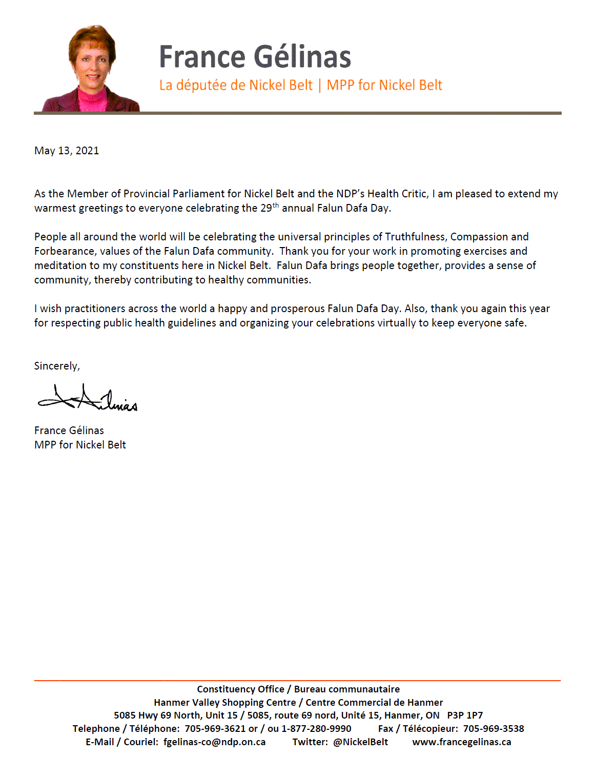 镍带区省议员姬莲娜丝(France Gélinas)在贺信中写:作为镍带省议会议员和新民主党健康评论家,我很高兴向所有庆祝第22届法轮大法日的人们致以最诚挚的问候。