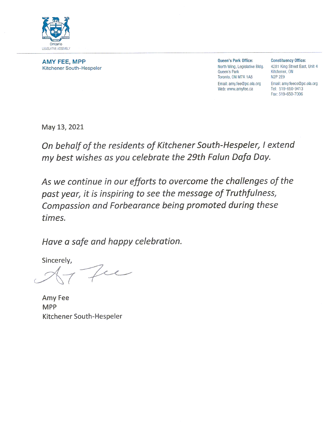 基奇纳·南·赫斯珀勒省议员艾米·费(Amy Fee)在贺信中说:在你们庆祝第22届法轮大法日之际,我谨代表基奇纳·南·赫斯珀勒尔居民向你们表示最良好的祝愿。