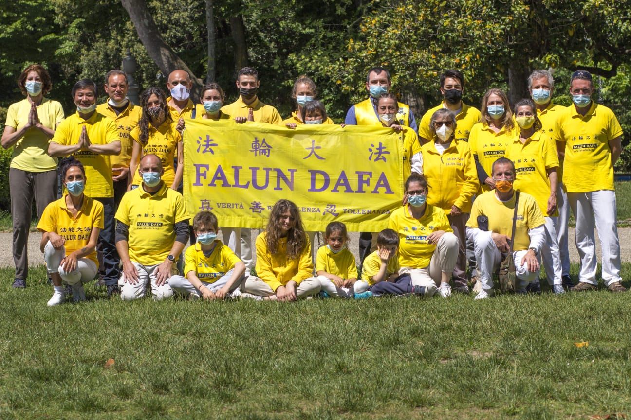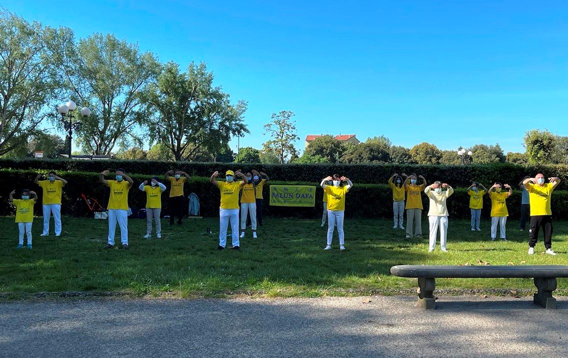 5月9日的天空格外晴朗,阳光灿烂,法轮功学员们身穿印有“法轮大法好”和“真善忍”的黄色T恤,来到佛罗伦萨市的城市公园(Parco delle Cascine)。在祥和的炼功音乐声中,学员们以集体炼功的方式,庆祝五一三世界法轮大法日,祝尊敬的师父生日快乐,并感恩师尊慈悲苦度!同时,他们向公园过往的游客展示法轮大法的美好,希望更多人有缘了解法轮大法并从中受益。